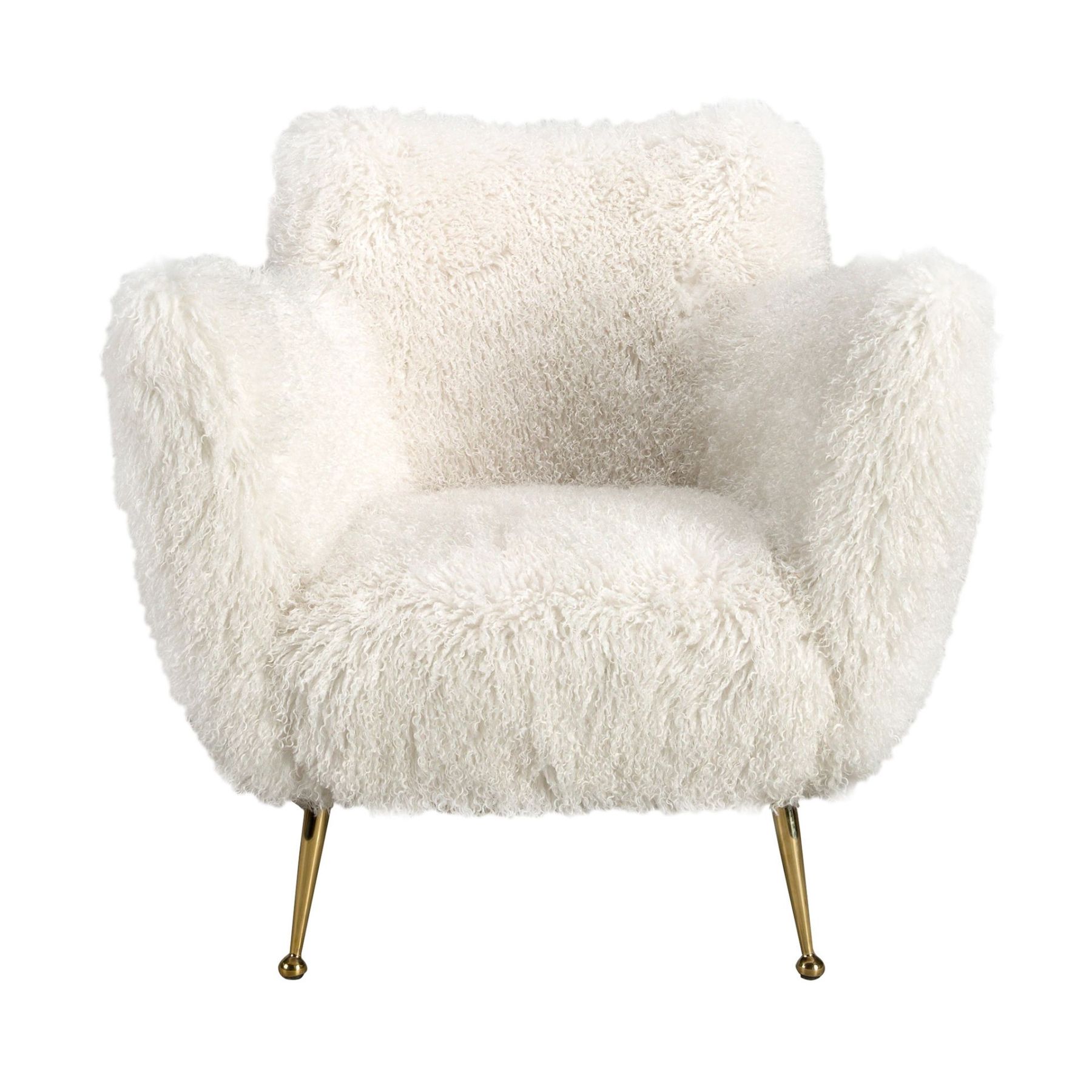 Кресло с подлокотниками современного дизайна, сиденье и спинка обиты белой синтетической тканью с длинным ворсом. Это кресло — идеальное сочетание дизайна и комфорта, как благодаря своему стилю, так и ножкам из хромированной нержавеющей стали золотистого цвета.