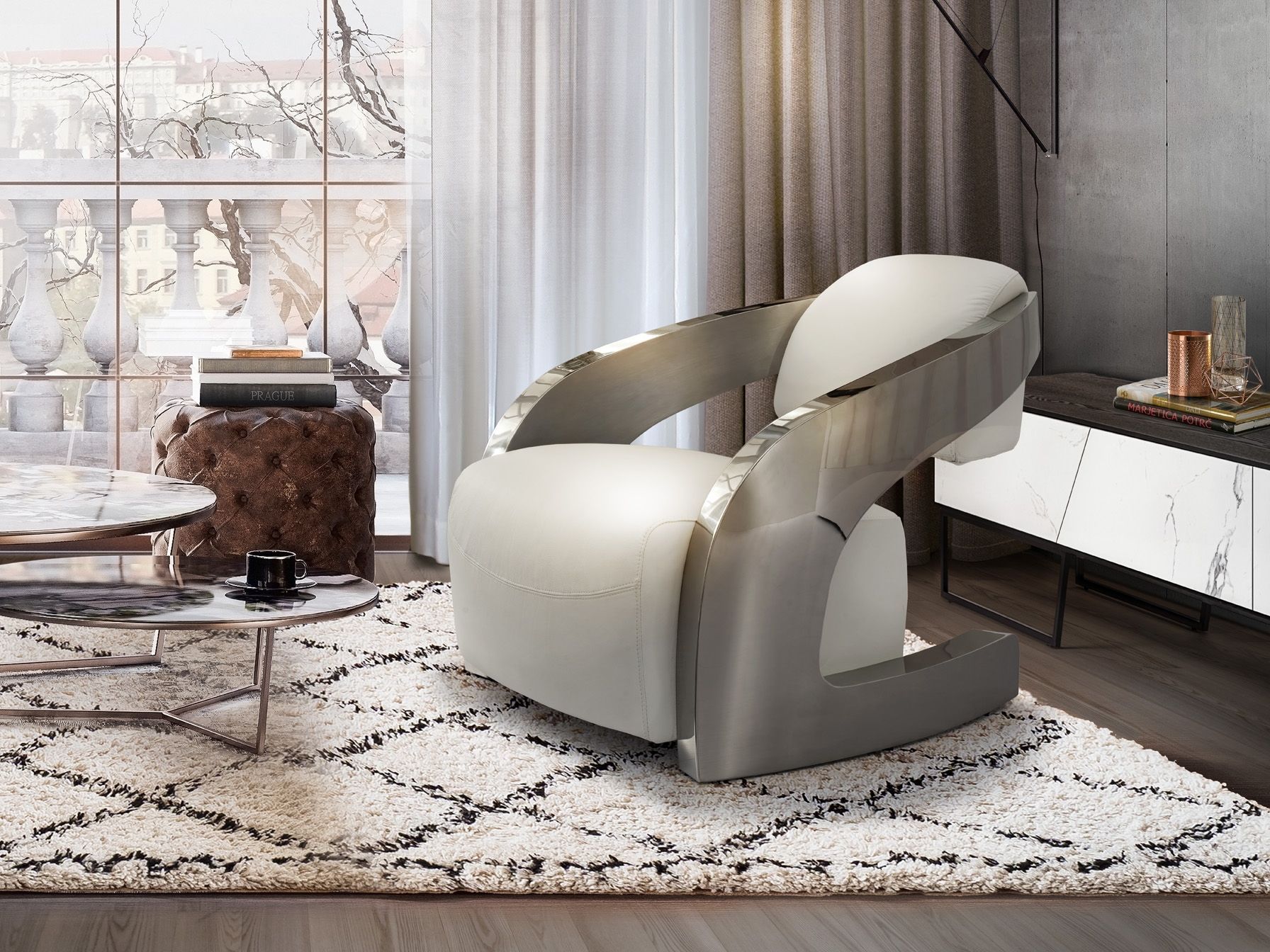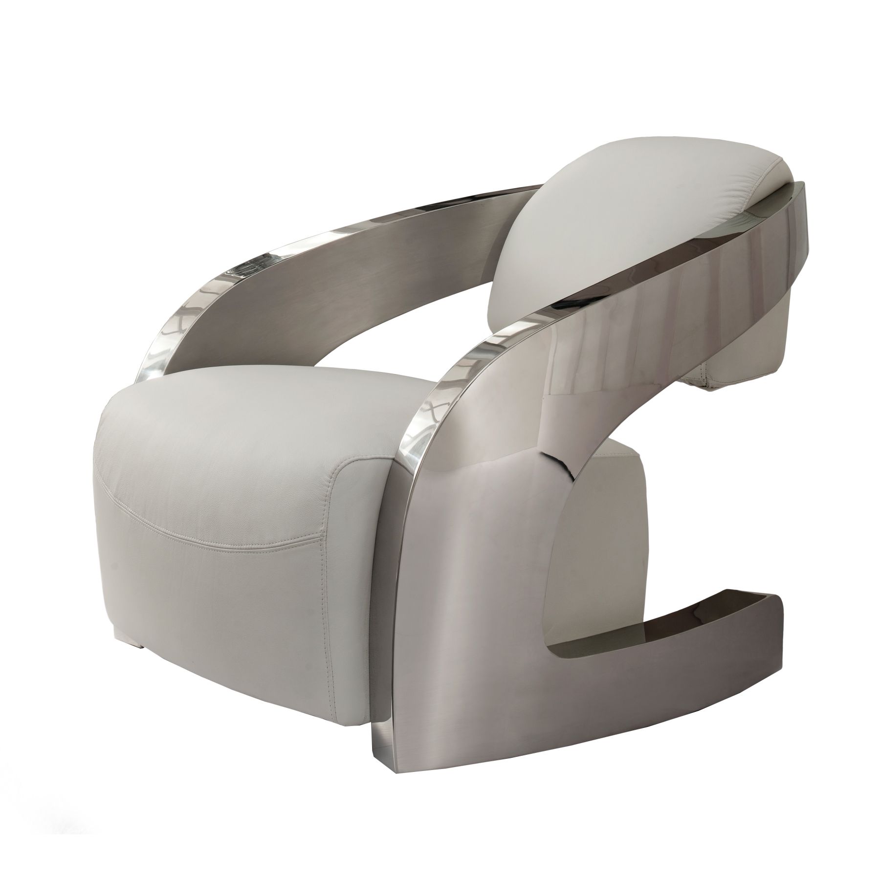 Кресло с обивкой из итальянской кожи белого цвета, отстроченной нитью белого цвета, каркас из полированной нержавеющей стали, проверенное удобство.