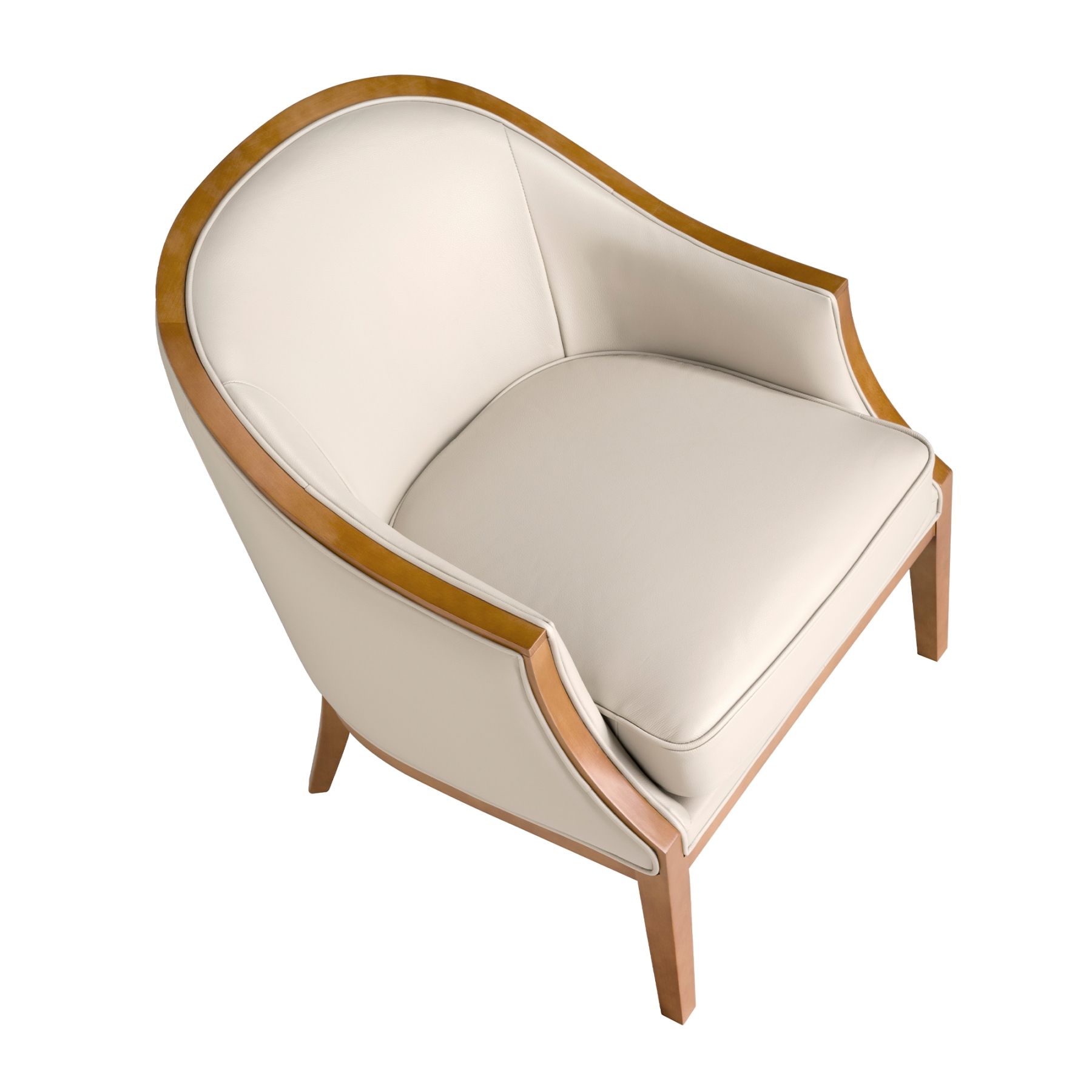 Кресло современного дизайна с сиденьем и спинкой, обитыми серой воловьей кожей. Это кресло представляет собой идеальное сочетание дизайна и комфорта, как благодаря своему стилю, так и благодаря деревянным ножкам медового цвета.