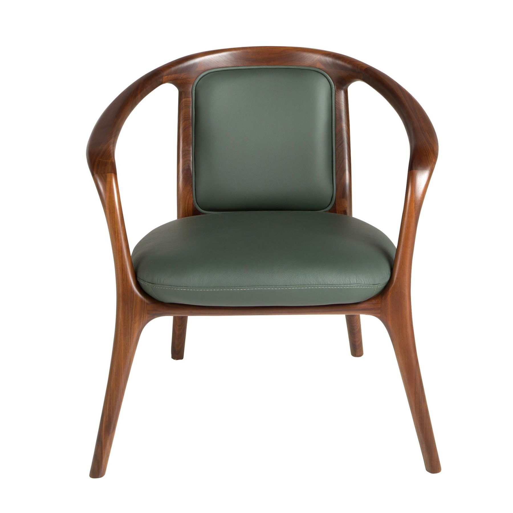 Современное дизайнерское кресло с подлокотниками, сиденьем и спинкой, обитыми темно-зеленой искусственной кожей. Благодаря своему стилю и деревянным ножкам цвета ореха, это кресло представляет собой идеальное сочетание дизайна и комфорта.
