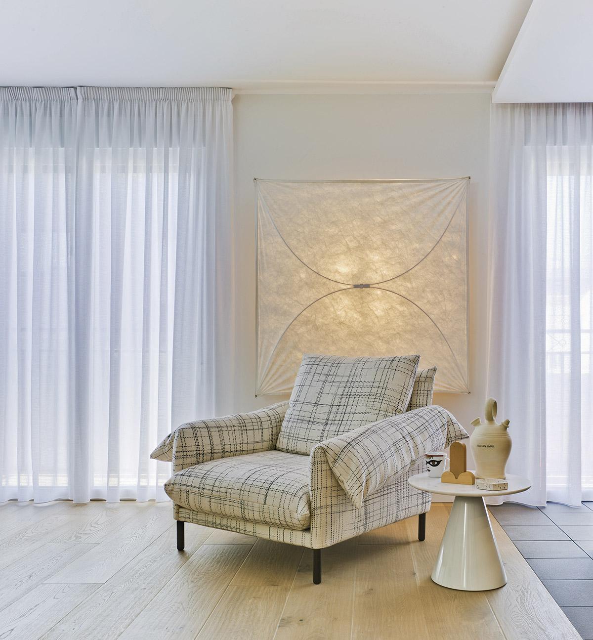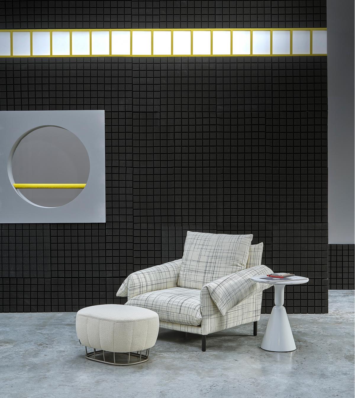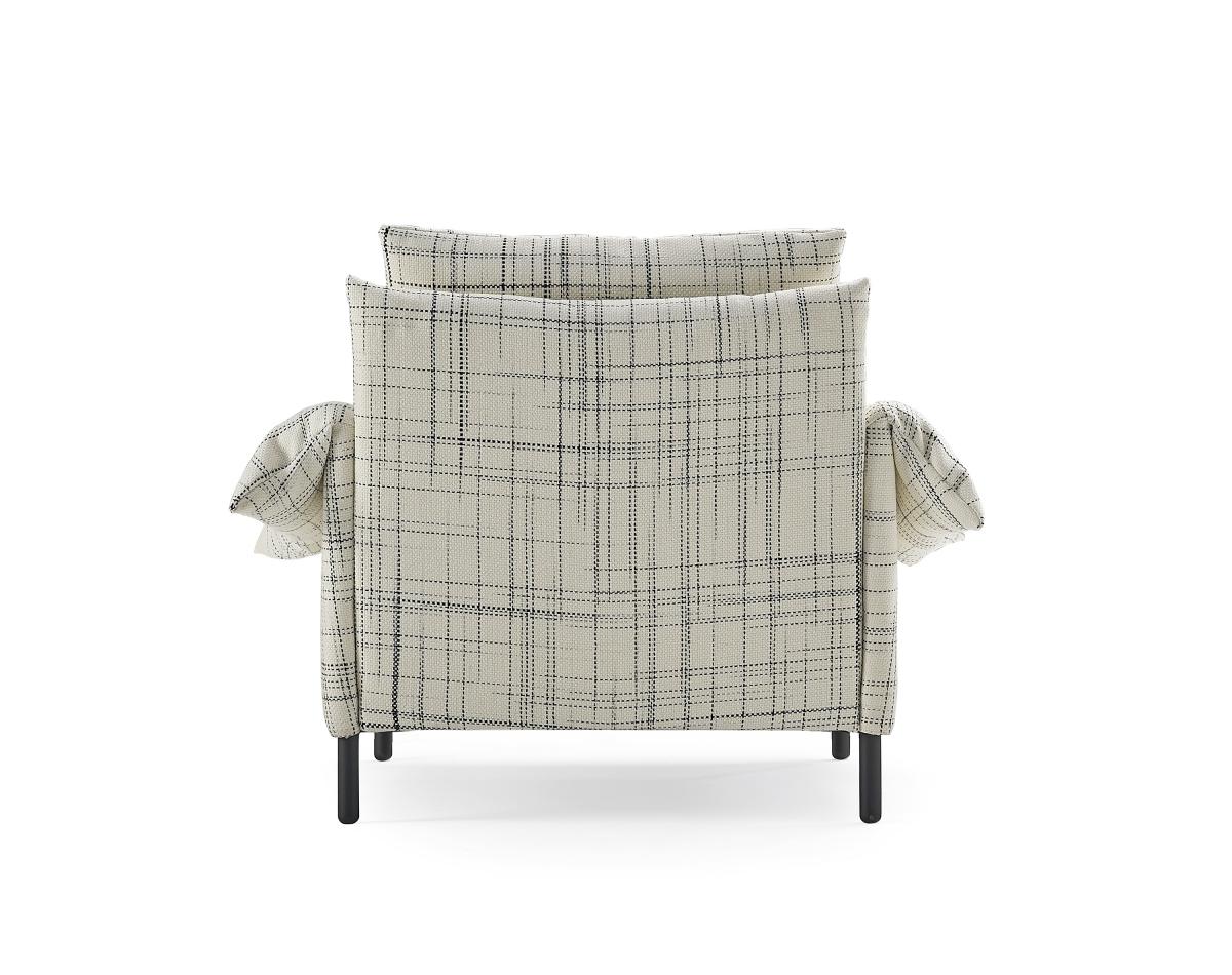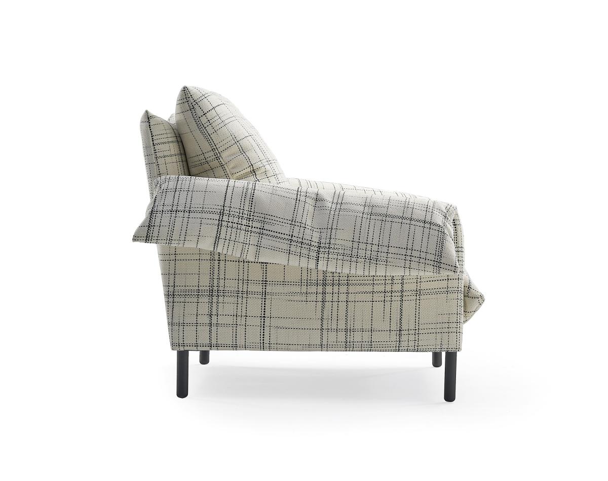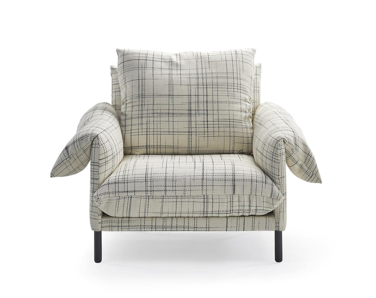 Безмятежный и простой дизайн, не без конструктивной сложности благодаря уникальной форме подлокотников и мягким, но прочным спинкам. Съемные тканевые или кожаные чехлы. Внутренняя структура: стальные трубы с эпоксидным покрытием. Подлокотники и спинка: деревянные, МДФ и ДСП, приспособленная структура с пеной различной плотности. Ножки: черная лакированная сталь F1 или массив дуба.