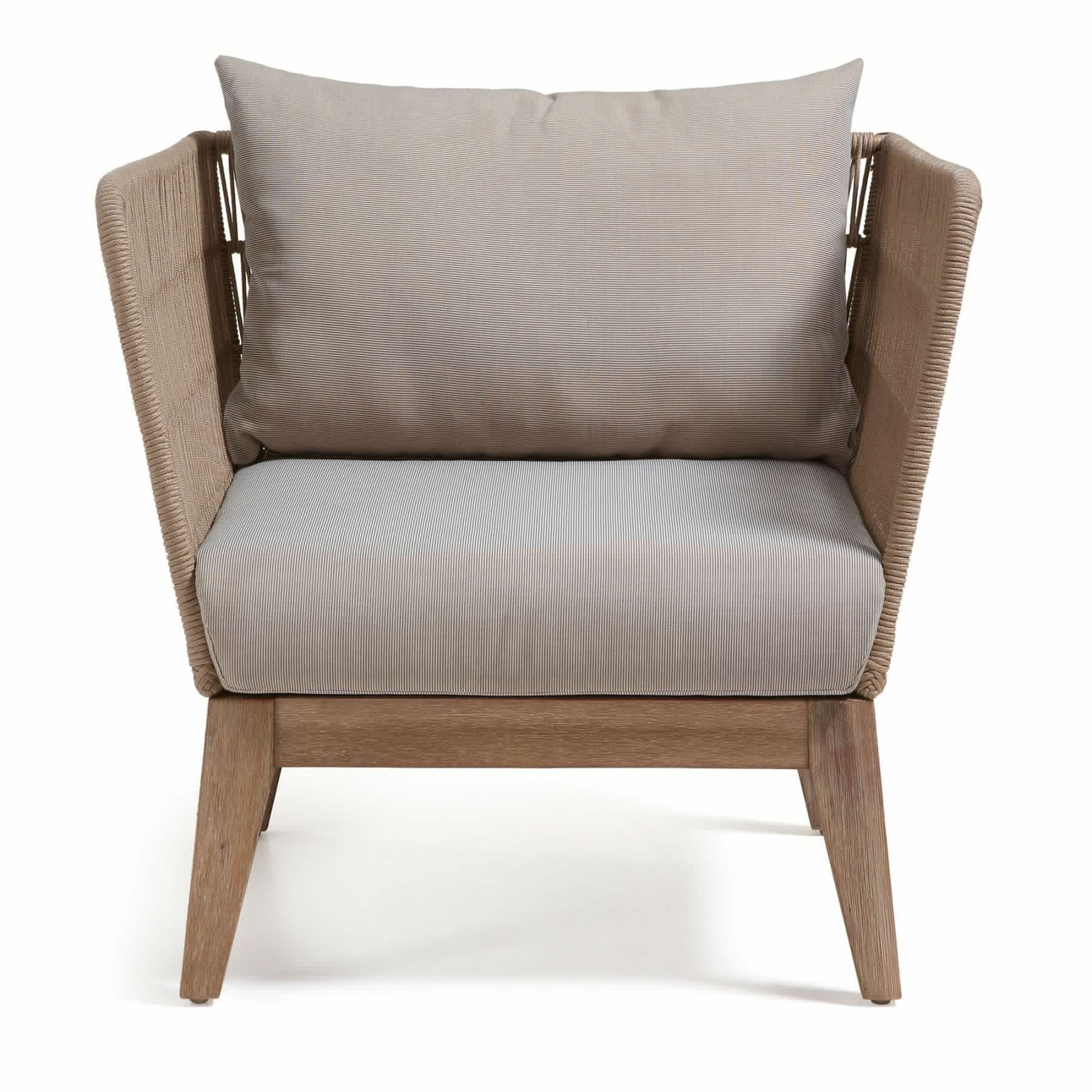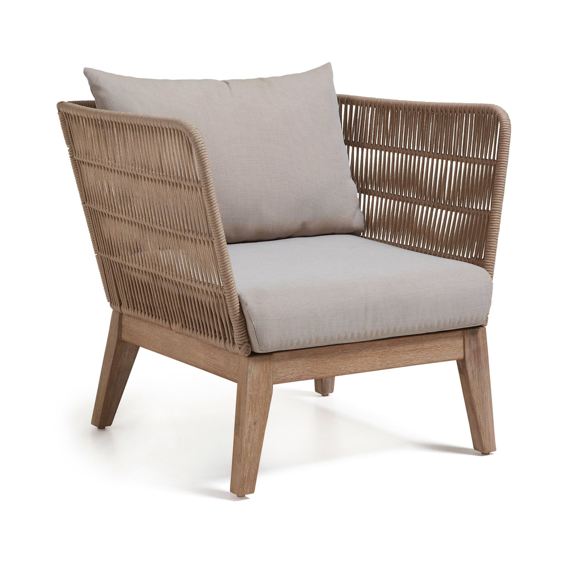 Кресло Bellano от фабрики La Forma (ex Julia Grup) – приблизьтесь к природе с максимальным комфортом. Кресло Bellano – это уникальные тона и зерна эвкалиптового дерева, ручное плетение и обволакивающая мягкость. Погрузившись в него однажды, вы уже не сможете променять его на другое уличное кресло. Максимальное расслабление и полное освобождение от стресса – миссия этого изделия. А защитные покрытия от влаги – причина не переживать за долговечность этой мебели. Кресло состоит из проволочного каркаса, обмотанного канатом, и опоры, выполненной из массива эвкалиптового дерева. Используемый канат бежевого цвета. Он покрыт специальной пропиткой, защищающей нити от вредного воздействия ультрафиолета и влаги. Деревянная опора натурального цвета с защитным лаковым покрытием (4 слоя). Ее ножки высотой 38 см оснащены специальными наконечниками, которые улучшают устойчивость на неровной поверхности. Кресло поставляется с двумя подушками. Их высота – 10 см. Полиэстеровые чехлы съемные, с водонепроницаемой пропиткой. Максимальная весовая нагрузка на изделие – 130 кг. Размеры: ширина – 86 см, высота – 70 см, глубина – 80 см, глубина сиденья – 50 см. Вес – 13.9 кг. Потребуется небольшая сборка.