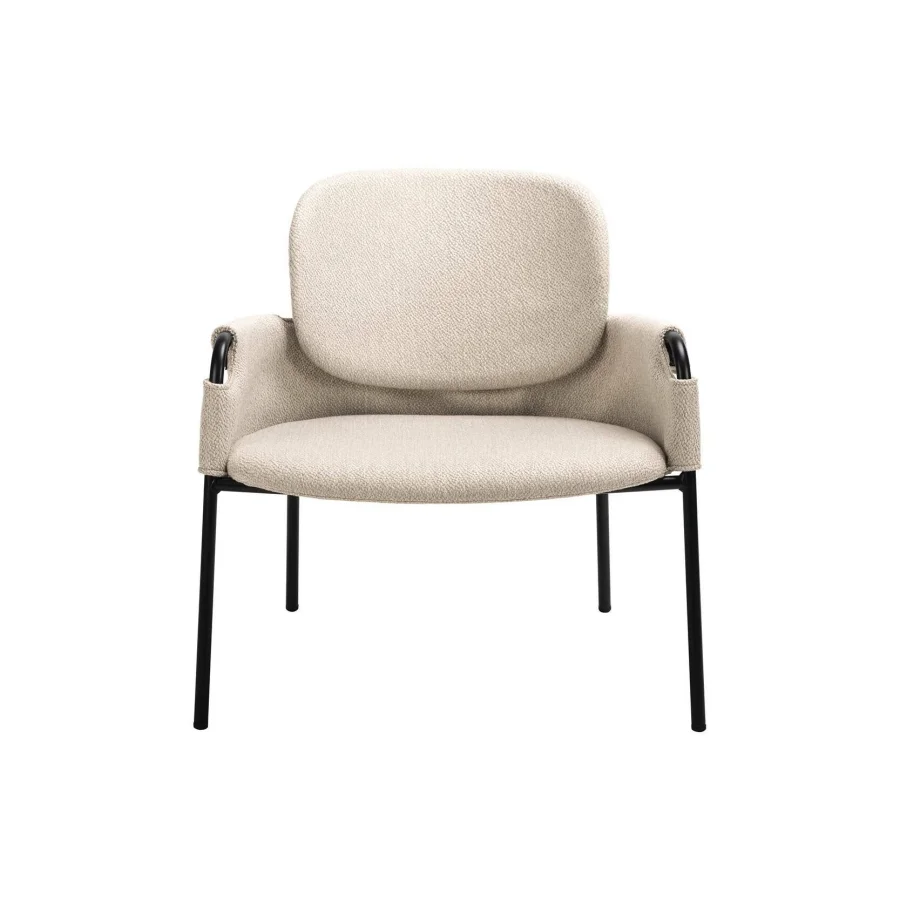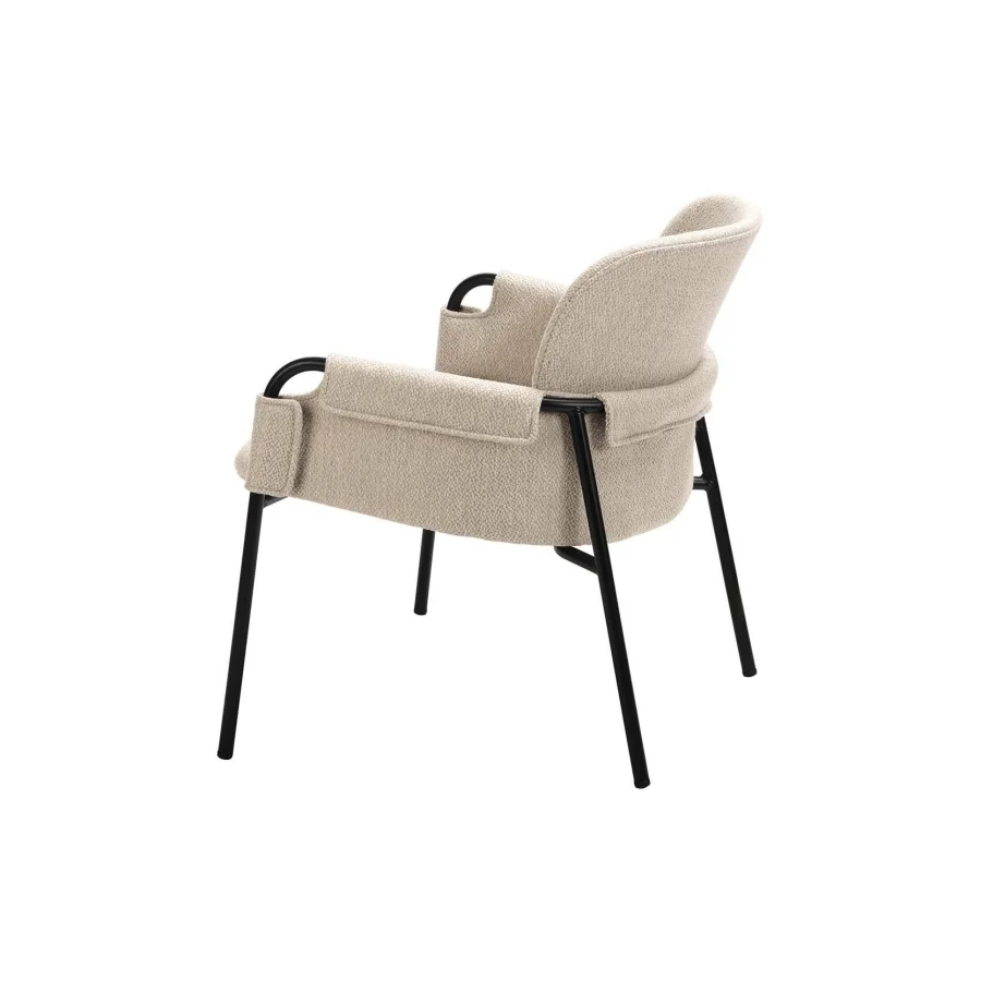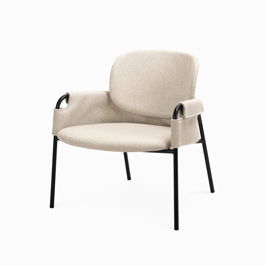 Его особенностью является оригинальный металлический каркас чёрного цвета, образующий основу сиденья и подлокотников, создавая лёгкий и воздушный силуэт. Мягкие элементы кресла — сиденье, спинка и подлокотники — обтянуты фактурной тканью в нейтральных оттенках.