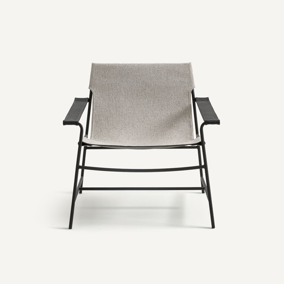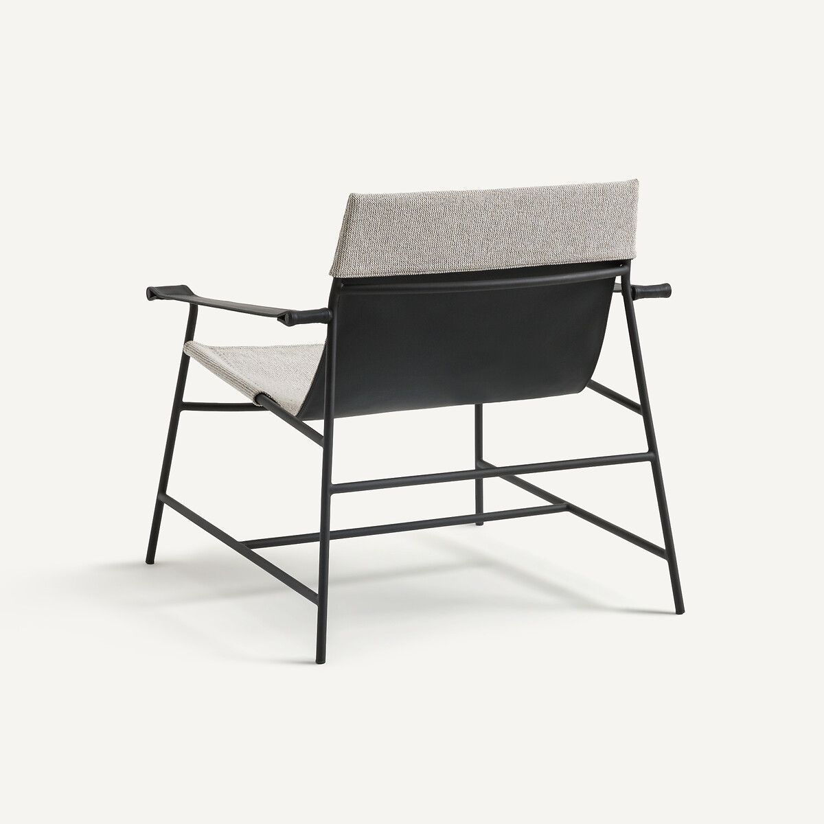 Воздушная конструкция из черного металла обита тканью меланж спереди и черной кожей сзади и на подлокотниках. Игра контрастов, объединяющая графичность с теплыми материалами. Эксклюзивное творение AMPM.