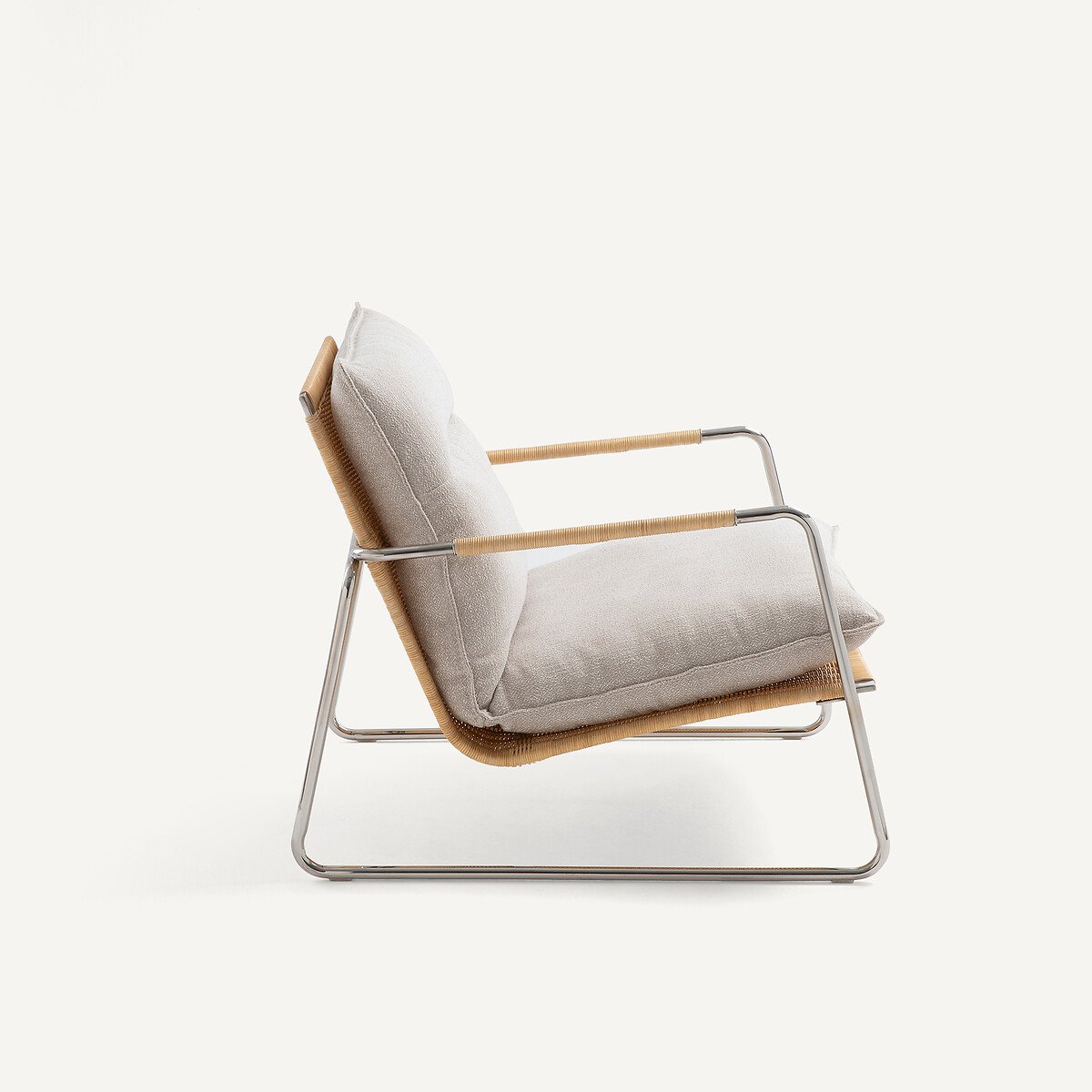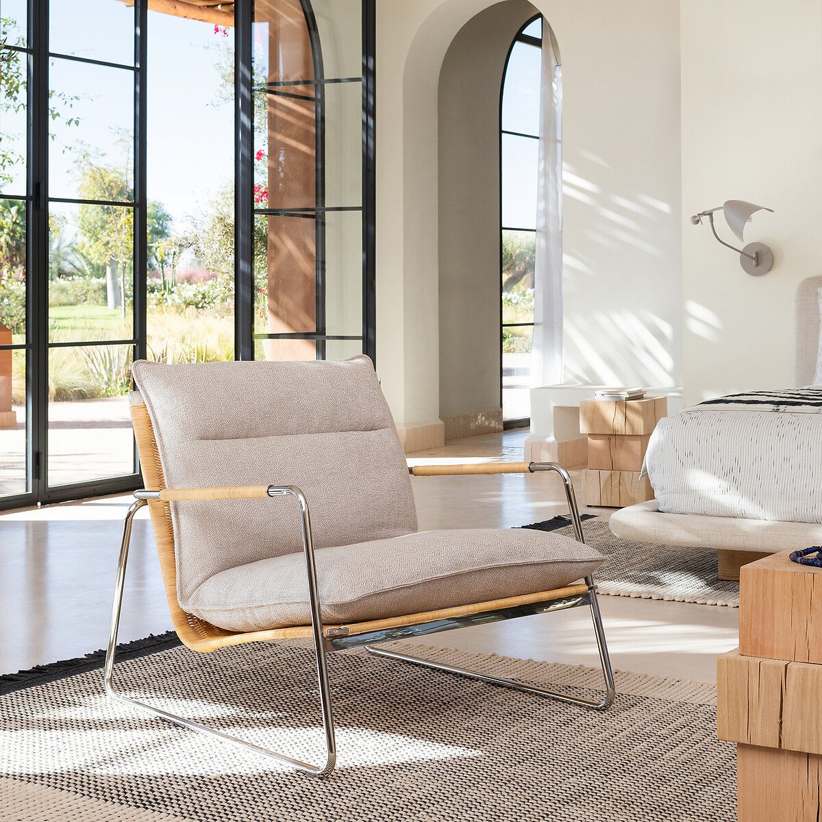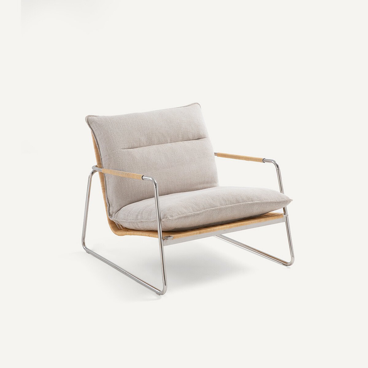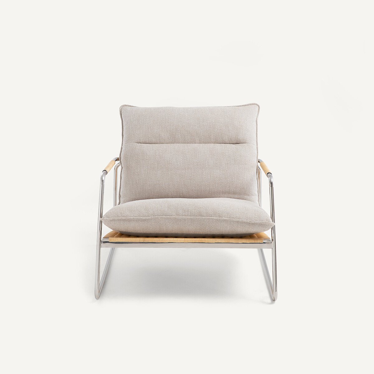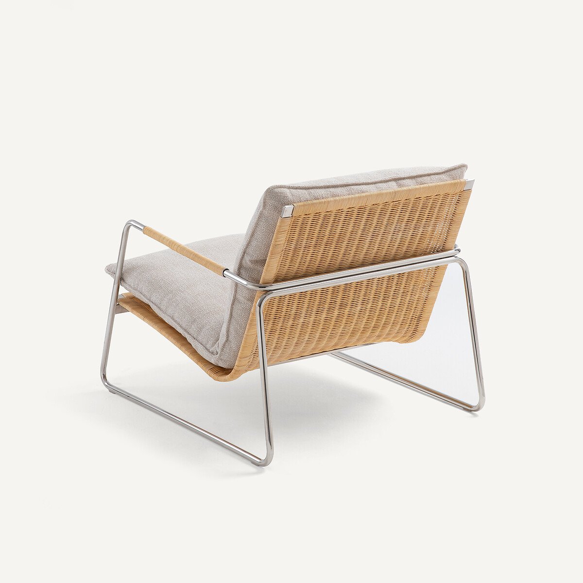 Тонкий трубчатый каркас придает этому креслу легкость и элегантность. Натуральное ротанговое плетение уравновешивает графическую современность хромированной стали.Кресло со сдержанными линиями и внушительными размерами, согретое подушкой с неброской текстурой и отделкой. Творение AMPM. Жесткость спинки: низкаяЖесткость сиденья: низкаяПоддержка: средняяОписание • Чехол для подушки «все в одном» (сиденье и спинка) из меланжевой ткани, 100% хлопок, плотность 570 г/м² • Съемная подушка с отделкой кантом • Ткань с противоскользящим покрытием на обороте подушки (для сиденья) • Сиденье, спинка и декоративные элементы на подлокотниках из плетеного ротанга • Каркас из трубчатой нержавеющей стали с хромированной отделкой • Накладки на ножки из полипропиленаНаполнитель • Многофункциональная подушка: пенополиуретан 25 кг/м³, покрытие из полиэфирных волоконУход • Подушка все в одном со съемным чехлом • ХимчисткаКачество • Гарантия 2 года: обивка и пеноматериалРазмеры • Ширина: 87,5 см • Высота: 77 см • Глубина: 84 см • Сиденье: Д71 x В30 x Г60 см • Продается в собранном виде.Размеры и вес упаковкиОдна упаковка • Ш90 x В74 x Д87 см, 21,5 кг