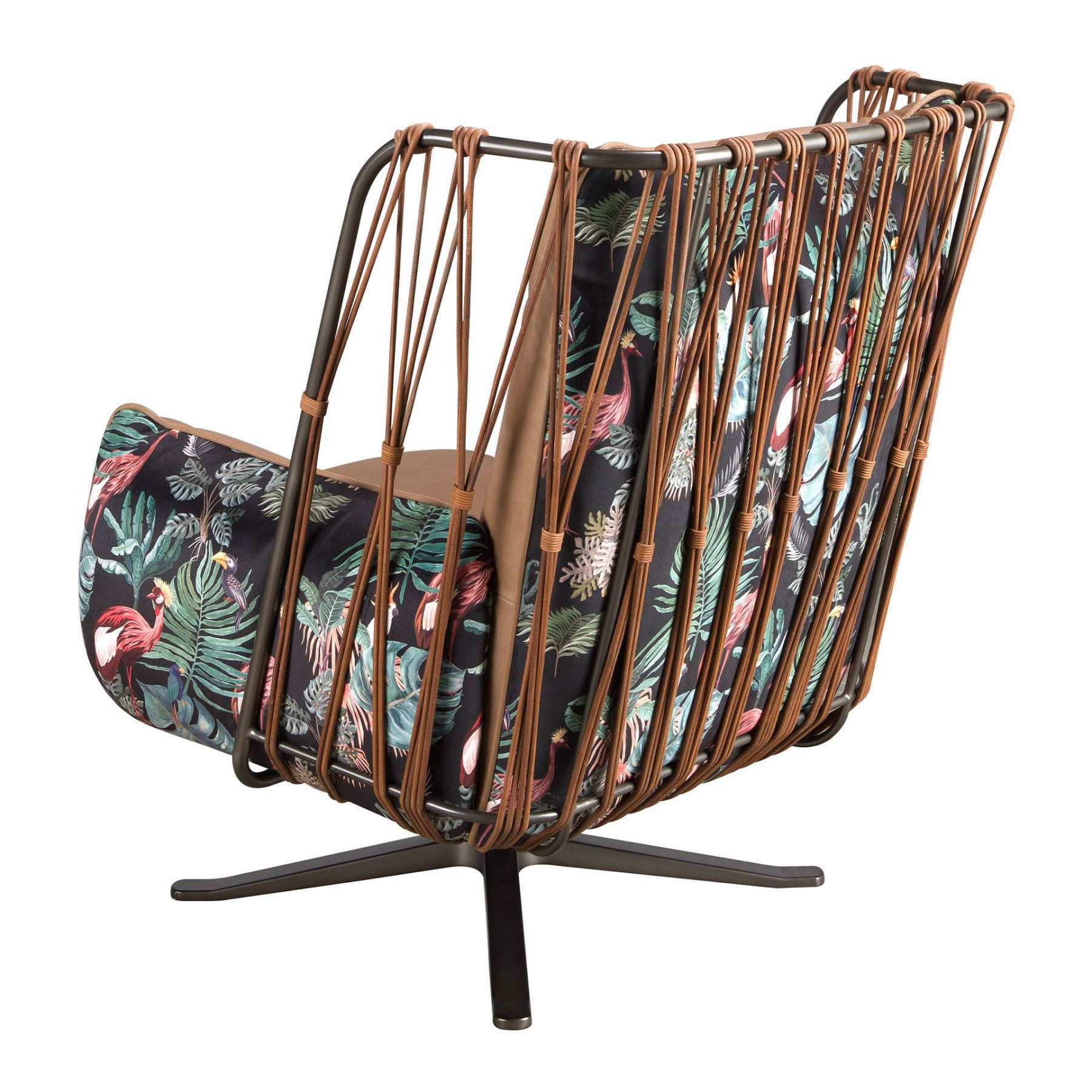Вращающееся кресло с подлокотниками современного дизайна с сиденьем, обитым воловьей кожей, и спинкой, обитой тканью с тропическими мотивами коричневого цвета. И его стиль, и его затемненные ножки из нержавеющей стали делают это вращающееся кресло идеальным сочетанием дизайна и комфорта.