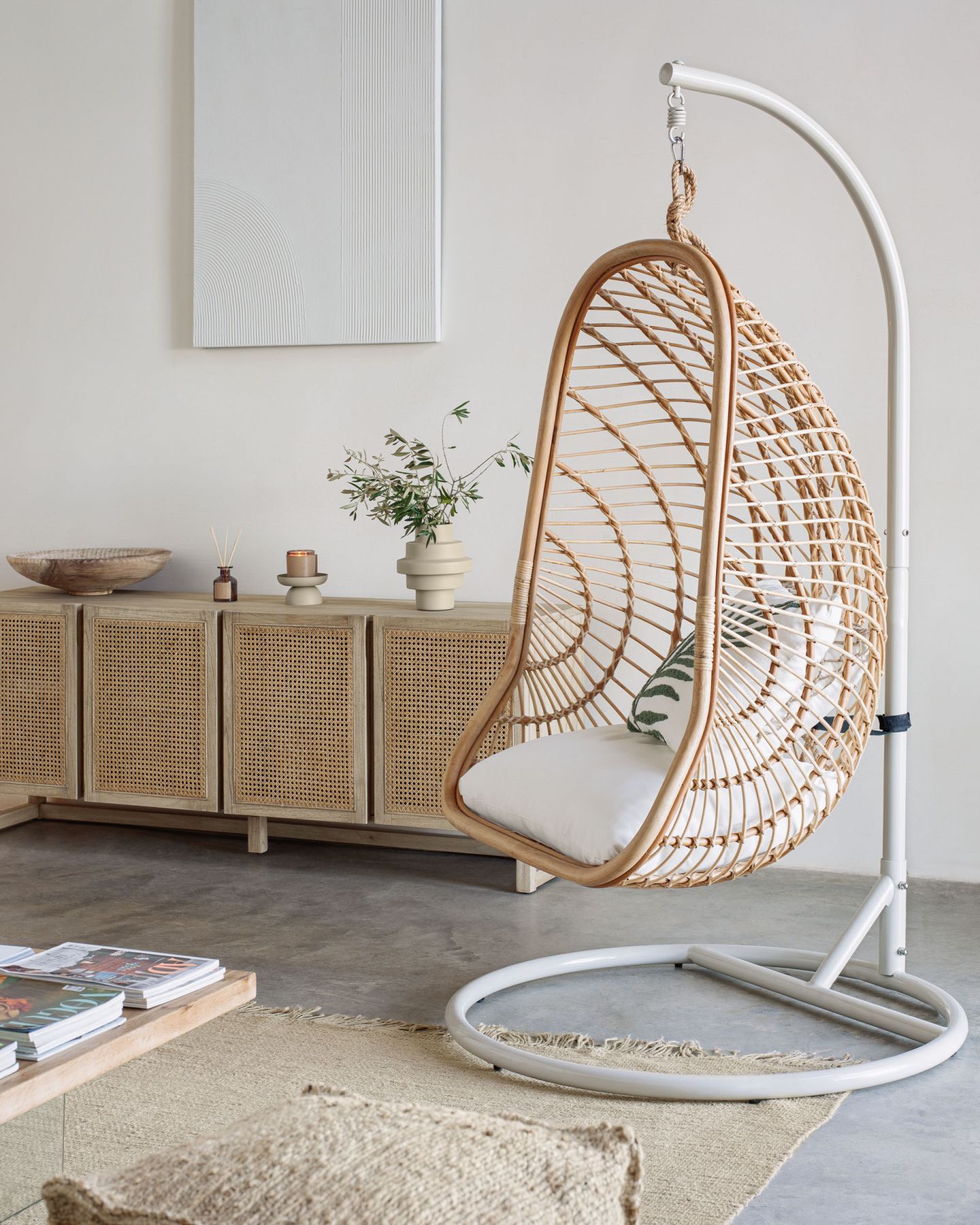 Подвесное кресло сплетено вручную из ротанга и веревки бежевого цвета. Оно цельное и не требует сборки. Веревка из полиэстера. Она прочная и износостойкая, не выгорает на солнце, не портится от влаги. Диаметр каркасной трубы – 3 см.
