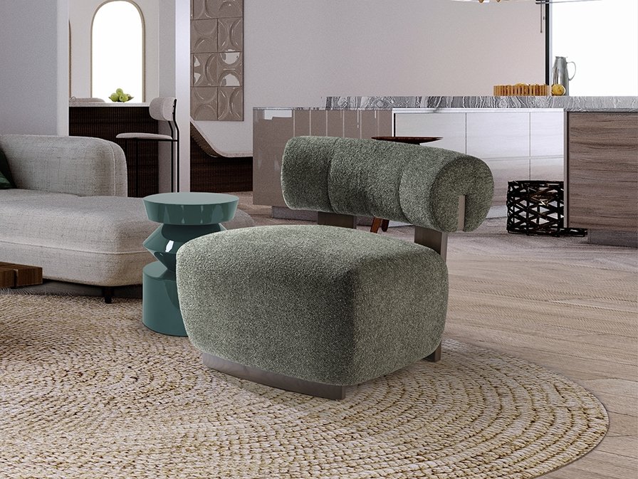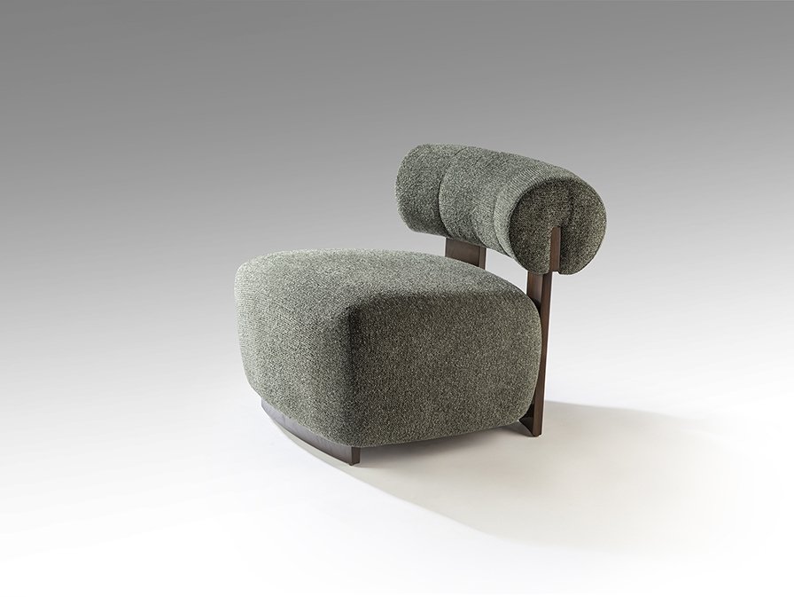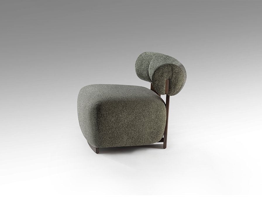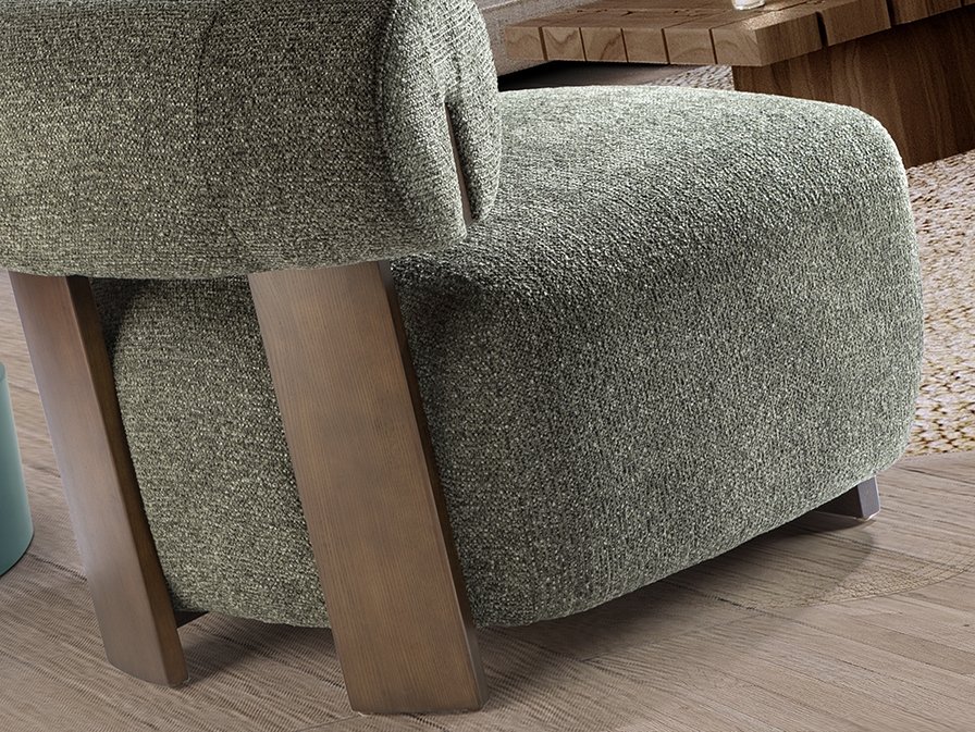 Кресло из дерева, отделанного под орех, обито пестрым зеленым шениллом.