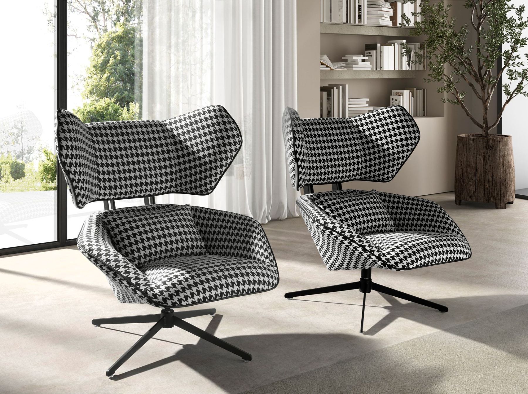 Вращающееся кресло с подлокотниками в современном дизайне с сиденьем и спинкой, обитыми черной и белой тканью . Как по своему стилю, так и по своим ножкам из нержавеющей стали, окрашенным черной эпоксидной краской , это вращающееся кресло представляет собой идеальное сочетание дизайна и комфорта.