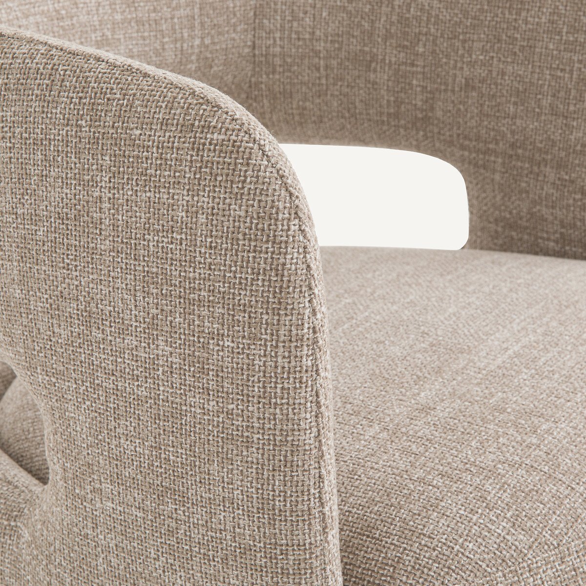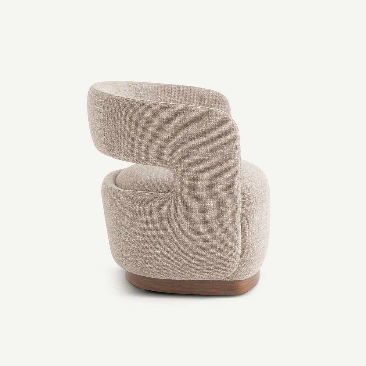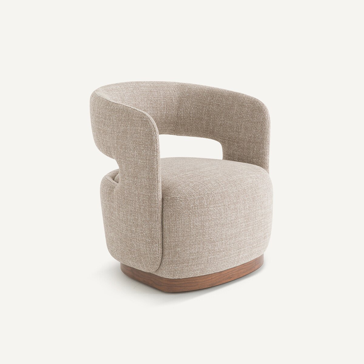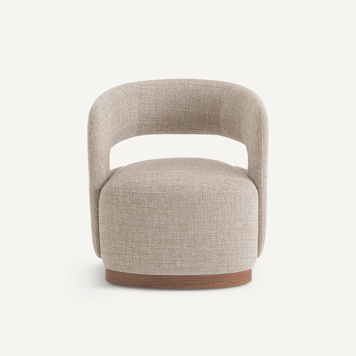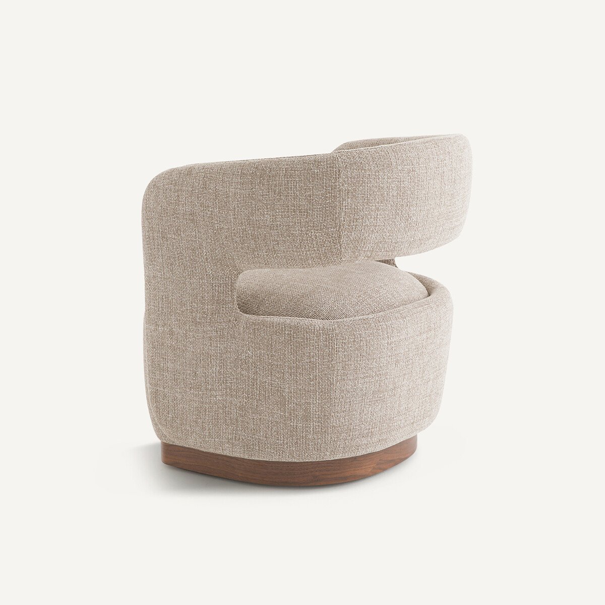 Сиденье и низкая спинка, создающие ощущение уюта, обтянуты меланжевой тканью, которую подчеркивает основание со шпоном ореха. Изящная спинка контрастирует с пышной обивкой сиденья. Творение AMPM.