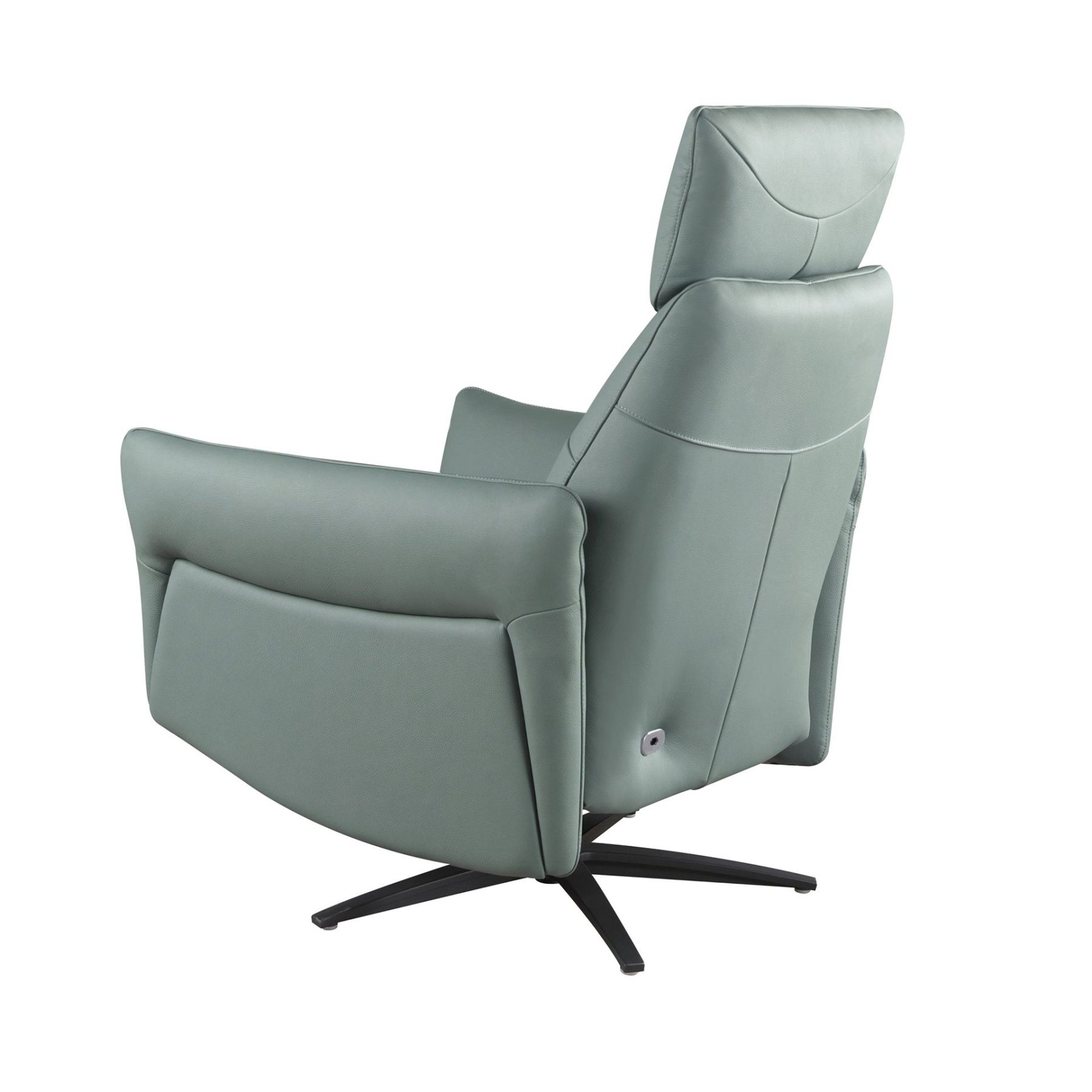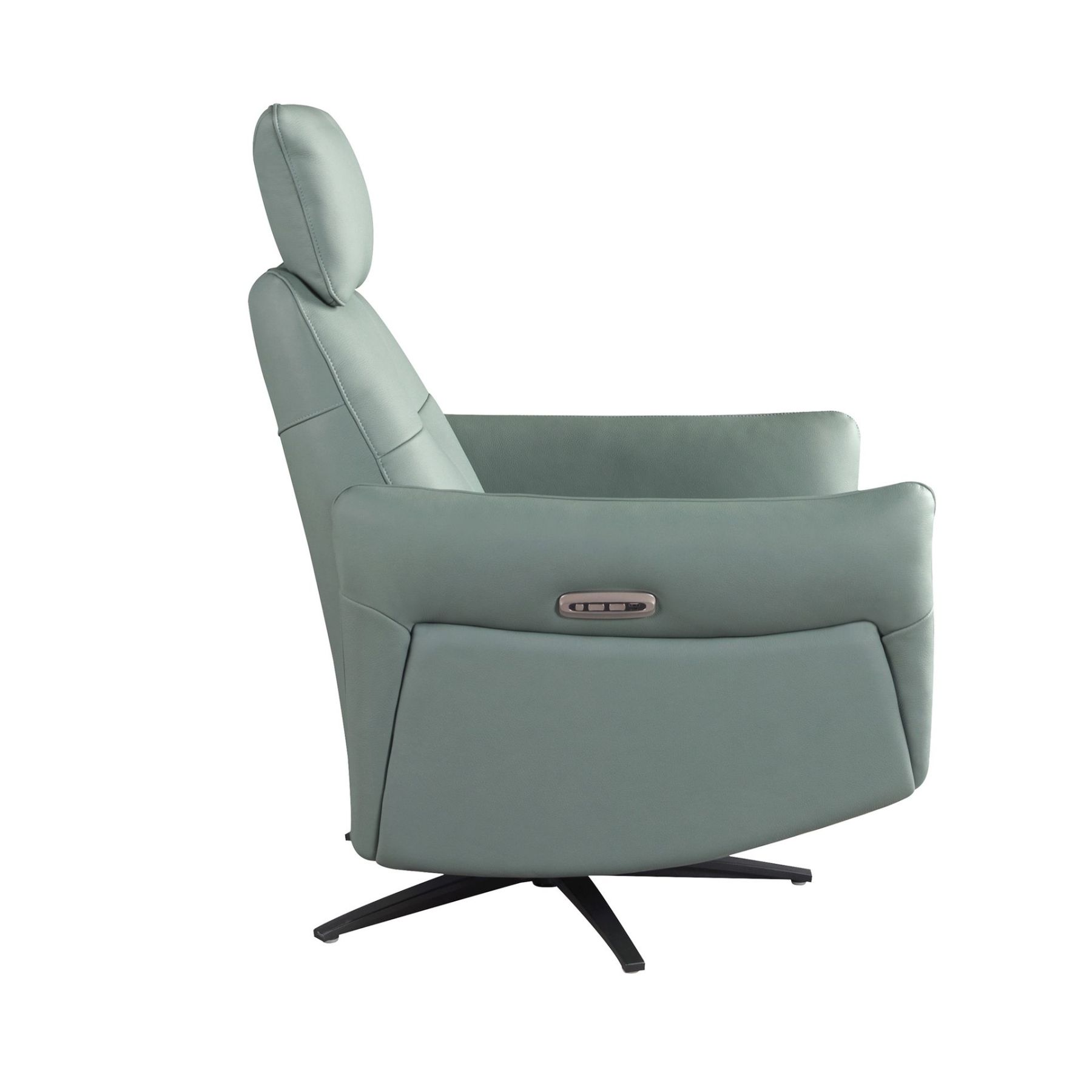 Вращающееся кресло для отдыха с подлокотниками современного дизайна, сиденье и спинка обиты бирюзово-зелёной воловьей кожей. Благодаря своему стилю и ножкам из нержавеющей стали с чёрным эпоксидным покрытием это вращающееся кресло для отдыха с электрическим механизмом отдыха идеально сочетает в себе стиль и комфорт.