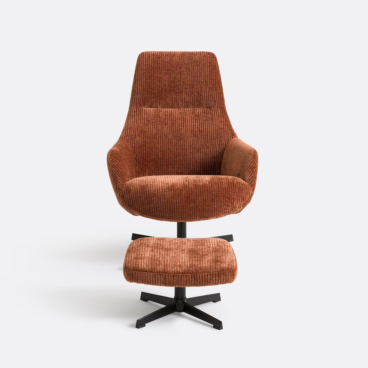 Вращающееся кресло Roye выделяется своим просторным силуэтом и вельветовой обивкой. Мягкое и очень удобное, оно поставляется в комплекте с подставкой для ног, которую можно использовать в качестве дополнительного сиденья. Все, что вам нужно сделать: откинуться на спинку кресла и расслабиться.