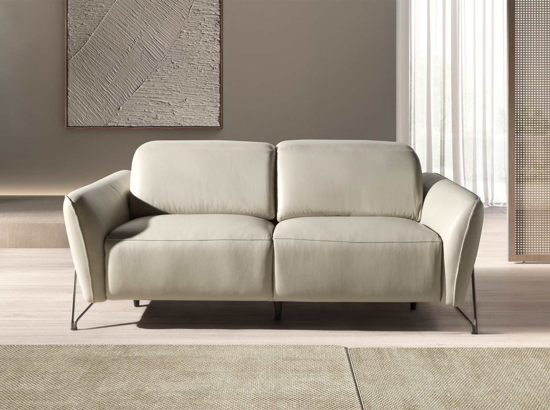 2-местный диван для релаксации с современным дизайном, обитый песочного цвета воловьей кожей с подголовником для большего комфорта. Как своим стилем, так и своими ножками из темной нержавеющей стали , этот диван привнесет нотку авангарда и элегантности, которую вы ищете в своем доме.