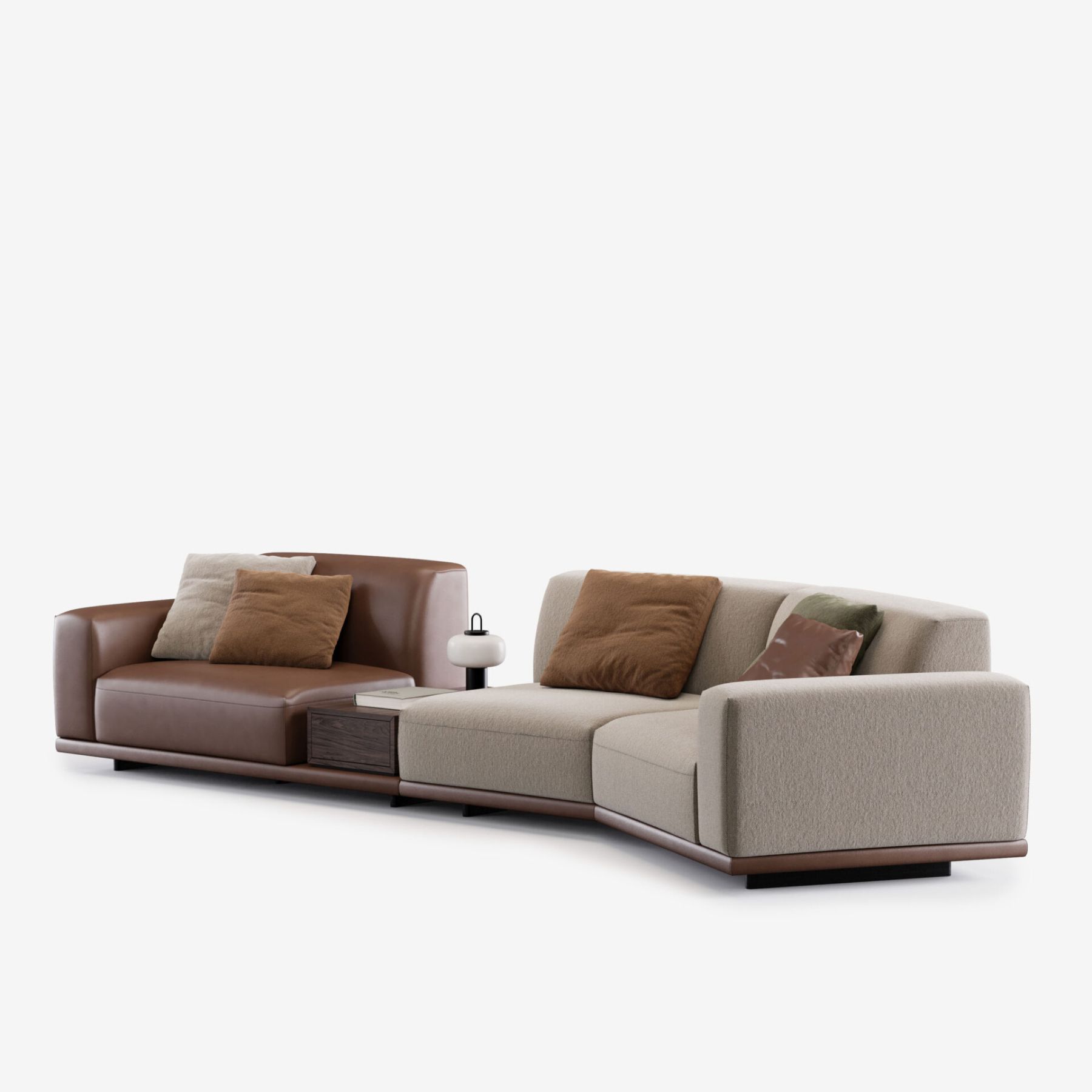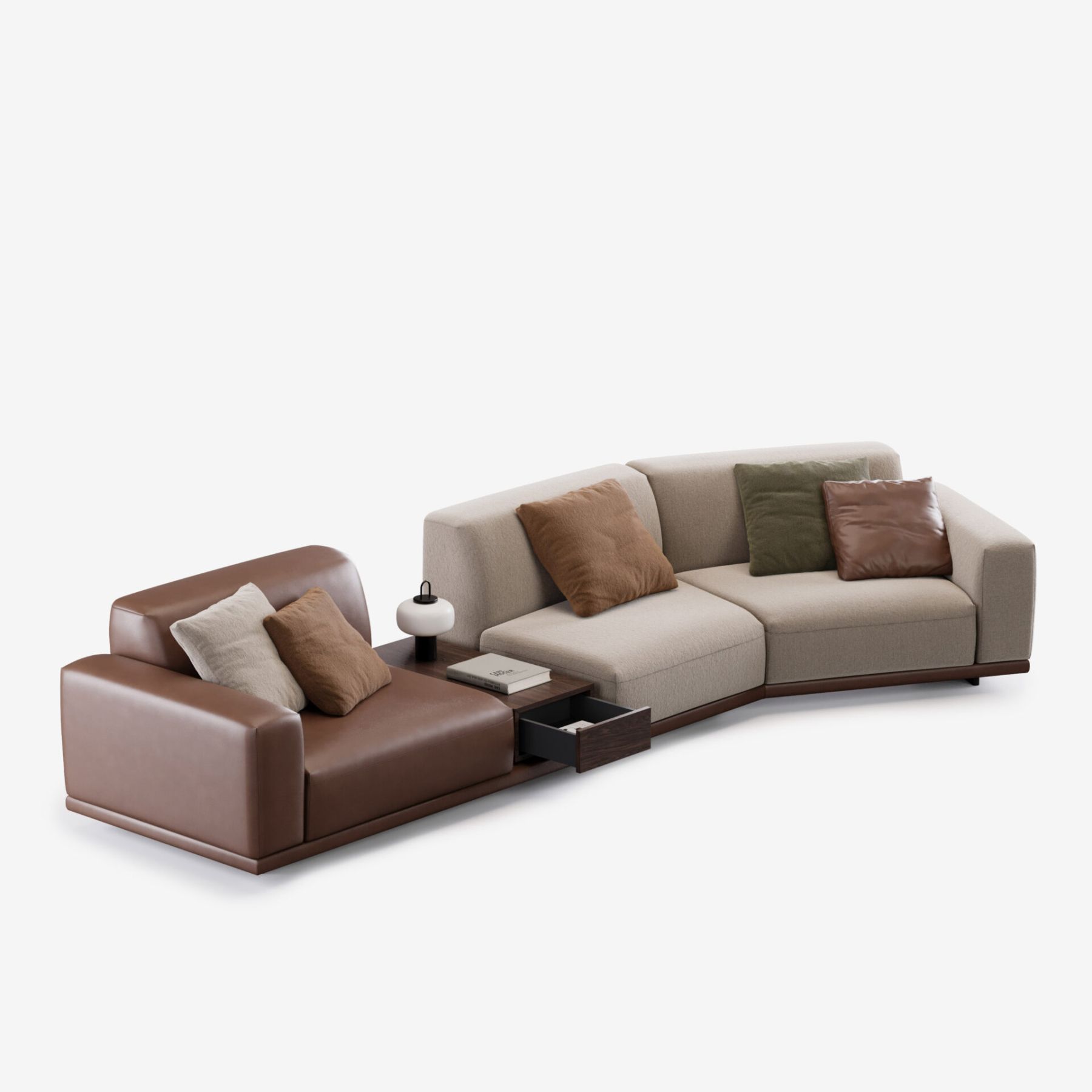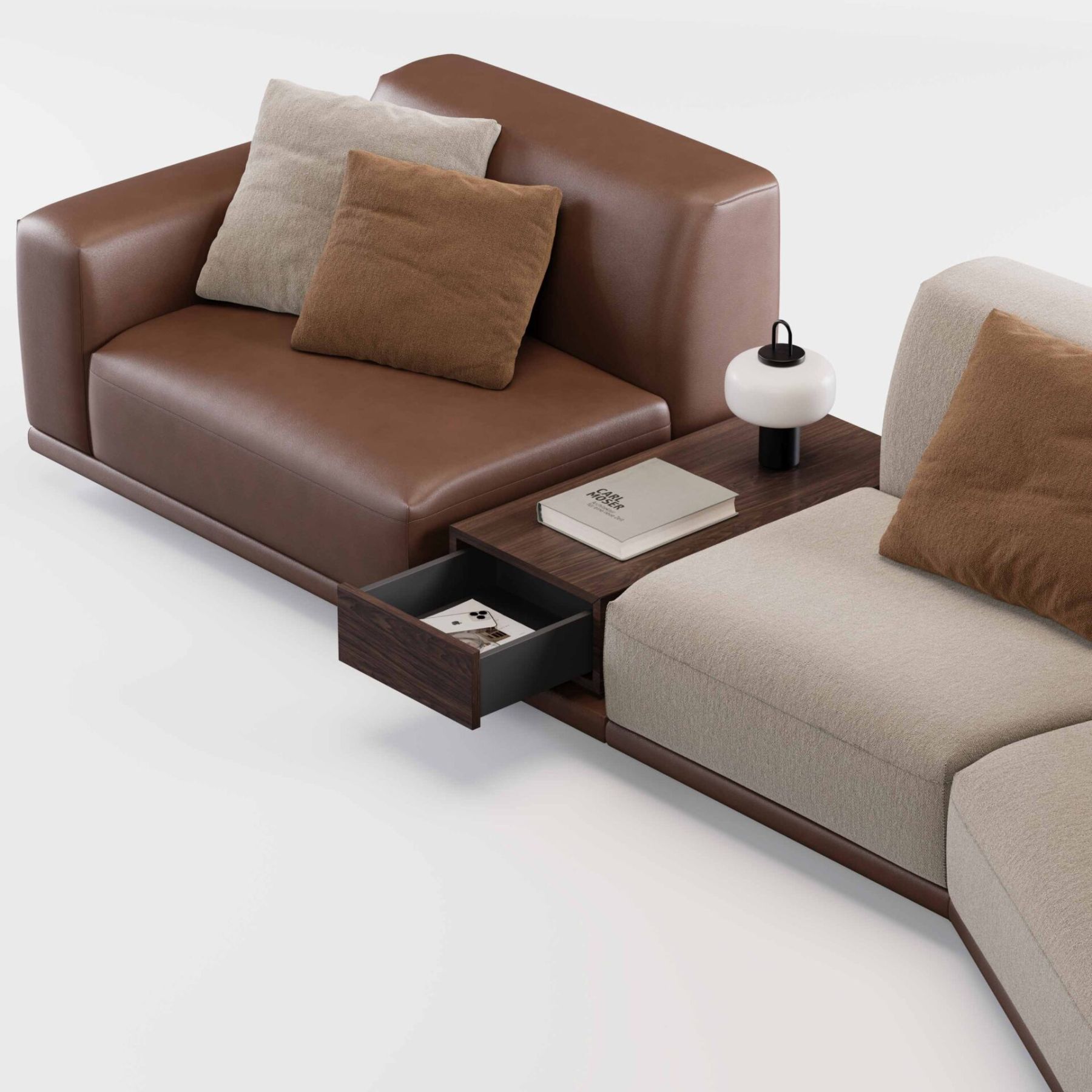 Все модули самостоятельны — их можно комбинировать или использовать по отдельности, создавая именно ту среду, которая вам нужна. Коллекцию дополняют кресла, повторяющие ее пластику, и многофункциональные пуфы-столики с отделкой из шпона дуба. Диван можно персонализировать практичными элементами: подлокотниками, подставками, боковыми столиками и ящиками для хранения, которые легко объединяются с основными модулями.