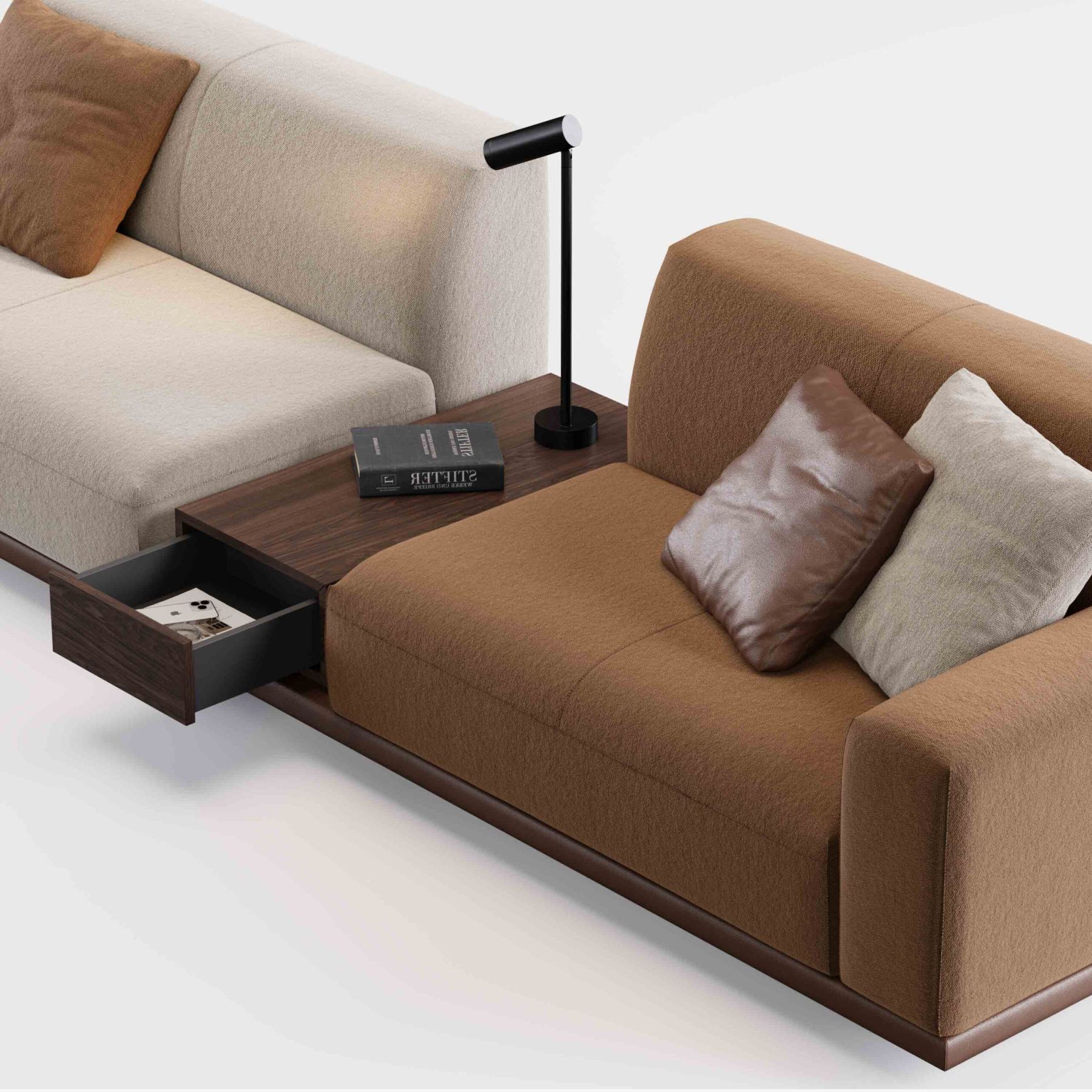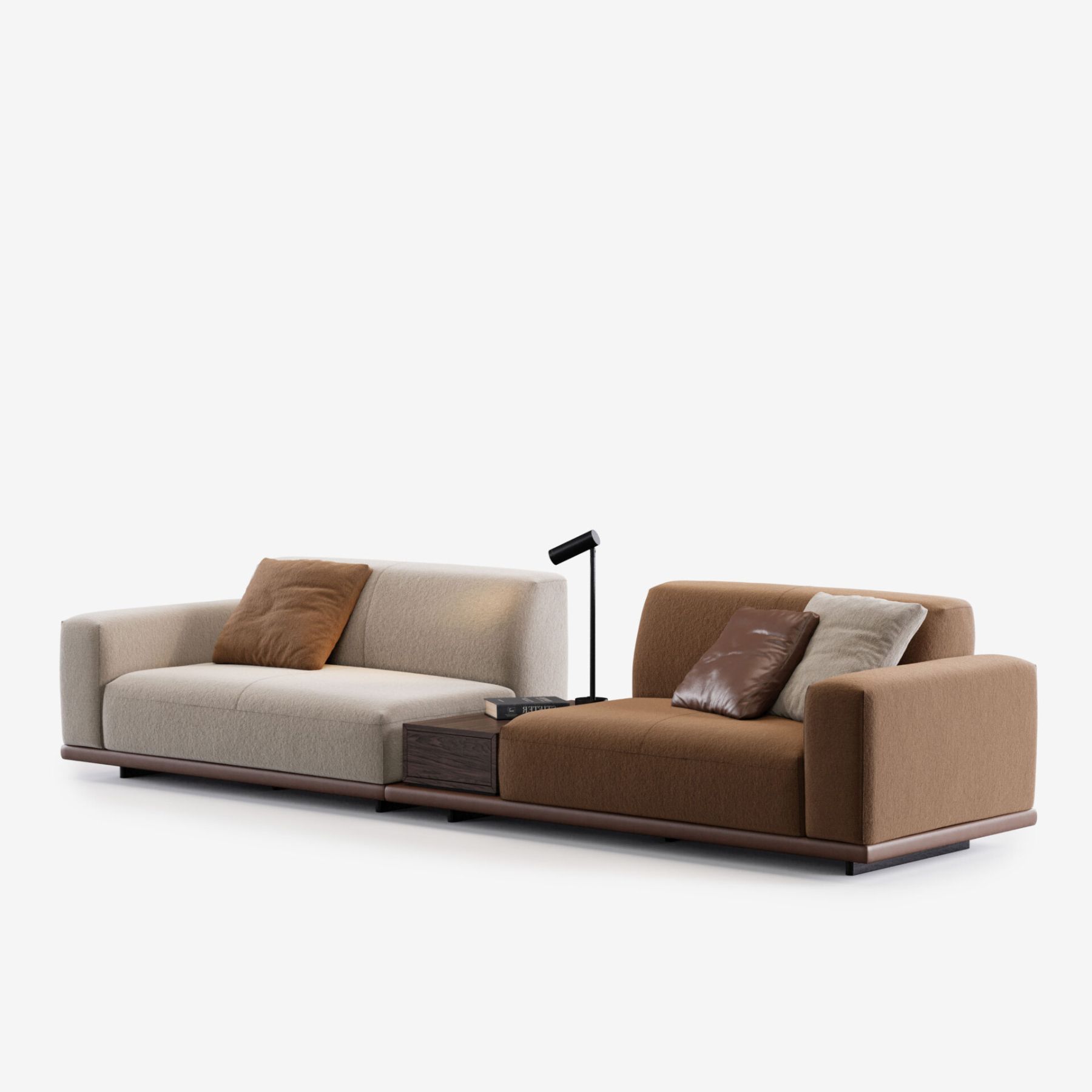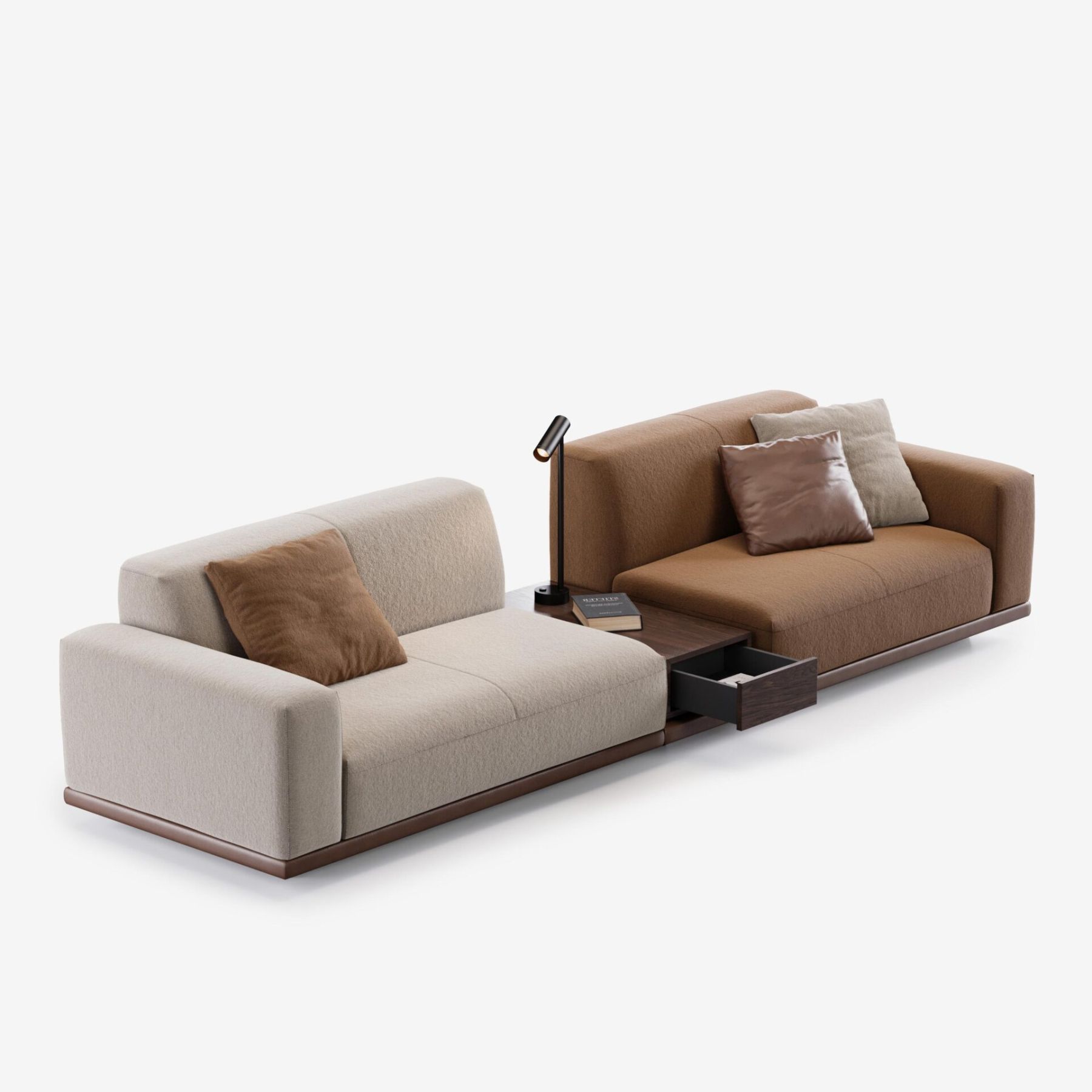 Все модули самостоятельны — их можно комбинировать или использовать по отдельности, создавая именно ту среду, которая вам нужна. Коллекцию дополняют кресла, повторяющие ее пластику, и многофункциональные пуфы-столики с отделкой из шпона дуба. Диван можно персонализировать практичными элементами: подлокотниками, подставками, боковыми столиками и ящиками для хранения, которые легко объединяются с основными модулями.