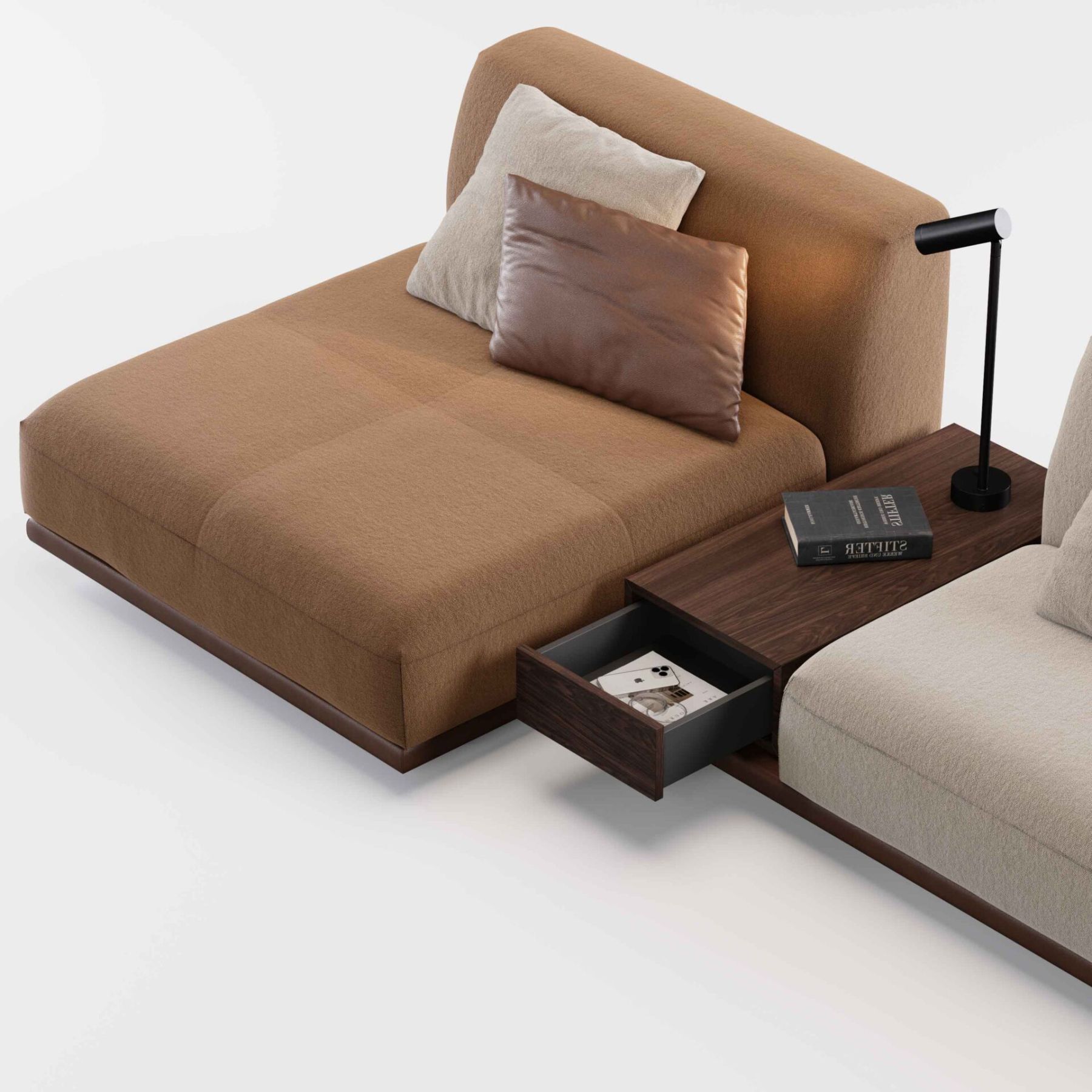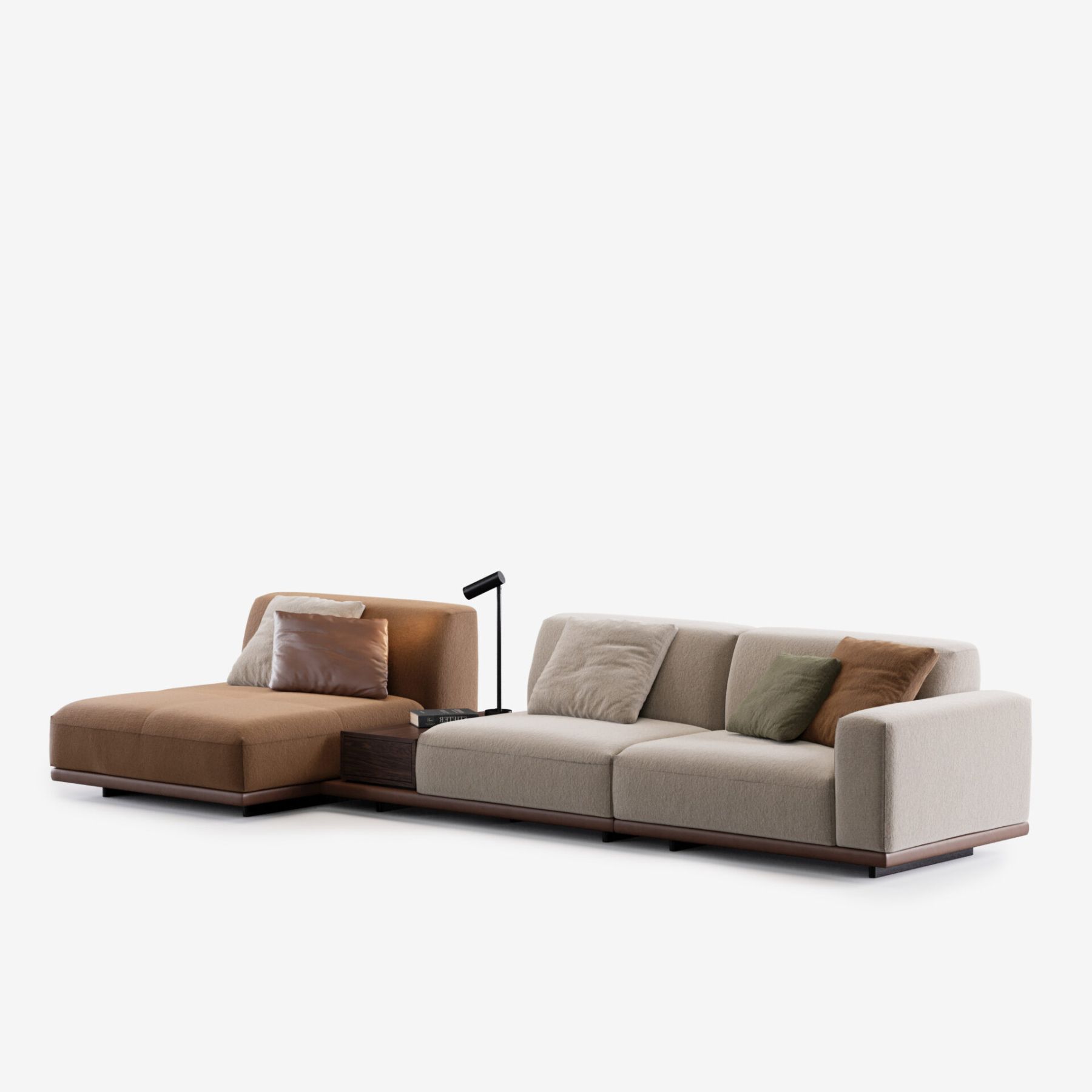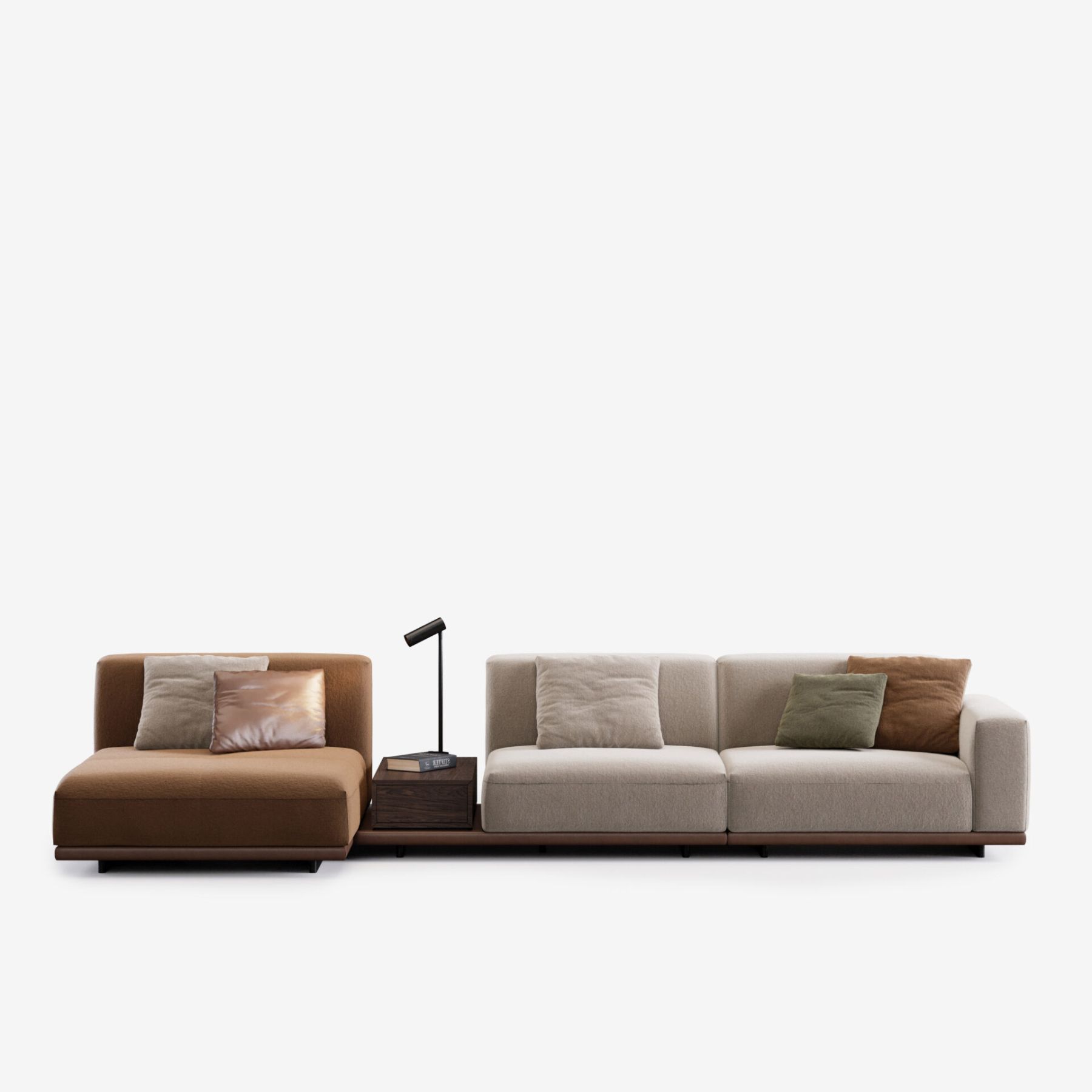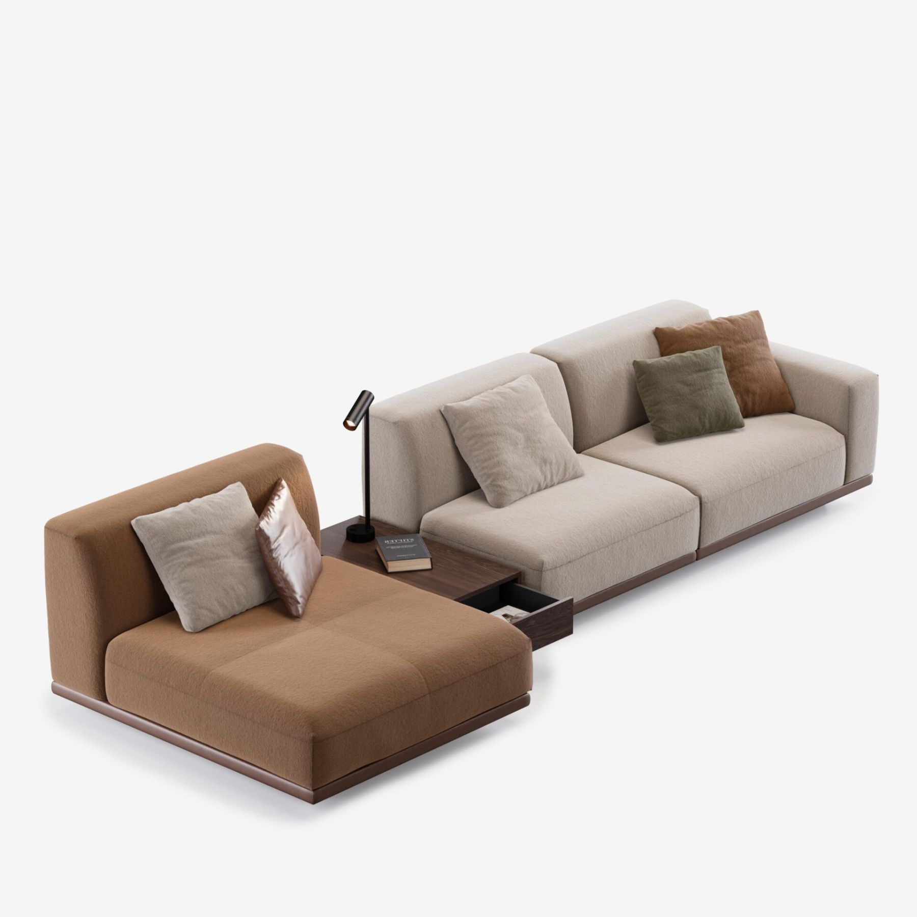 Все модули самостоятельны — их можно комбинировать или использовать по отдельности, создавая именно ту среду, которая вам нужна. Коллекцию дополняют кресла, повторяющие ее пластику, и многофункциональные пуфы-столики с отделкой из шпона дуба. Диван можно персонализировать практичными элементами: подлокотниками, подставками, боковыми столиками и ящиками для хранения, которые легко объединяются с основными модулями.