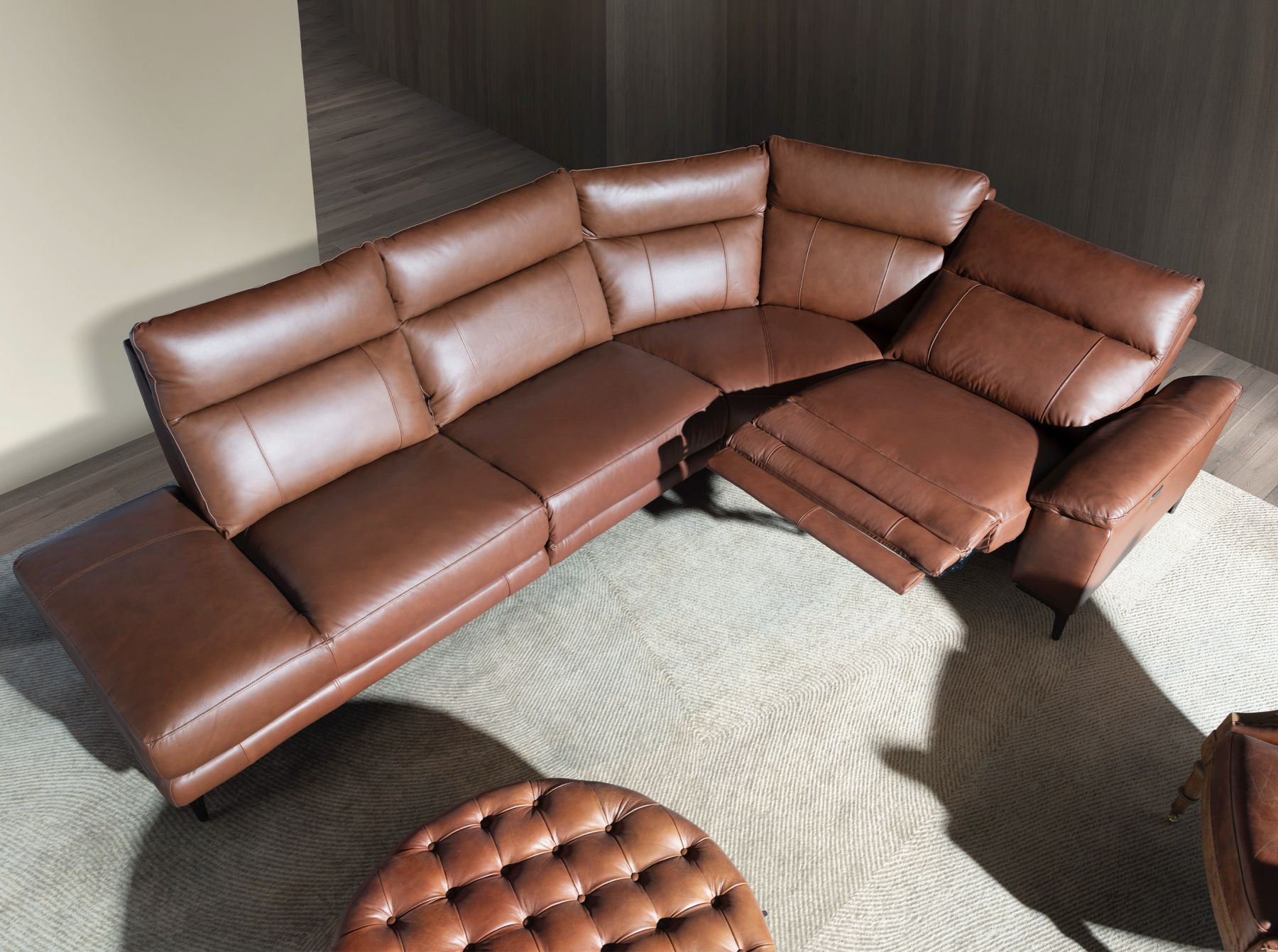 5-местный диван-шезлонг с современным дизайном, обитый табачно-коричневой воловьей кожей . Благодаря своему стилю и ножкам из темной хромированной нержавеющей стали этот диван привнесет нотку авангарда и элегантности, которую вы ищете в своем доме.