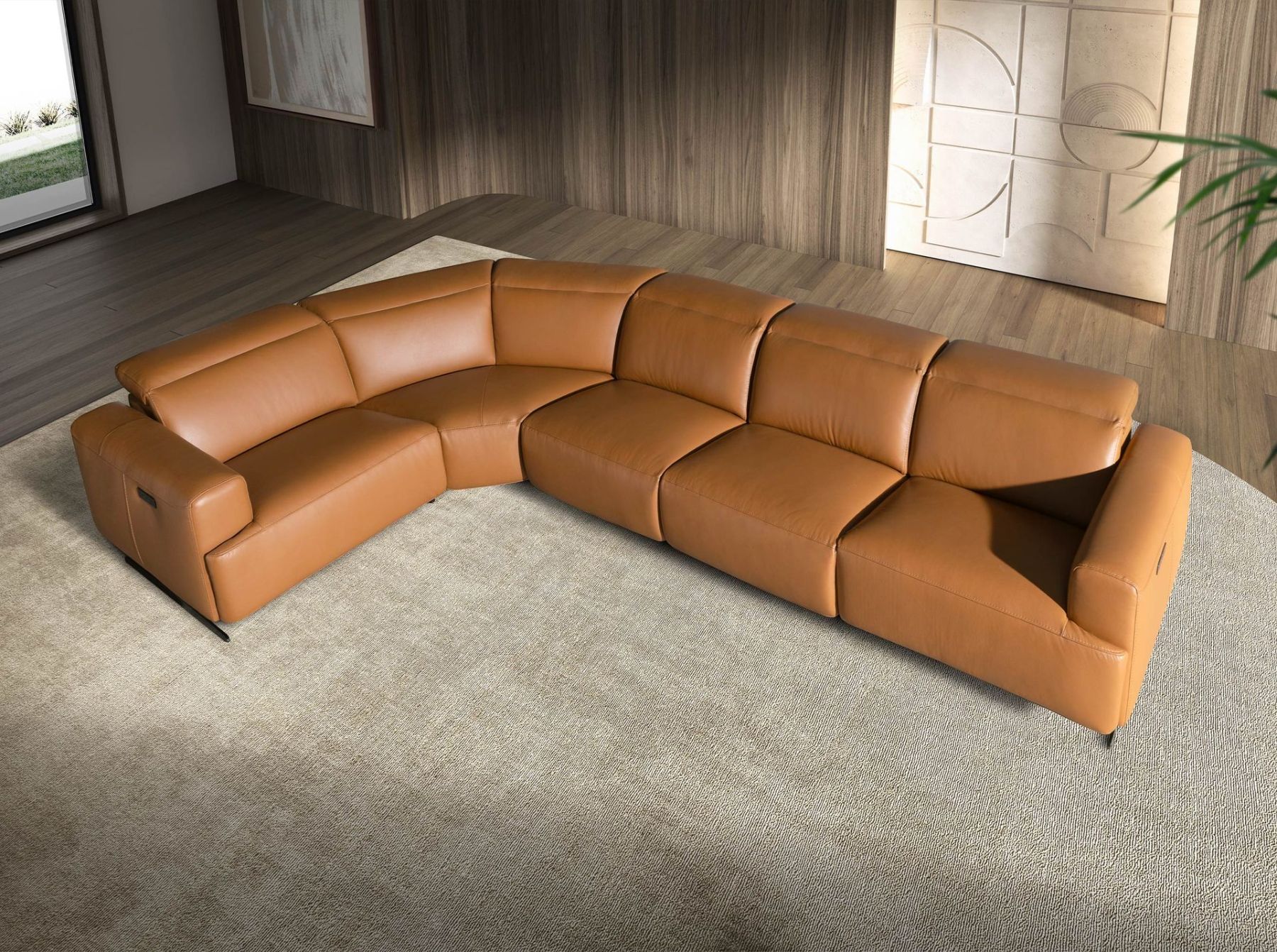 5-местный левосторонний угловой диван для релаксации с современным дизайном, обитый коричневой воловьей кожей , с подголовником для большего комфорта. Благодаря своему стилю и ножкам из нержавеющей стали с черной эпоксидной краской этот диван привнесет нотку авангарда и элегантности, которую вы ищете в своем доме.