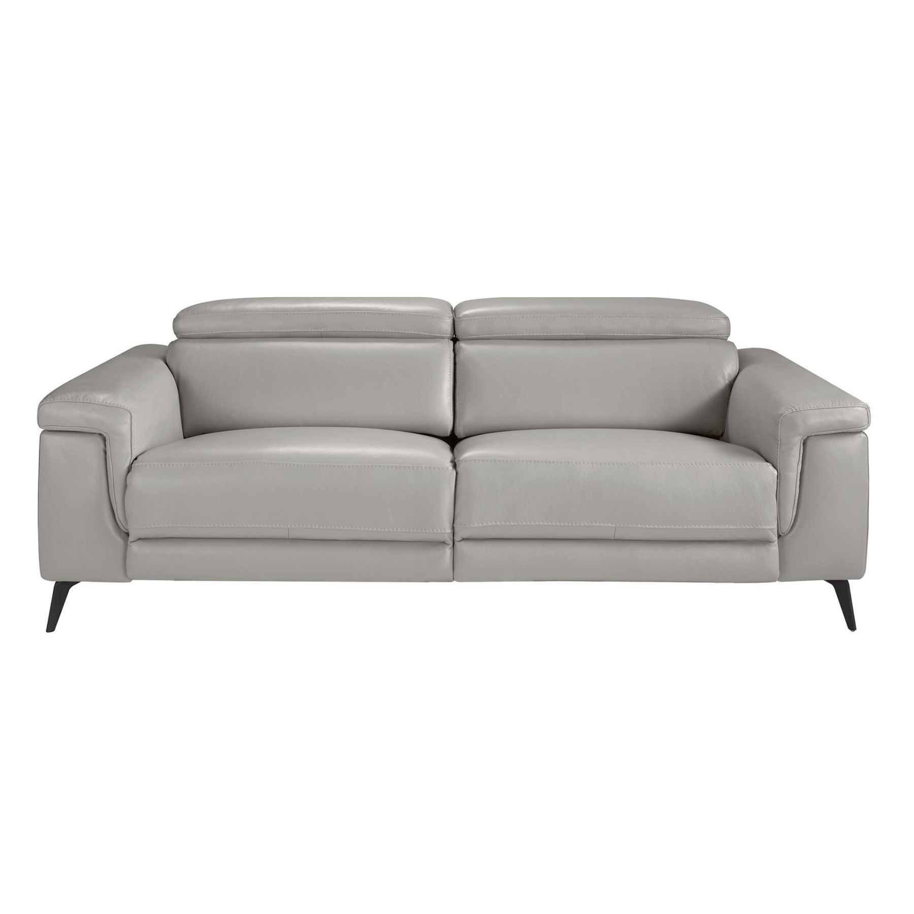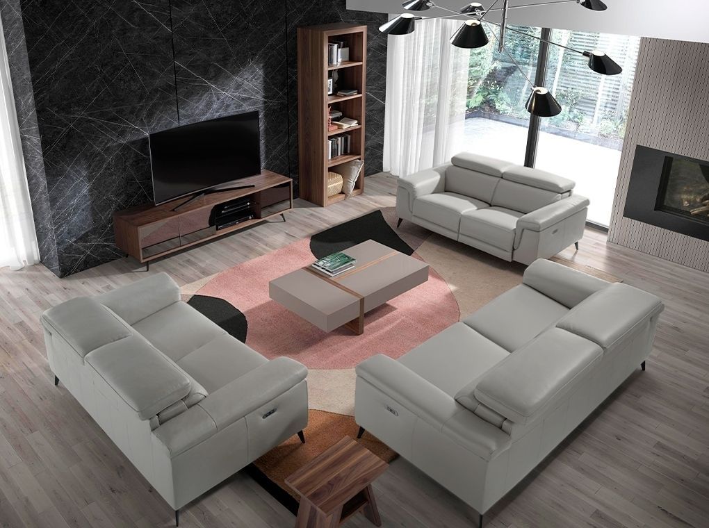 3-местный диван с обивкой из воловьей кожи серого цвета со структурой из натуральной древесины сосны, независимыми шарнирными подголовниками и двумя электрическими механизмами релаксации. Ноги из твердой стали, окрашенной черной эпоксидной смолой.