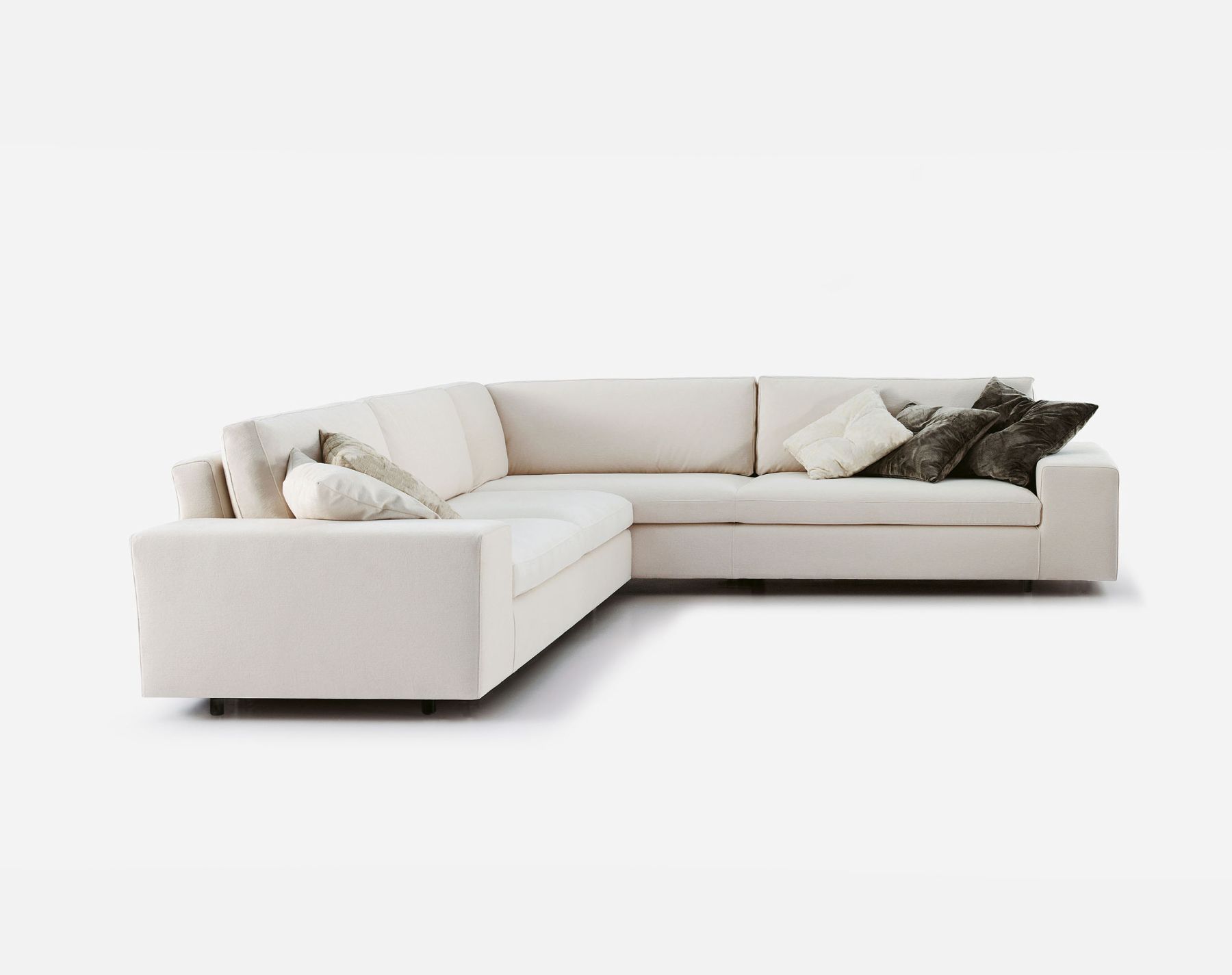 Коллекция дополнена несколькими вспомогательными элементами: двумя пуфиками и четырьмя дополнительными подушками для подлокотников, если они используются в угловом варианте (по две на каждую высоту спинки). Пуф размером 95х95 см можно использовать в качестве углового элемента. Ножки скрыты.