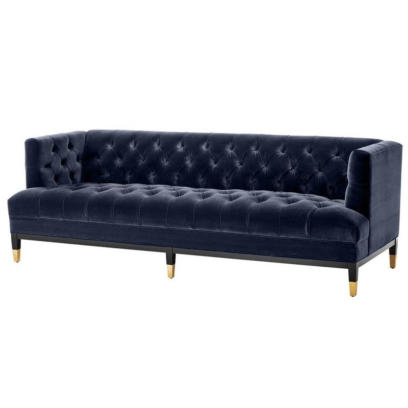 Роскошный синий диван с отделкой капитоне от легендарной фабрики Eichholtz (Нидерланды) на прямых ножках. Модель с почти прямой спинкой вровень с подлокотниками (стиль Taxido). Имеет черные ножки с рамой с колпачками в оттенке матовая латунь. Выполнен на каркасе из массива сосны и МДФ.