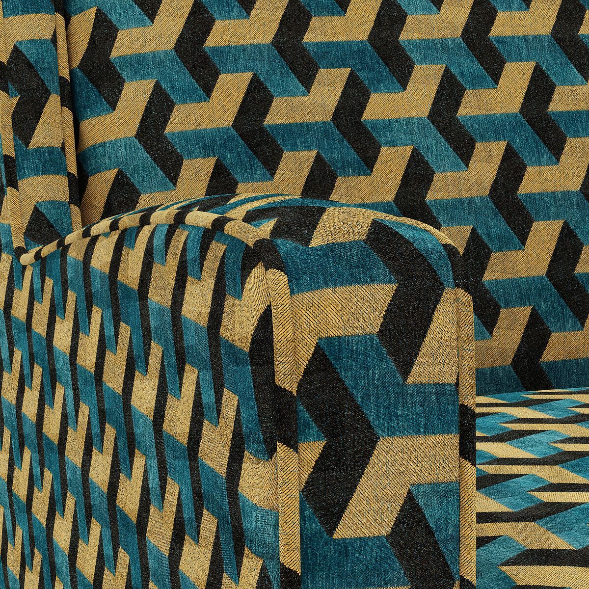 — Диван с динамичным рисунком на сидении и забавным вышитым геометрическим узором, подчеркнутым контрастным кантом.