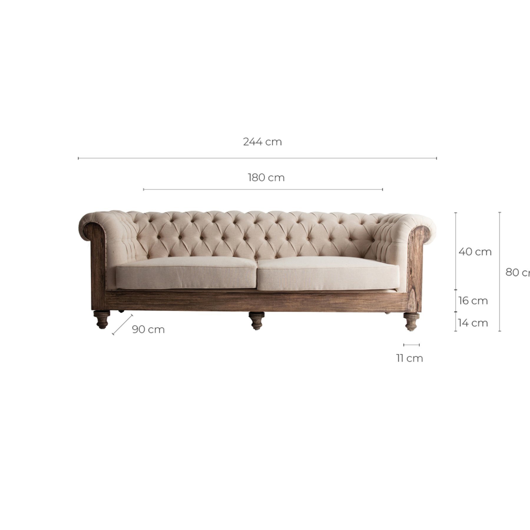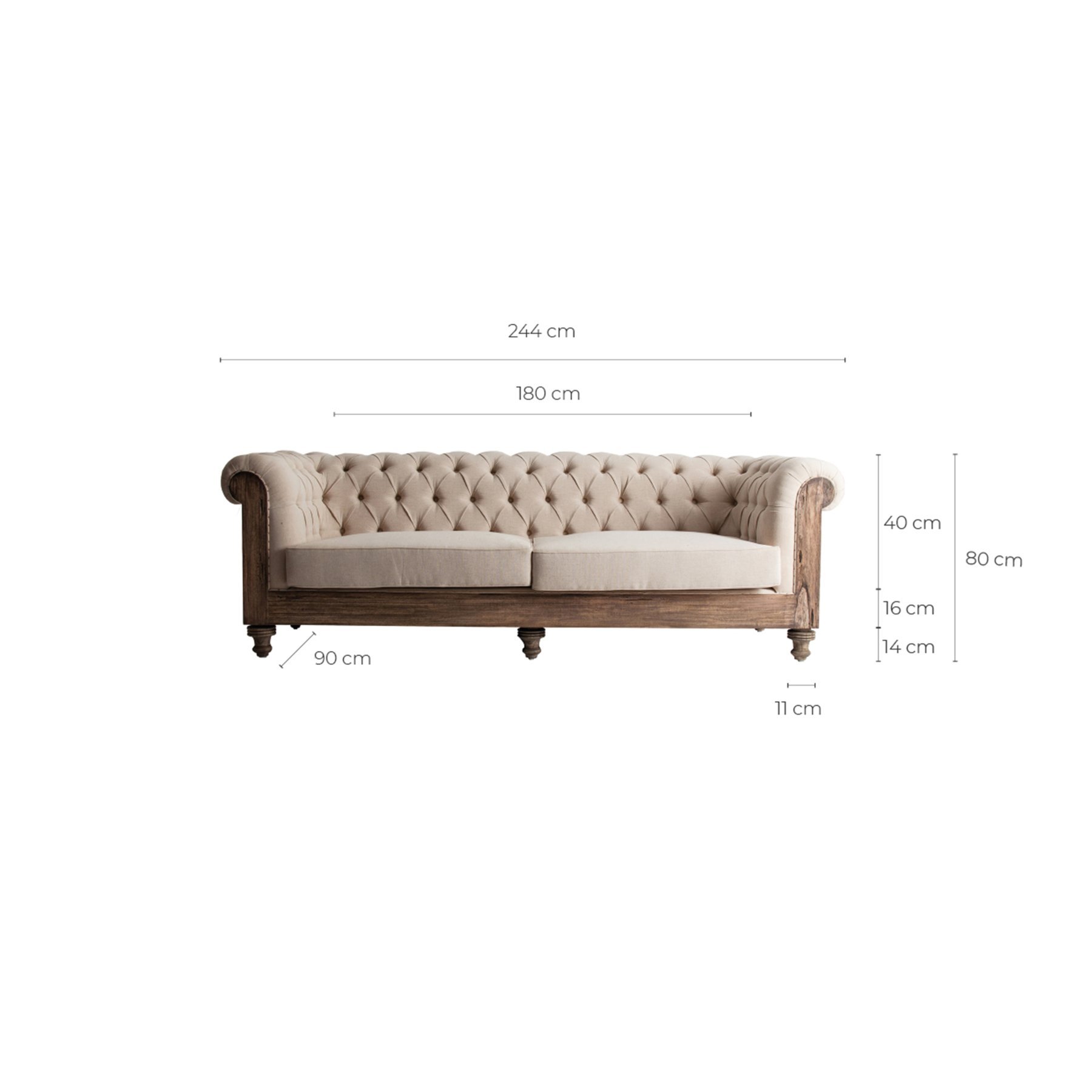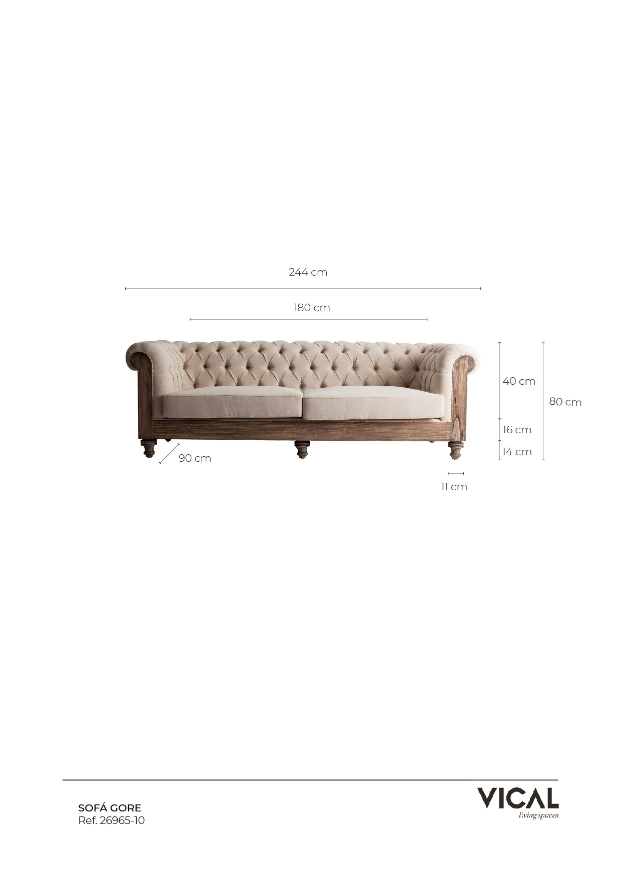 Диван VICAL Gore – это воплощение спокойствия и стиля. Прочный каркас из тропического дерева и мягкая бежевая обивка из полиэстера создают оазис спокойствия в любом жилом пространстве. Большие размеры 238x90x80 см гарантируют, что у вас будет достаточно места, чтобы растянуться или поделиться с семьей и друзьями. Его изысканный дизайн вдохновлен классическим диваном Chesterfield с нотками современности, что делает его подходящим как для современных, так и для традиционных интерьеров. Сделайте диван Gore центром своей гостиной и погрузитесь в роскошный комфорт день за днем.