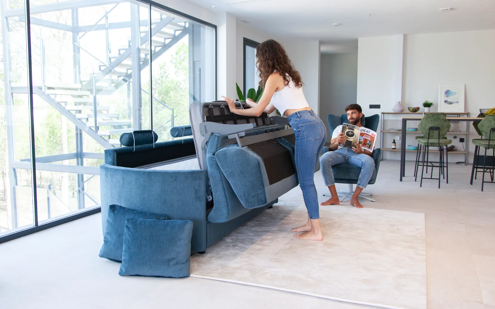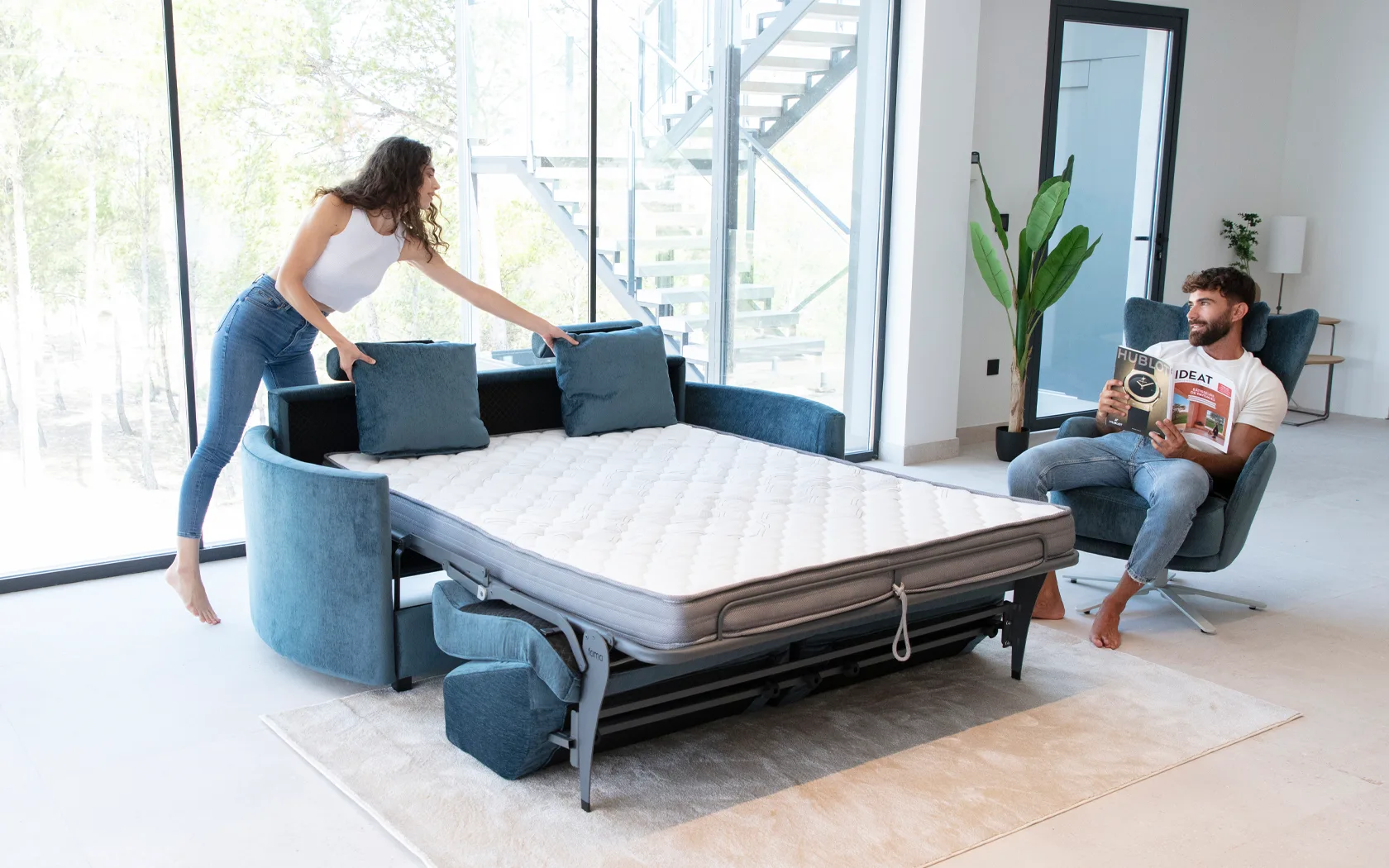 В то время как большинство диванов-кроватей на рынке очень высокие и имеют очень глубокое сиденье, сиденье Болеро ниже и неглубокое и настолько похоже на сиденье обычного дивана, что, если бы вам не сказали, вы бы никогда не подумали, что у него есть сиденье. механизм сиденья. Это одно из основных преимуществ Болеро, которое очень удобно и как диван, и как кровать. Благодаря этому и привлекательному дизайну мы можем использовать его в качестве основного дивана в гостиной и использовать в качестве кровати, когда он нам понадобится. Он также доступен в модульной версии. Есть два типа рук: прямые и изогнутые. Он включает в себя оригинальную систему подголовников, которую можно практически спрятать в отверстии в спинке сиденья.