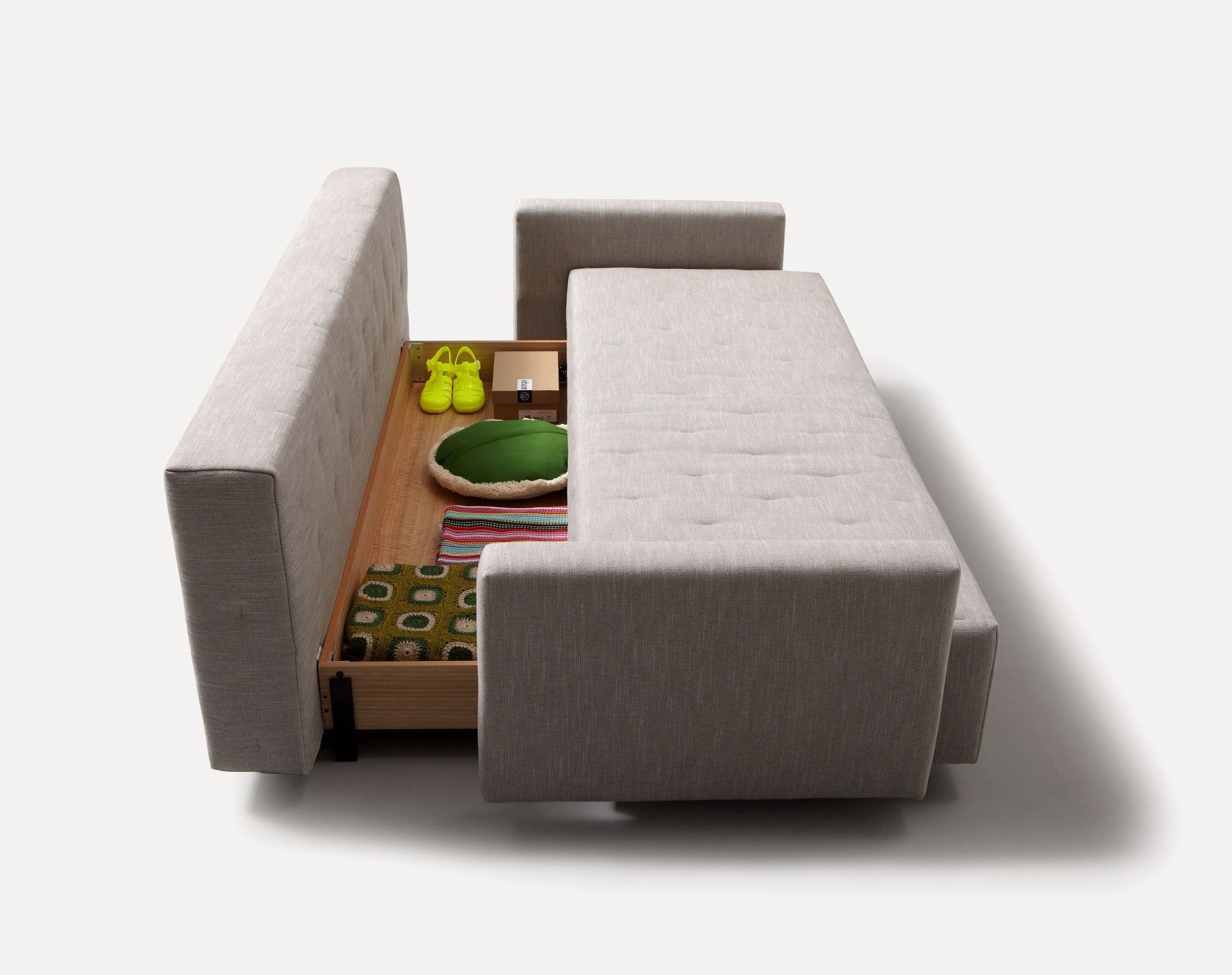За два простых шага нам удалось превратить диван в кровать и наоборот. Скрытый ящик под конструкцией идеально подходит для хранения постельного белья и других вещей.