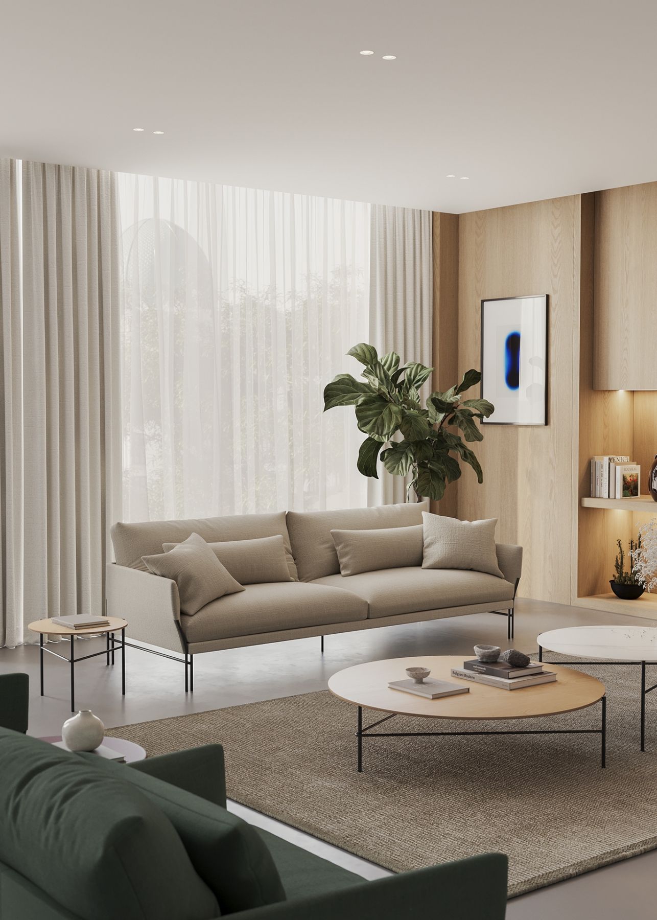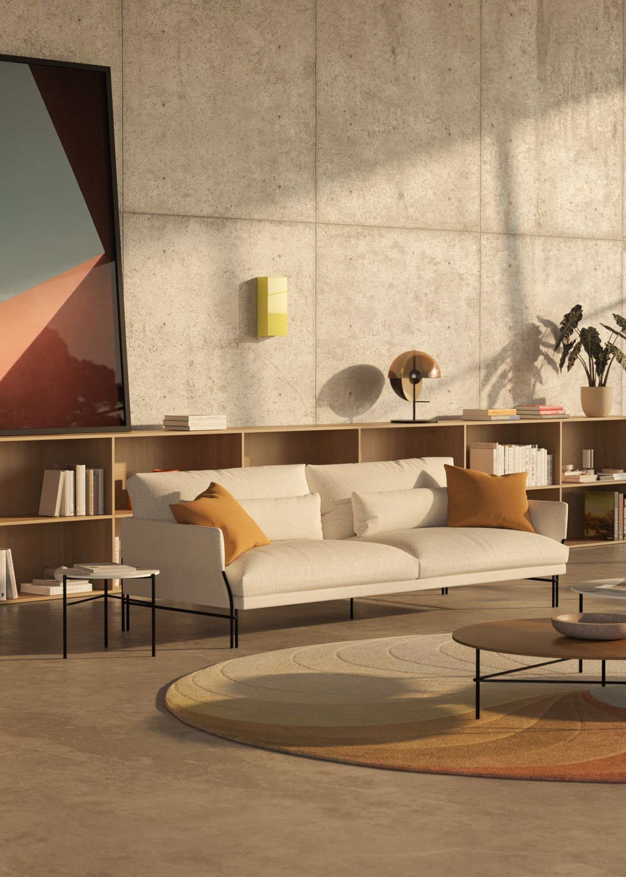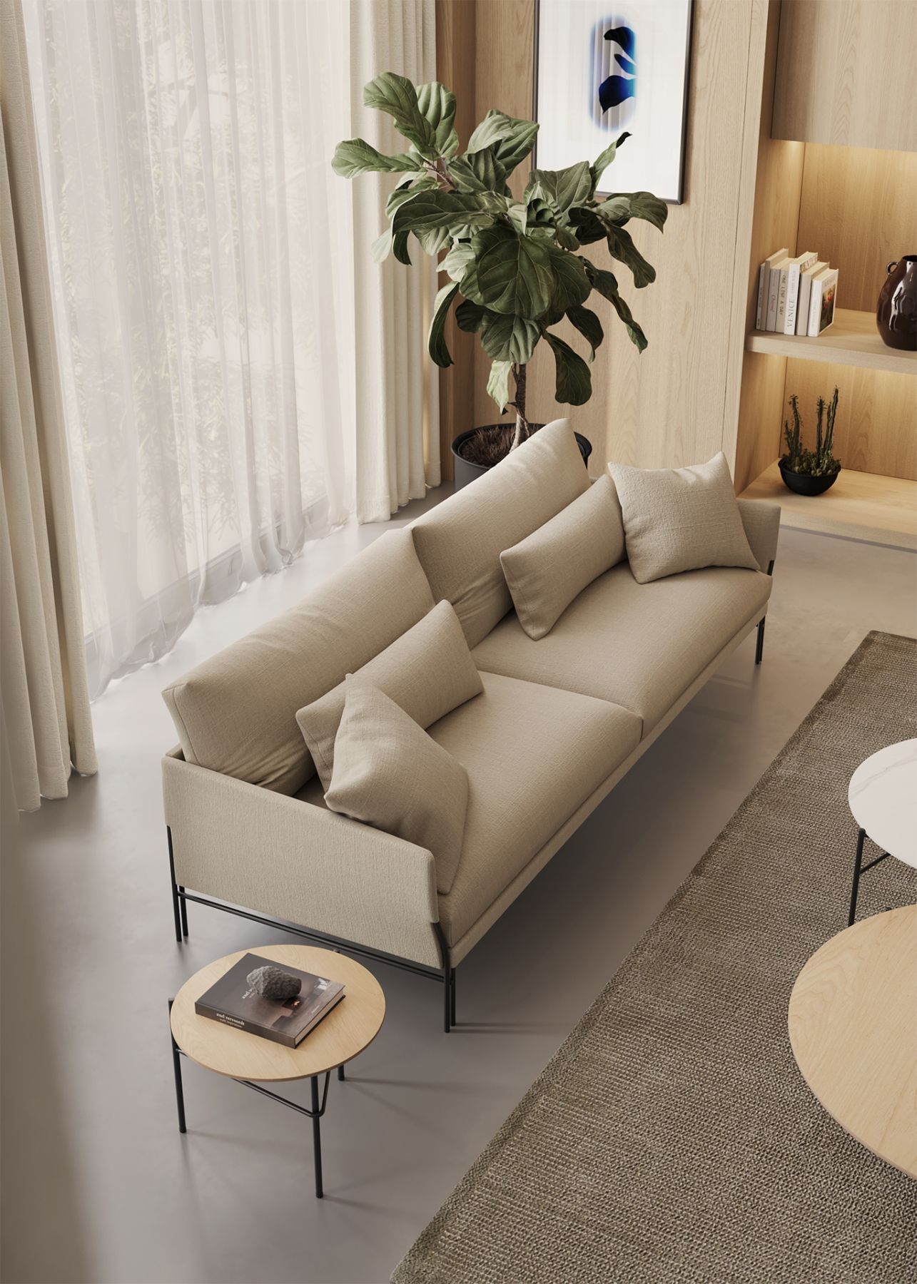 Этот диван сочетает в себе элегантные, чистые линии с комфортом, обеспечиваемым толстой и мягкой зоной отдыха, качества, которые также передает спинка дивана. С эстетической точки зрения одной из его наиболее отличительных особенностей является видимое основание, состоящее из двойной системы ножек, которая подчеркивает легкость и прочность конструкции.