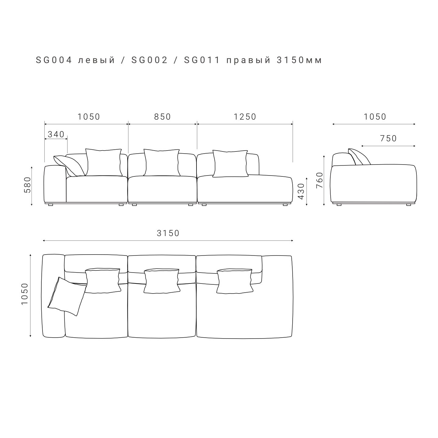 В комплекте с каждым модулем поставляется декоративная подушка в цвет основной ткани дивана.