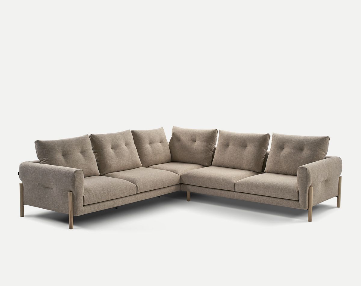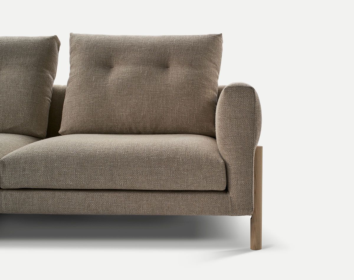 Два размера сидений являются отправной точкой для создания 2- и 3-местных диванов, модулей с подлокотниками или без них, различных вариантов шезлонгов, пуфа, концевых элементов и модуля, расположенного под углом 45°, для придания формы всем видам композиций. Дизайн, который адаптируется как к небольшим помещениям, так и к большим открытым планировкам. Его размеры умеренные; его легкая структура придает ему воздушный вид; свободные подушки и их строчка на спинке создают утонченную отличительную деталь. Подушки спинки усилены пеной, поэтому они остаются твердыми при сидении. Прочная опора для ног из ясеня, доступная в любом из наших цветов, обрамляет извилистые линии подлокотников.