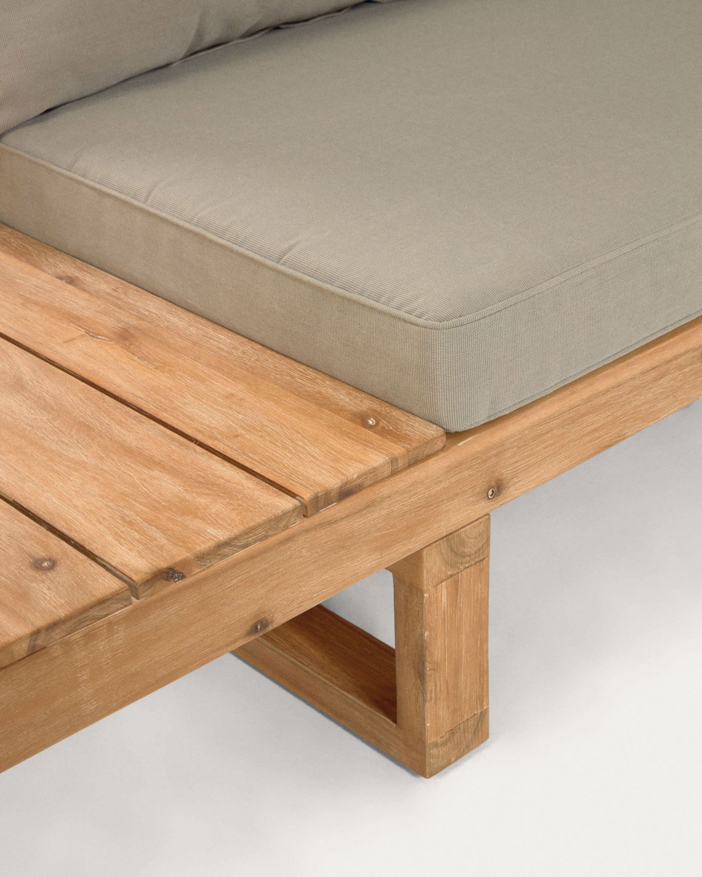 Угловой диван Flaviina 5-местный со столом – создайте полноценный открытый лаундж для отдыха вместе с фабрикой La Forma! Угловой диван Flaviina вместе со столом – это комплексное решение для обустройства вашего уличного интерьера. Набор уникален тем, что создан из натуральной древесины. Она подготовлена к уличной эксплуатации также, как и подушки. Они безупречны в своем виде и легко чистятся благодаря съемным чехлам. Подарите себе лакшери отдых на террасе. Диван со столом имеют каркасную конструкцию, которая полностью изготовлена из массива акации. Для защиты от влаги и солнца сверху есть полиуретановое покрытие. Благодаря реечной структуре, изделия хорошо просыхают после дождя, не скапливают влагу. Каркас дивана дополнен двумя боковыми столешницами шириной по 34 см и толщиной по 7 см. Входящие в комплектацию подушки сшиты из прочного полиэстера бежевого цвета. Материал не выгорает на солнце, практически не намокает. Чехлы съемные, можно стирать в машинке. Наполнитель подушек – акриловые волокна и синтетическая пена. Рамочные ножки у стола и дивана обеспечивают равномерное распределение нагрузки, выдерживают большой вес. Вместимость сидячих мест – 5. Размеры: ширина дивана – 230 см, глубина дивана – 230 см, высота дивана – 70, глубина сиденья – 55 см, высота стола – 19 см, ширина (глубина) стола – 80 см. Общий вес всех изделий – 73 кг. Потребуется самостоятельная сборка. Инструкция и крепеж включены в комплектацию.