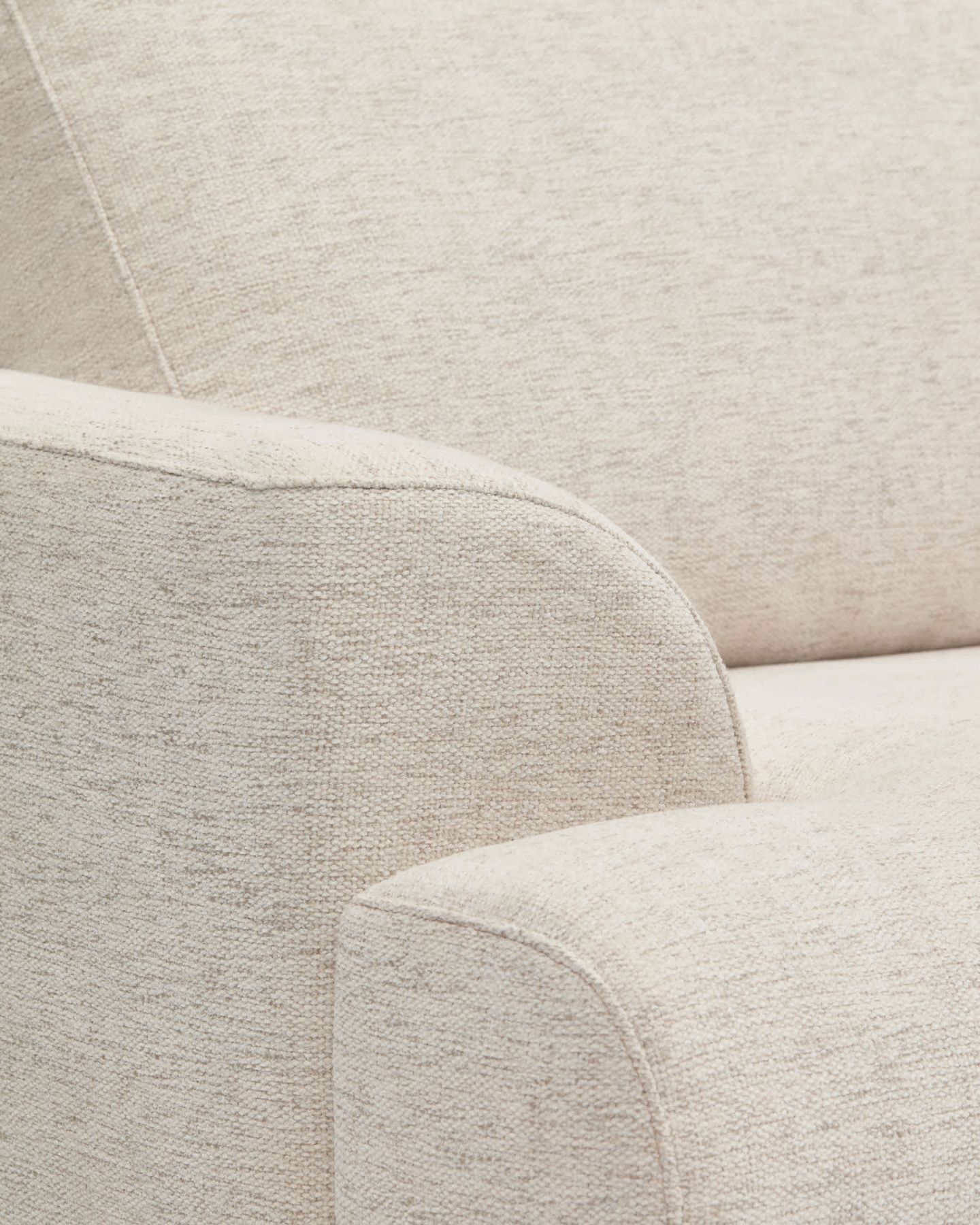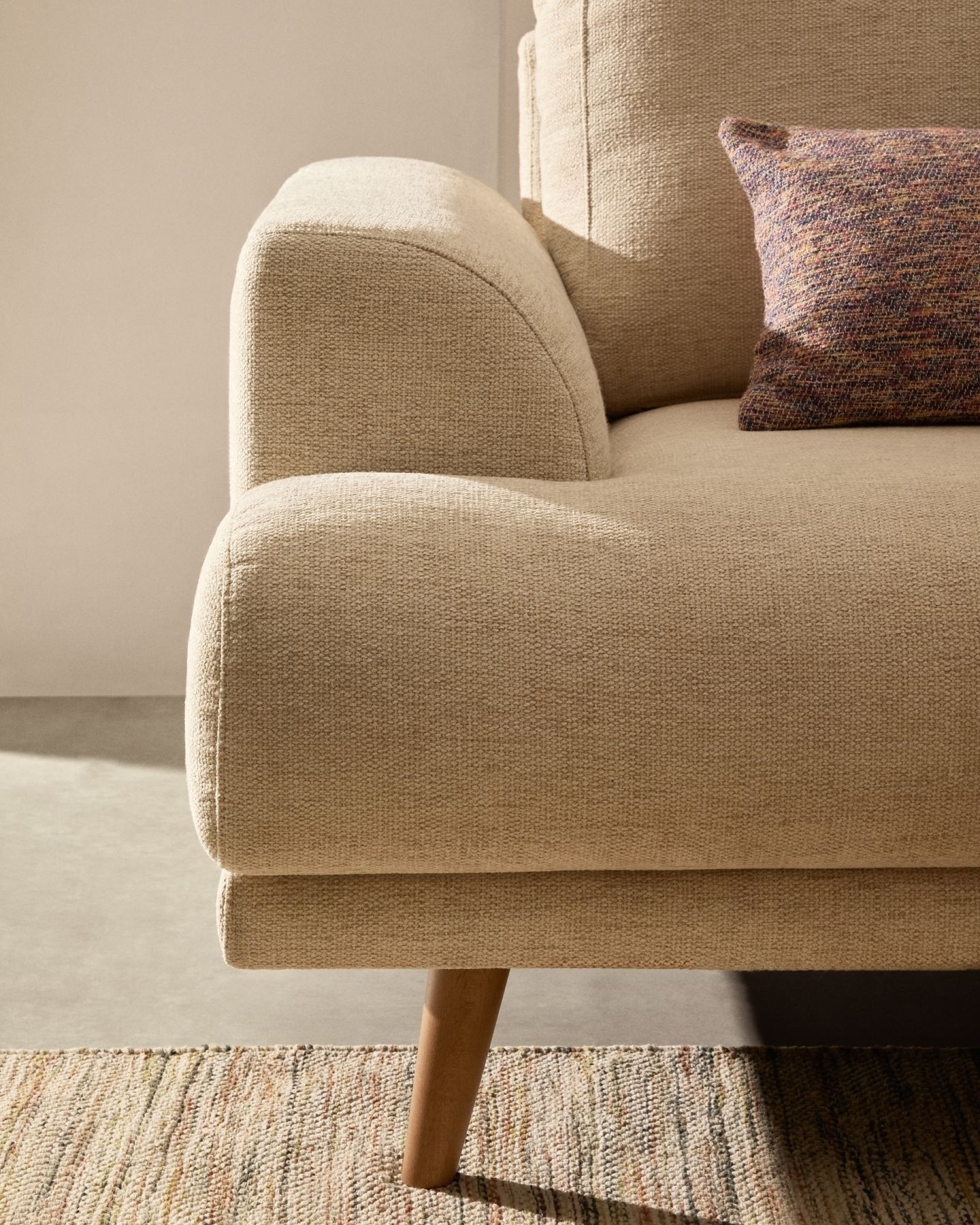 Трехместный диван с обивкой из толстой синели с защитой от пятен. Набит переработанным ПЭТ-волокном. Съемные чехлы сиденья и спинки. Легко чистящаяся ткань. Ножки из массива бука с отделкой из орехового дерева.