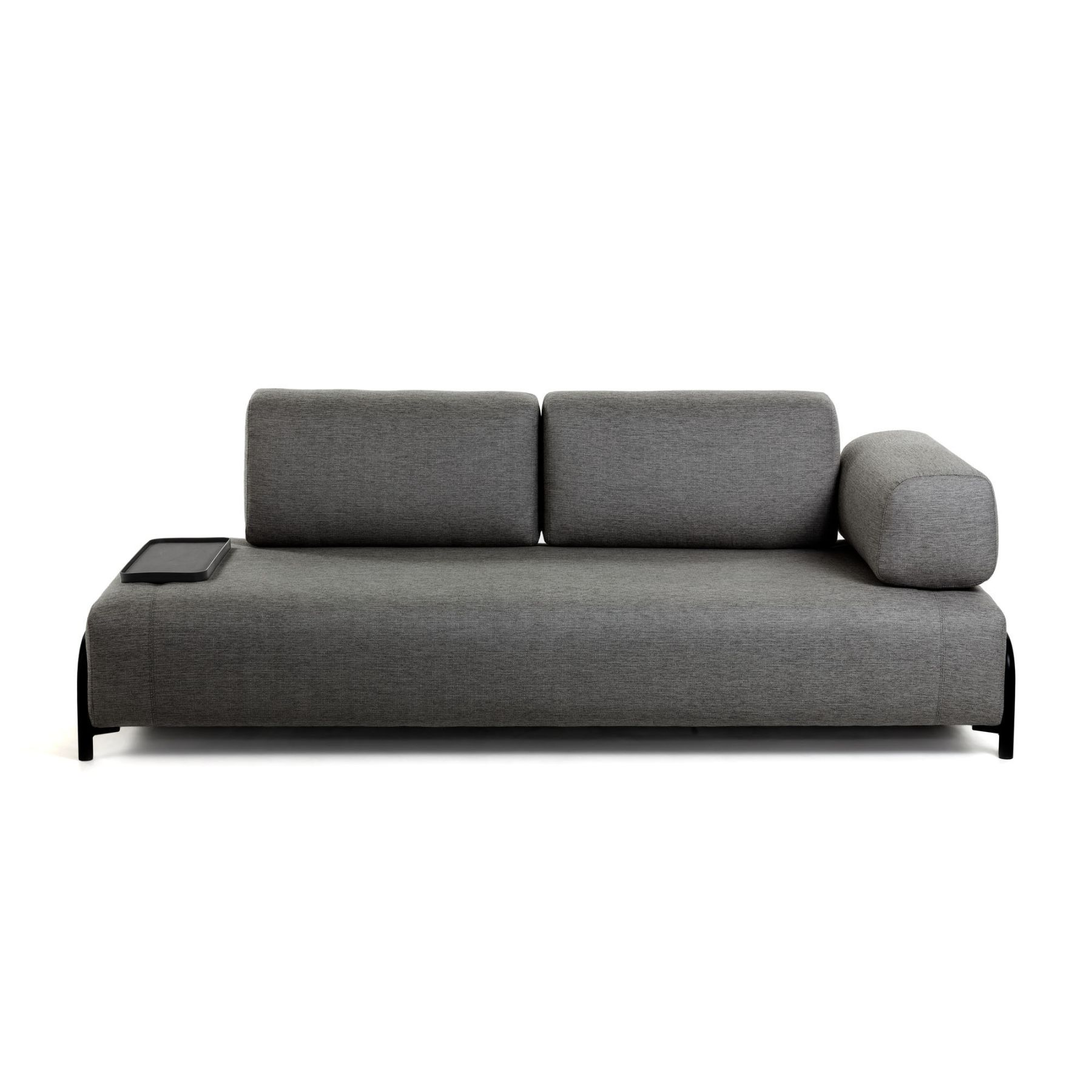Диван Compo от фабрики La Forma – возможность создать свою комбинацию из основы и подходящего аксессуара. Диван Compo очаровывает и вдохновляет своей концепцией, которая дает возможность творить и выбирать. Здесь легко можно заменить один или сразу два подлокотника на подносы, которые даны в двух вариациях размеров. Три базовых цвета обивки позволят экспериментировать с дизайном и при этом не бояться за совместимость с интерьером. А традиционная форма – прекрасное решение для современных городских квартир. Диван имеет каркасную конструкцию из ДСП сосны, МДФ и акриловых волокон. Наполнитель – пенопласт плотностью 20 (спинка и подлокотники) и 30 (сиденье) кг/м3. Обивочное полотно – 100% полиэстер, с фактурой «рубчик». Это прочная ткань с плотностью 310 г/м2, которая имеет высокие эксплуатационные характеристики. Материал выдерживает интенсивные нагрузки, устойчив к пятнам. В коллекции представлено три цвета обивки – голубая, светло- и темно-серая. Чехлы на подушках съемные. Опора имеет трубчатую структуру с диаметром 3,5 см. Она выполнена из металла, покрыта черной порошковой краской. На ножках есть наконечники, которые защищают напольное покрытие от деформаций. При желании, подлокотники можно заменить на металлические подносы черного цвета, где большой на ножках приставляется справа, а малый накладывается слева. Для этого металлические держатели подлокотников вынимаются из прорезей в сиденье. Общая вместимость дивана составляет 3 человека. Максимально допустимая нагрузка не должна превышать 300 кг. Размеры: длина – 232 см, глубина – 98 см (глубина сиденья – 60 см), высота – 82 см, ширина подлокотников – 31 см. Габариты подносов: ширина – 21 или 40 см, глубина – 54 см. Вес – 62 кг. Подносы приобретаются отдельно. При желании можно приобрести только основу, без подлокотников и подносов. Потребуется сборка. Инструкция и крепеж включены в комплектацию.