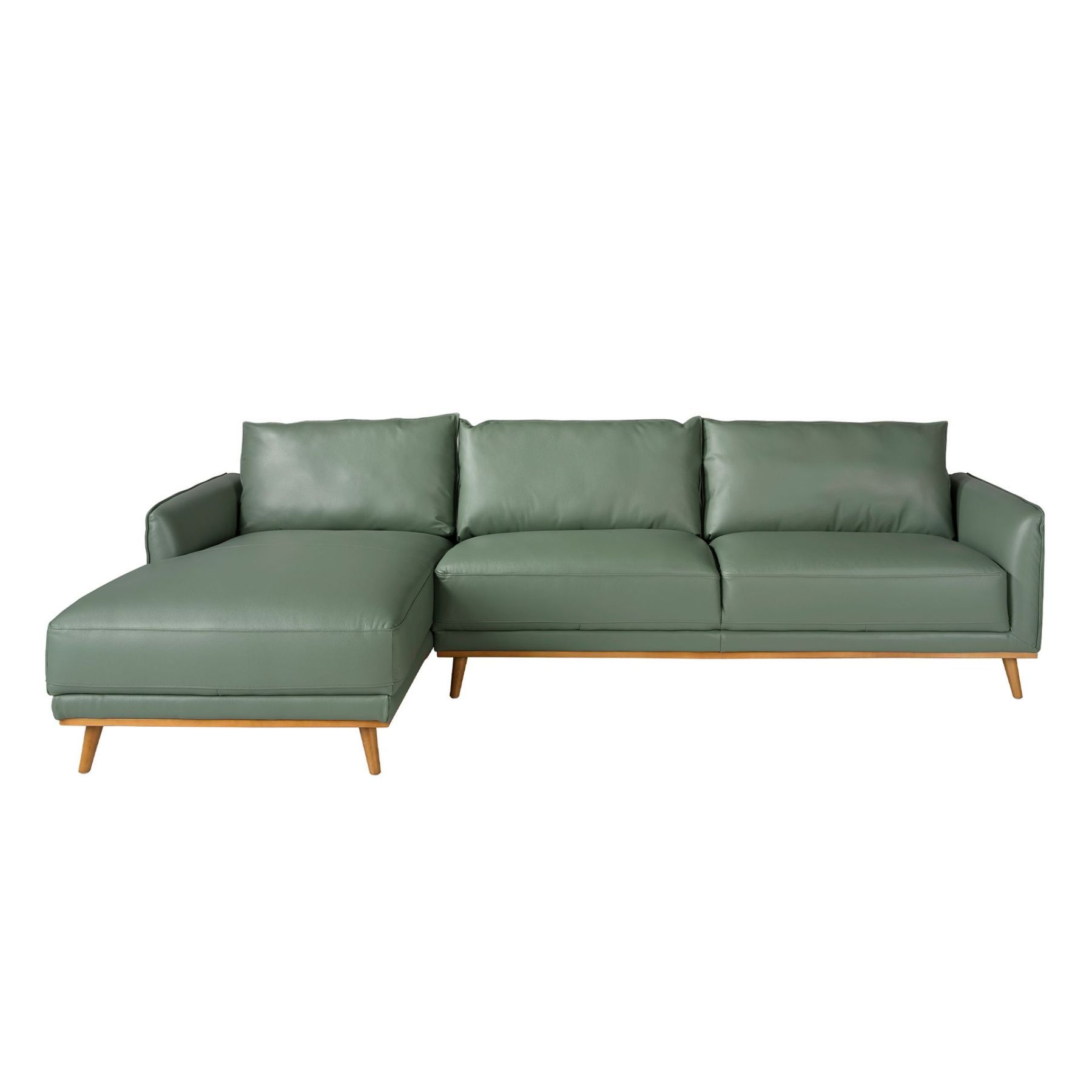 5-местный левый диван-шезлонг с современным дизайном, обитый зеленой воловьей кожей. Благодаря своему стилю и медовым деревянным ножкам этот диван привнесет нотку авангарда и элегантности, которую вы ищете в своем доме.