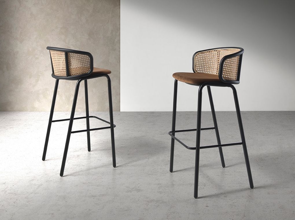 Табурет с подлокотниками современного дизайна, обитыми коричневой бархатистой тканью, и спинкой из ротанга натурального цвета. Табурет в авангардном, но вневременном стиле, с каркасом и ножками из черной нержавеющей стали, который станет незаменимым в вашей столовой.