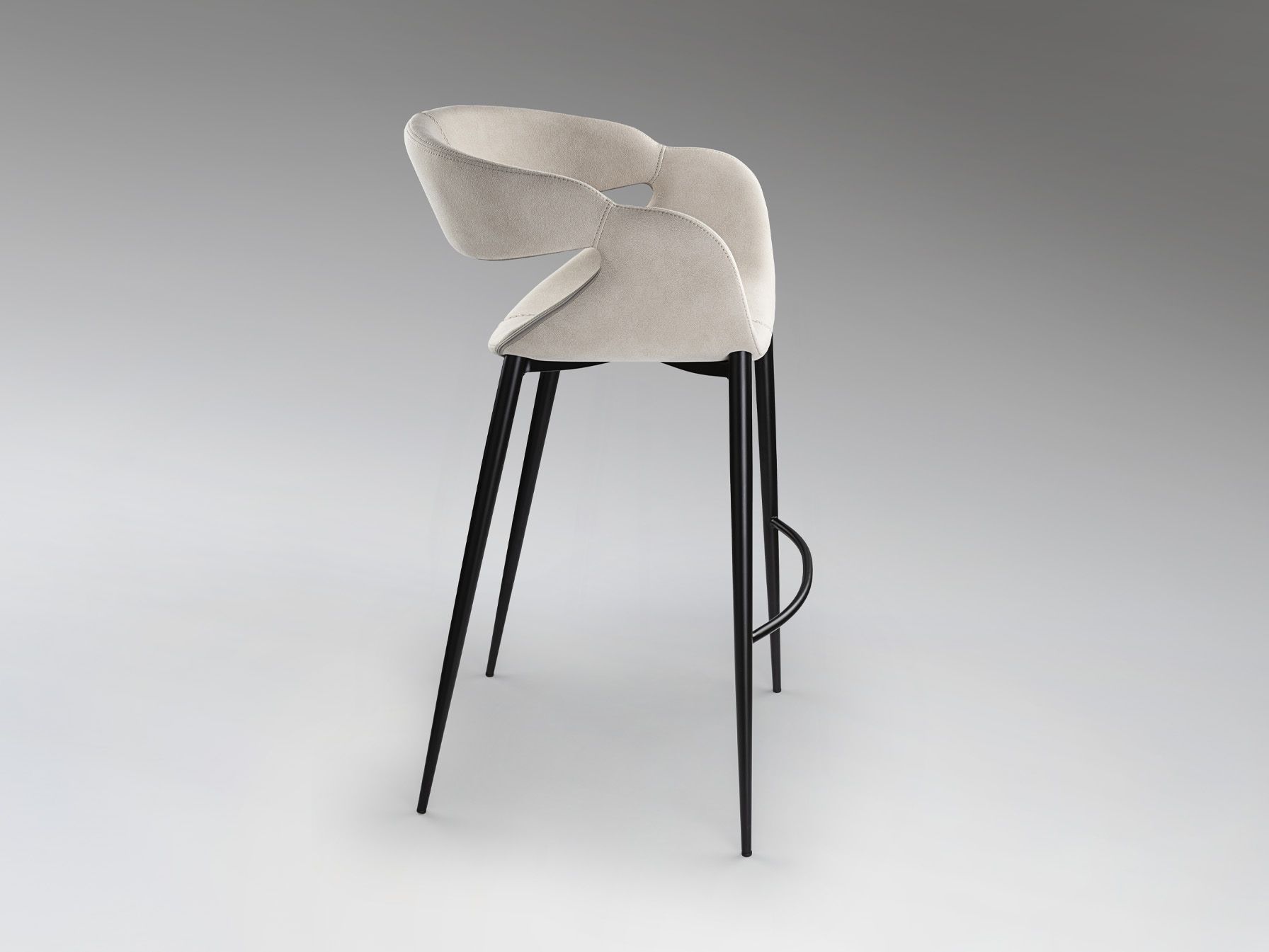 Высокий табурет. Металлические ножки с матово-черной отделкой и подставка для ног. Сиденье и спинка из фанеры и поролона. Обивка из 100% полиэстера в цвете светлого камня с декоративной строчкой. Химчистка.