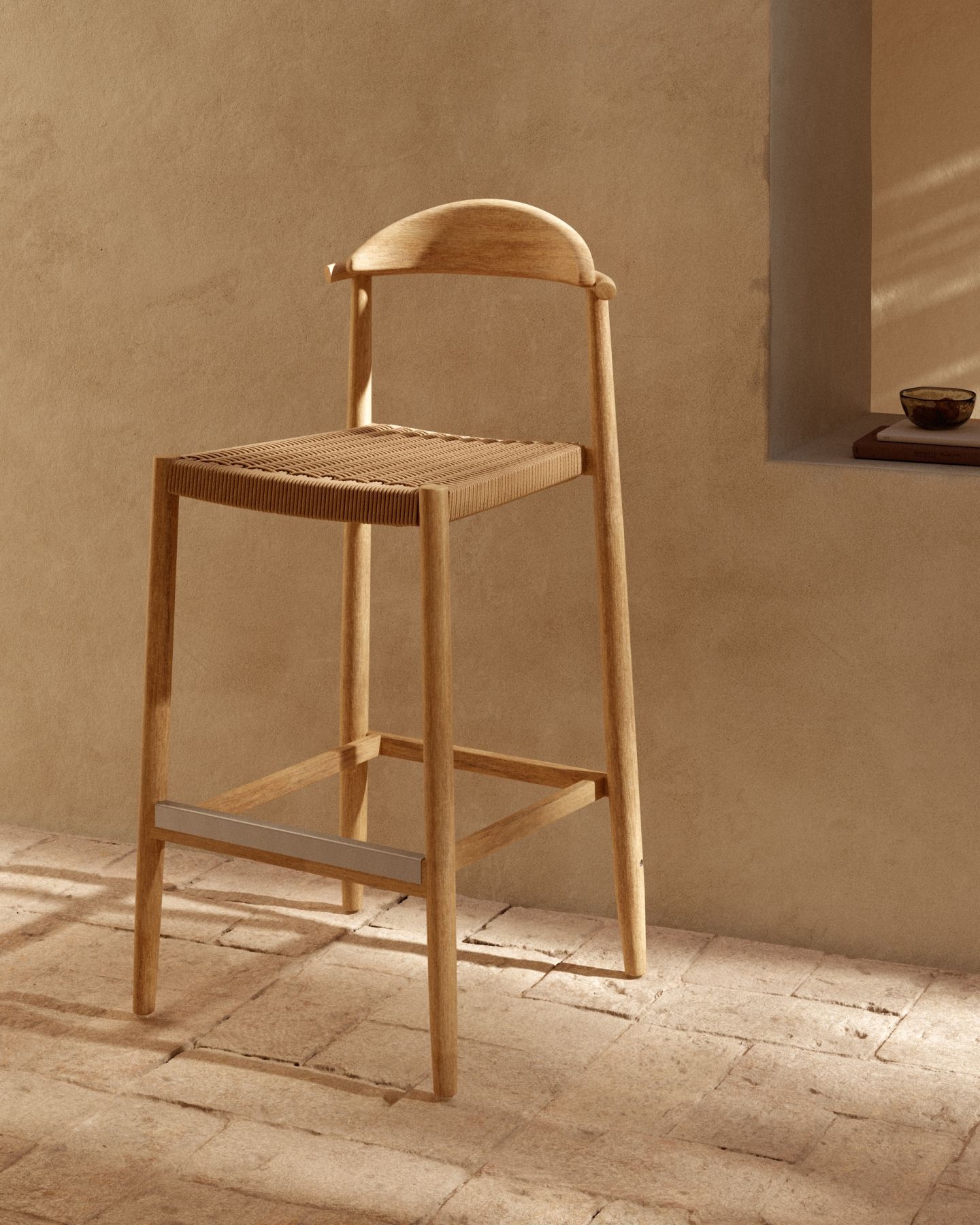 Барный стул 77 см с твердой структурой эвкалипта. С 4 слоя покрытия PU для длительной защиты от ультрафиолетового излучения и долговечности. Сиденье из полиэстера, стабилизированного ультрафиолетом. Составная. Для внутреннего и наружного использования под прикрытием.