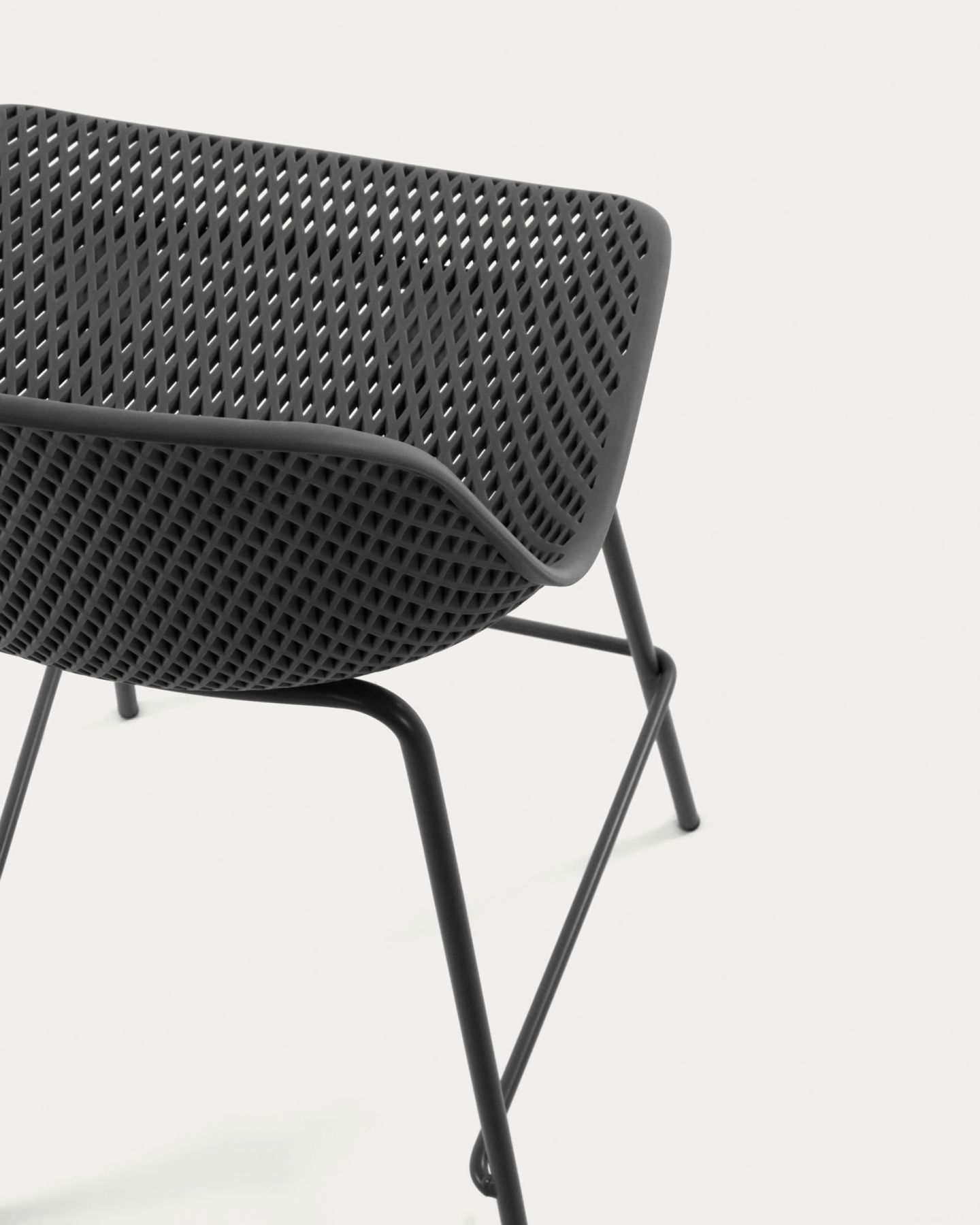 Стул конструкционно состоит из двух элементов — металлической опоры с четырьмя ножками и цельного сиденья. Оно имеет анатомическую форму внутри и обтекаемую снаружи, что эргономично и эстетично. Материал изготовления — пластик. Этот материал прочный, эргономичный, легкий. Сетчатая фактура добавляет оригинальности, выделяет среди похожих пластиковых моделей. Опора крепится на четырех болтах к тыльной стороне сиденья. Она металлическая, окрашена в тот же цвет, что и сиденье. Прочность металла гарантирует стойкость к высоким весовым нагрузкам. Дополнительный комфорт и устойчивость обеспечивает поперечная перекладина, проходящая по всему периметру опоры.