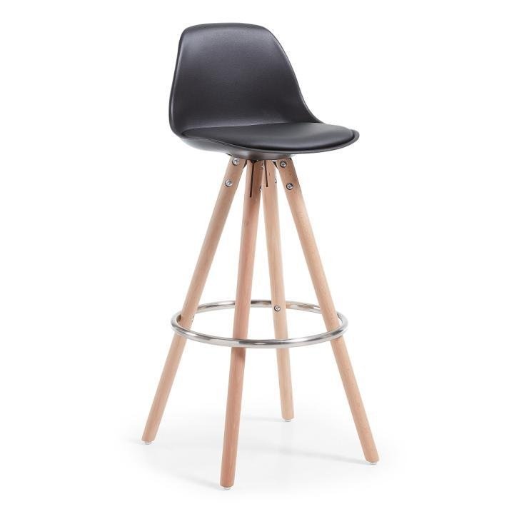 Стул выглядит просто и лаконично — этим он и привлекает. Внимания заслуживает современная и удобная форма сиденья, прочные деревянные ножки и металлическое кольцо, которое станет отличной подставкой для ног. В этой модели все предусмотрено для удобства.