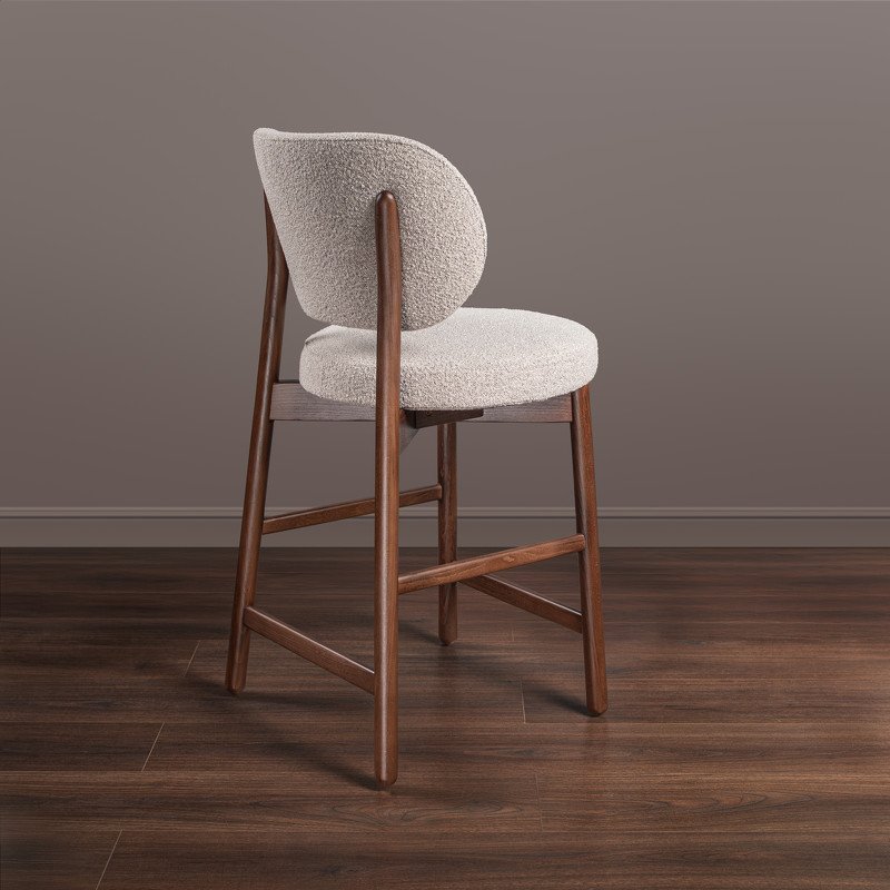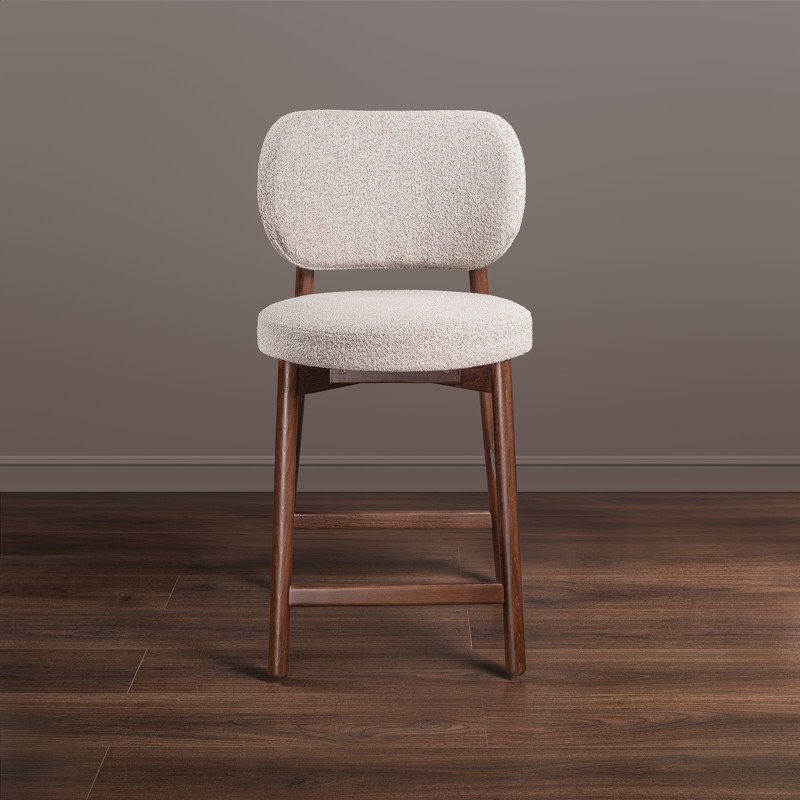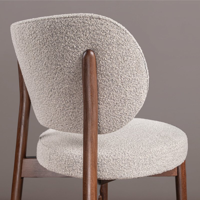Каркас стула выполнен из МДФ и массива бука. Ножки стула из массива бука в цвете итальянский орех, обивка ткань букле в бежевых оттенках.