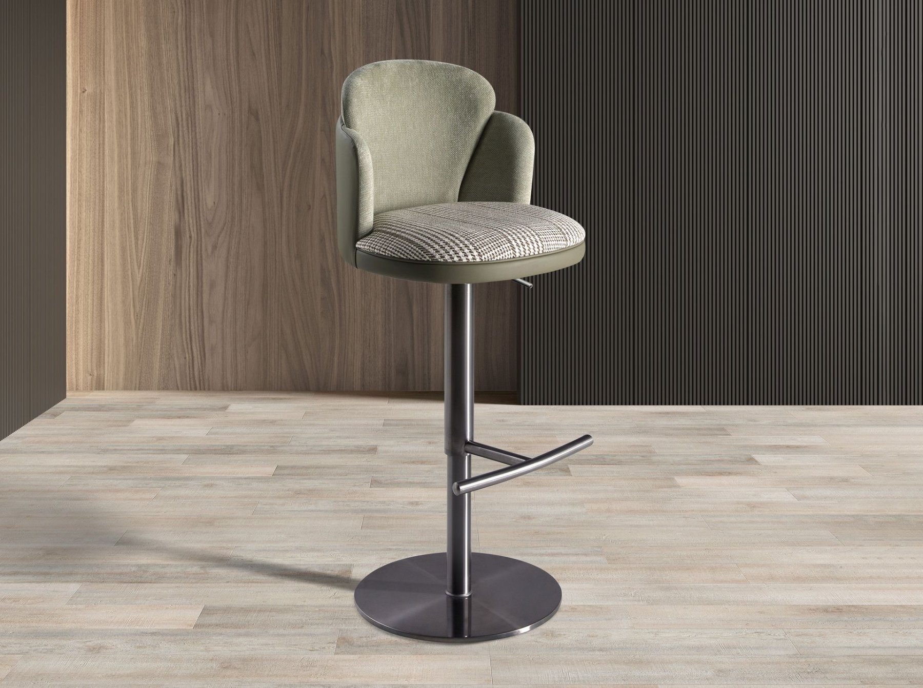 Современный поворотный табурет с сиденьем, обитым темно-зеленой и белой тканью, и спинкой, обитой оливково-зеленой искусственной кожей. Ножки из полированной нержавеющей стали с затемненным дизайном, сочетающие в себе авангардность и вневременную элегантность, сделают его незаменимым элементом вашей кухни или столовой. Этот табурет от Angel Cerdá сочетает в себе уникальный и индивидуальный стиль бренда с максимальным комфортом и устойчивостью благодаря высокому качеству обивки и оригинальной конструкции ножек. Регулируемая по высоте высота сиденья позволяет настроить его под ваши потребности, делая его еще более удобным.