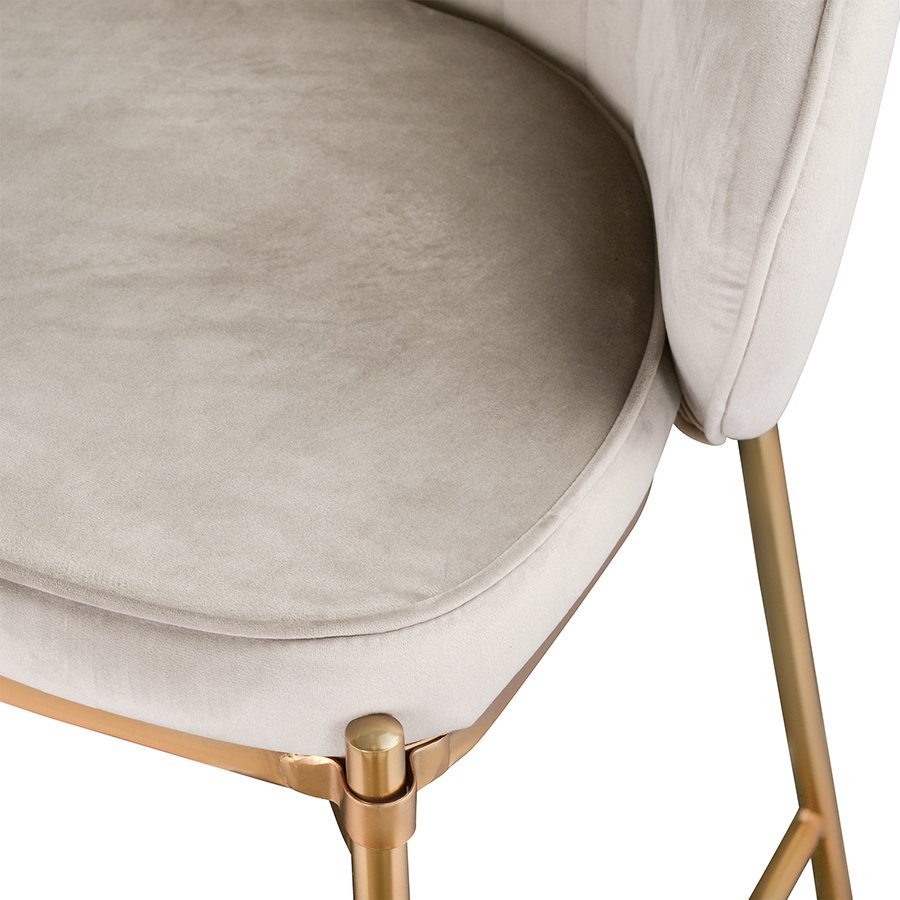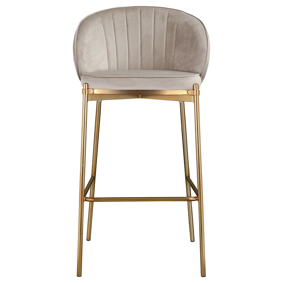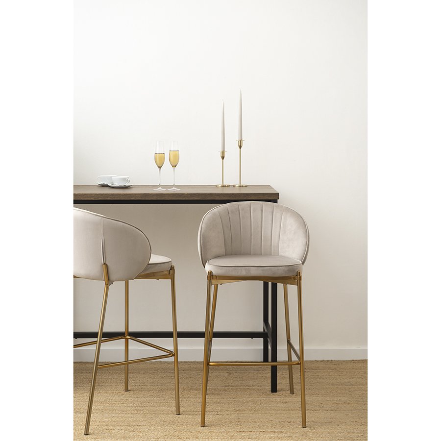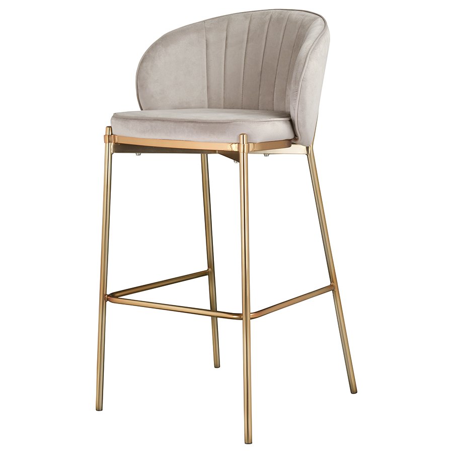 Комфорт во время отдыха на барном стуле создается за счет мягкого сиденья с наполнителем из пенополиуретана и высокой закругленной спинки. Обивка из бархатистого велюра, украшенная декоративной строчкой, придает модели особый шарм. Эстетический потенциал материала настолько высок, что ему сложно найти конкурентов. Помимо презентабельного вида и приятных тактильных ощущений, ткань обладает хорошими эксплуатационными характеристиками, такими как прочность, износоустойчивость и долговечность. Ножки мебели выполнены из железа с гальваническим покрытием, что обеспечивает конструкции надежность и защиту от коррозии.