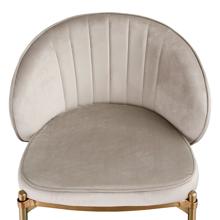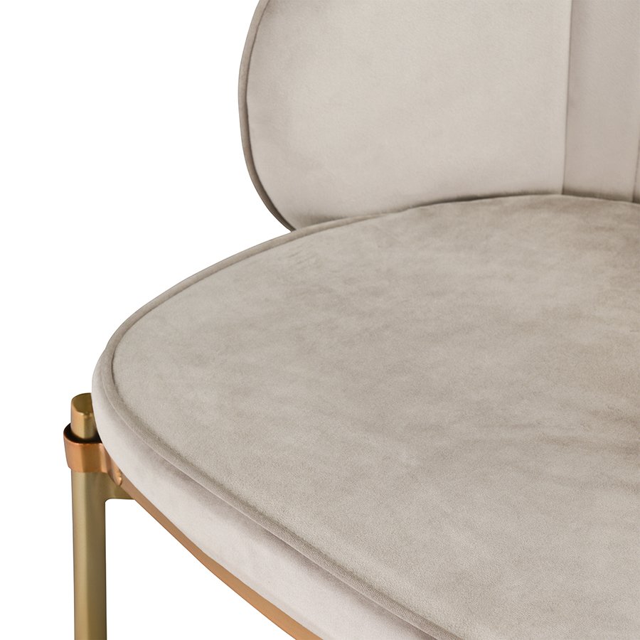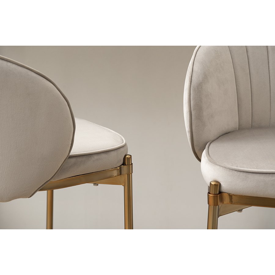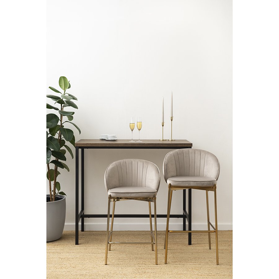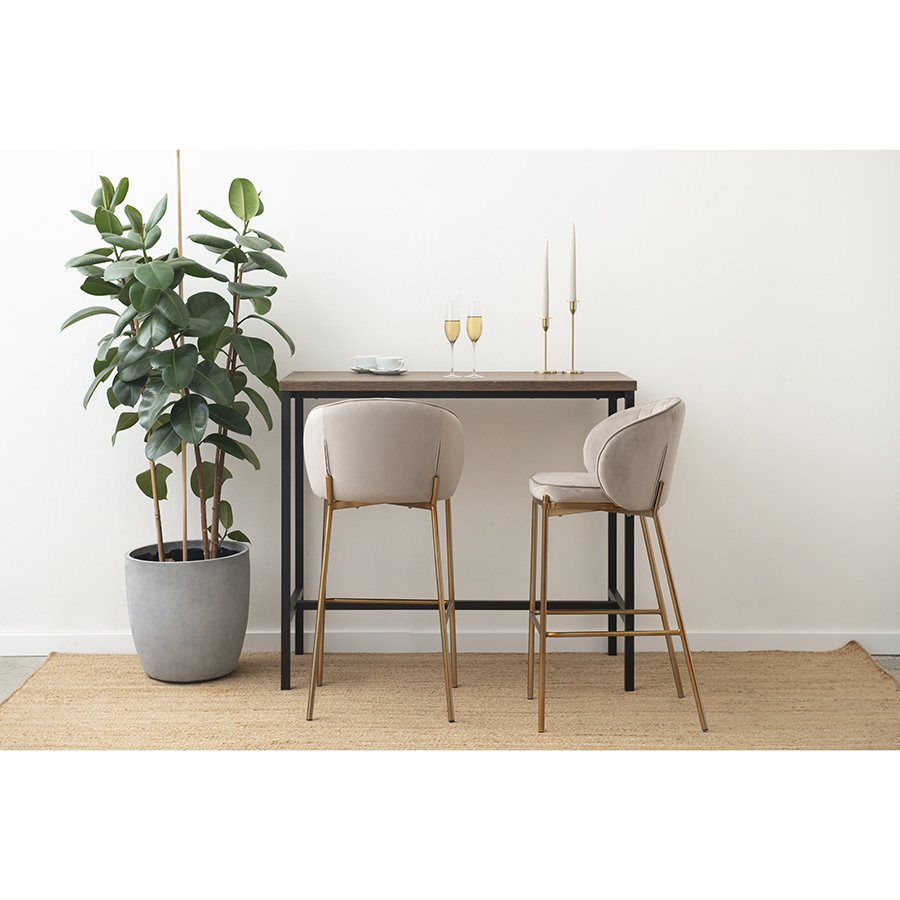 Комфорт во время отдыха на барном стуле создается за счет мягкого сиденья с наполнителем из пенополиуретана и высокой закругленной спинки. Обивка из бархатистого велюра, украшенная декоративной строчкой, придает модели особый шарм. Эстетический потенциал материала настолько высок, что ему сложно найти конкурентов. Помимо презентабельного вида и приятных тактильных ощущений, ткань обладает хорошими эксплуатационными характеристиками, такими как прочность, износоустойчивость и долговечность. Ножки мебели выполнены из железа с гальваническим покрытием, что обеспечивает конструкции надежность и защиту от коррозии.