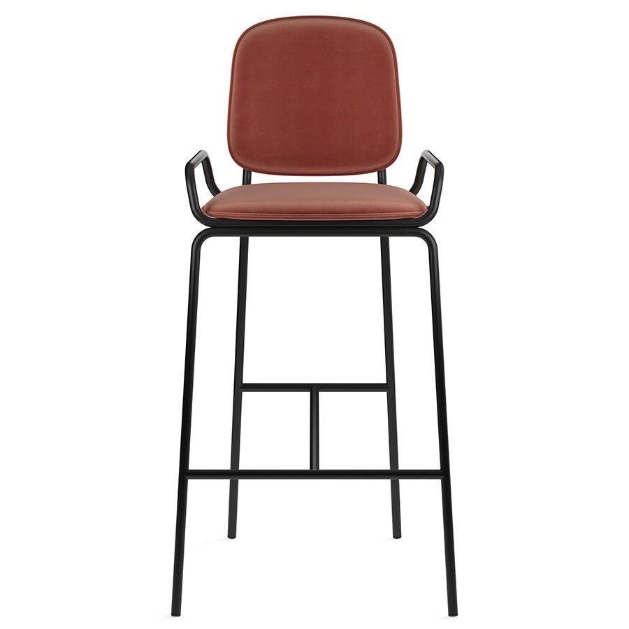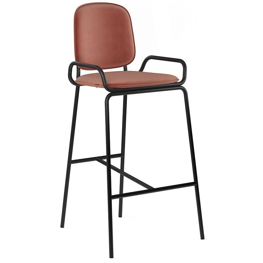 Стул барный Double Frame имеет удобную посадку за счет высокой спинки и широкого основания. Ножки плавно переходят в подлокотники и в нижней части соединяются металлической рамой, которая служит подставкой для ног. Такое дизайнерское решение создает дополнительный комфорт во время сидения.