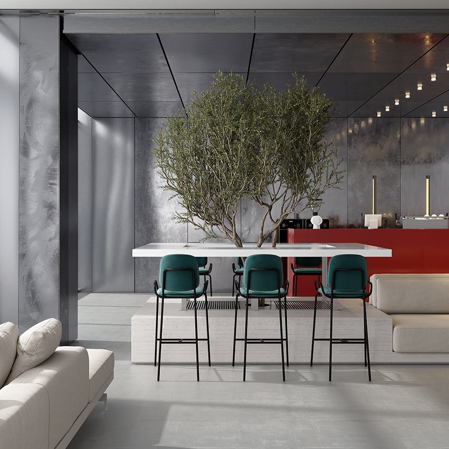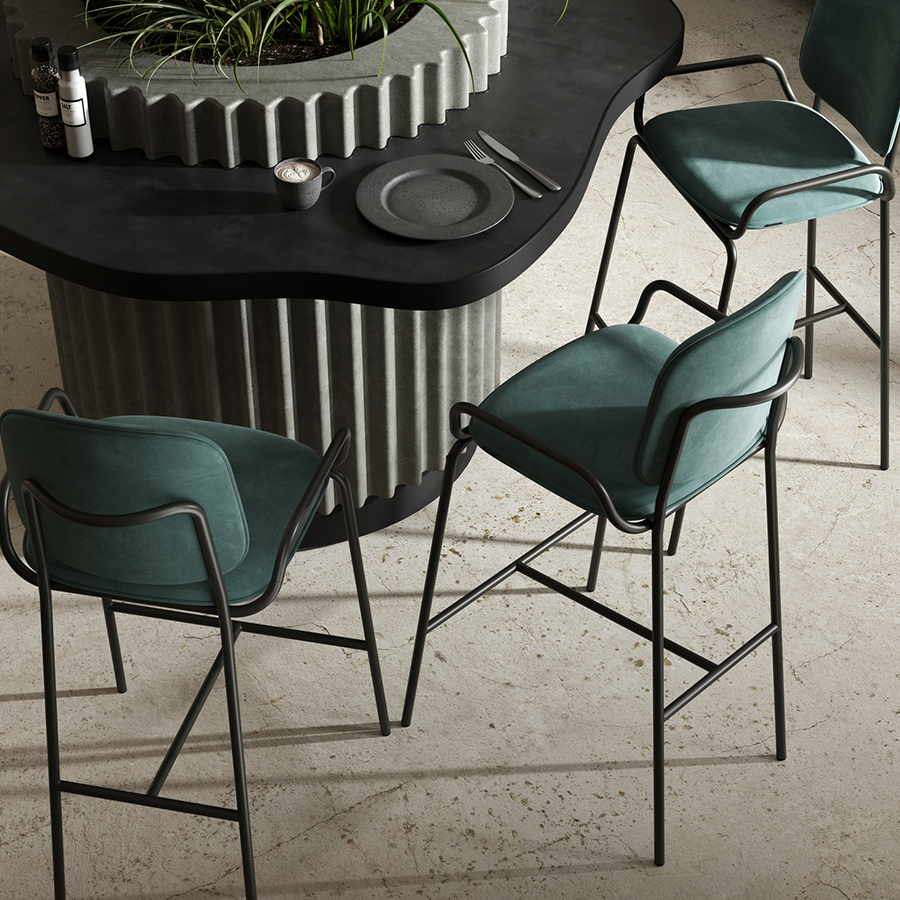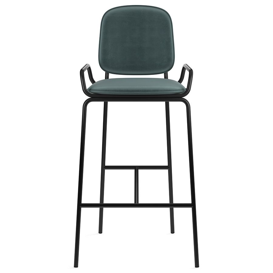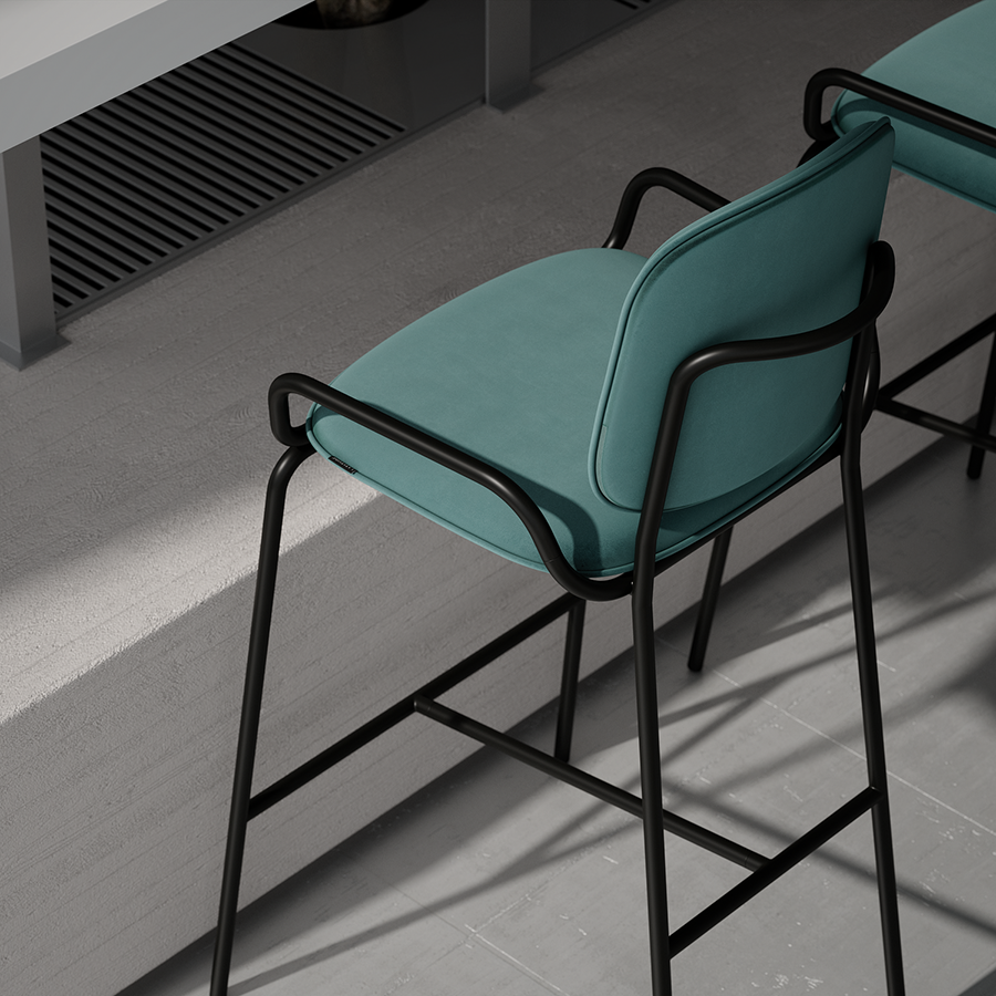 Стул барный Double Frame имеет удобную посадку за счет высокой спинки и широкого основания. Ножки плавно переходят в подлокотники и в нижней части соединяются металлической рамой, которая служит подставкой для ног. Такое дизайнерское решение создает дополнительный комфорт во время сидения.