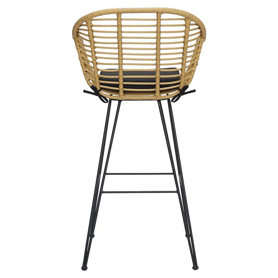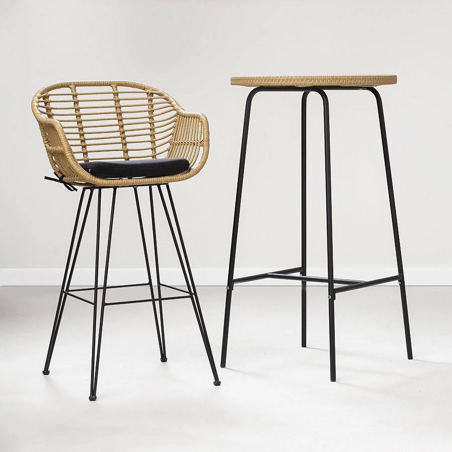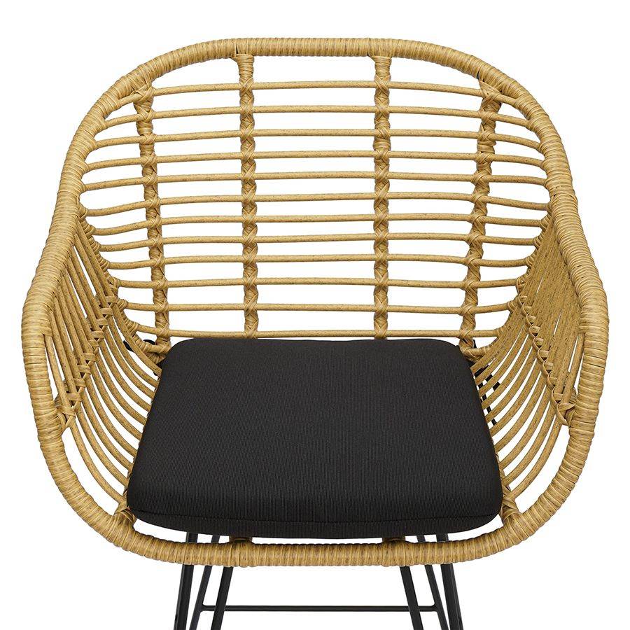 Стул имеет прочный стальной каркас и устойчивые ножки. Порошковое покрытие защищает металлические элементы от коррозии, гарантируя конструкции привлекательный вид на долгие годы. Сиденье необычной округлой формы выполнено из ротанга и дополнено мягкой подушкой с чехлом из водоотталкивающей ткани толщиной 4 см, которая обеспечивает максимально удобное расположение. Предусмотрена специальная перекладина для удобного размещения ног. Дизайн модели идеально вписывается в такие стилевые решения, как эко, кантри и прованс.