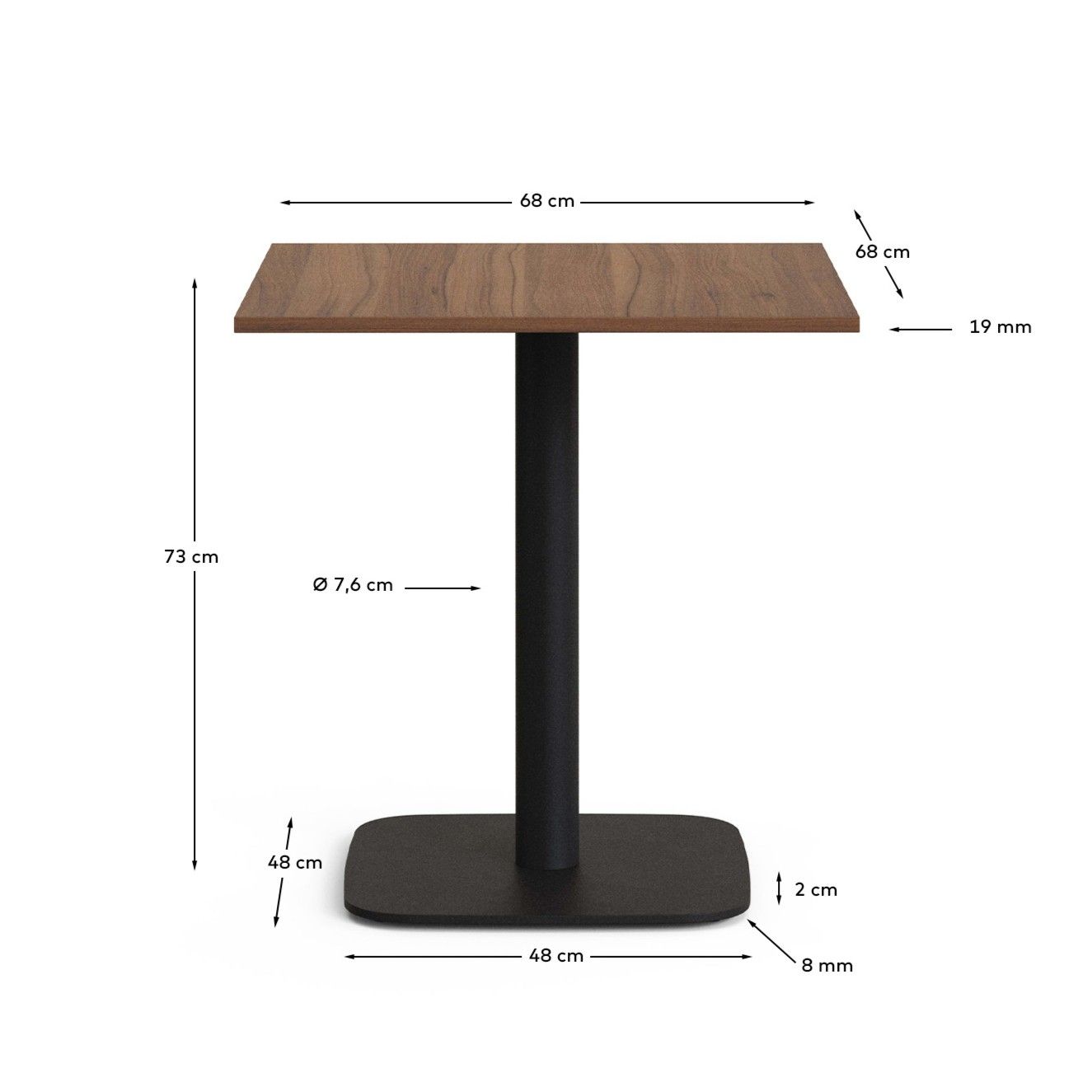 Стол с меламиновой столешницей, толщиной 19 мм. Железная ножка, окрашенная в матовый черный цвет. Подходит для внутренних помещений.