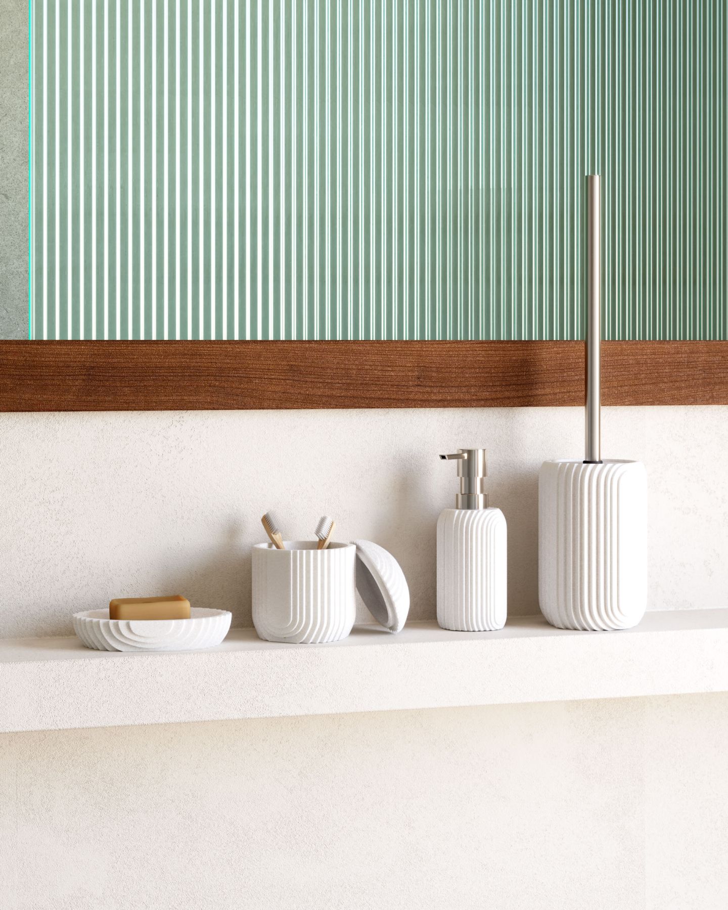 Набор аксессуаров для ванной Ateneas от фабрики La Forma (ex Julia Grup) – имитация гипса с рифленой фактурой.